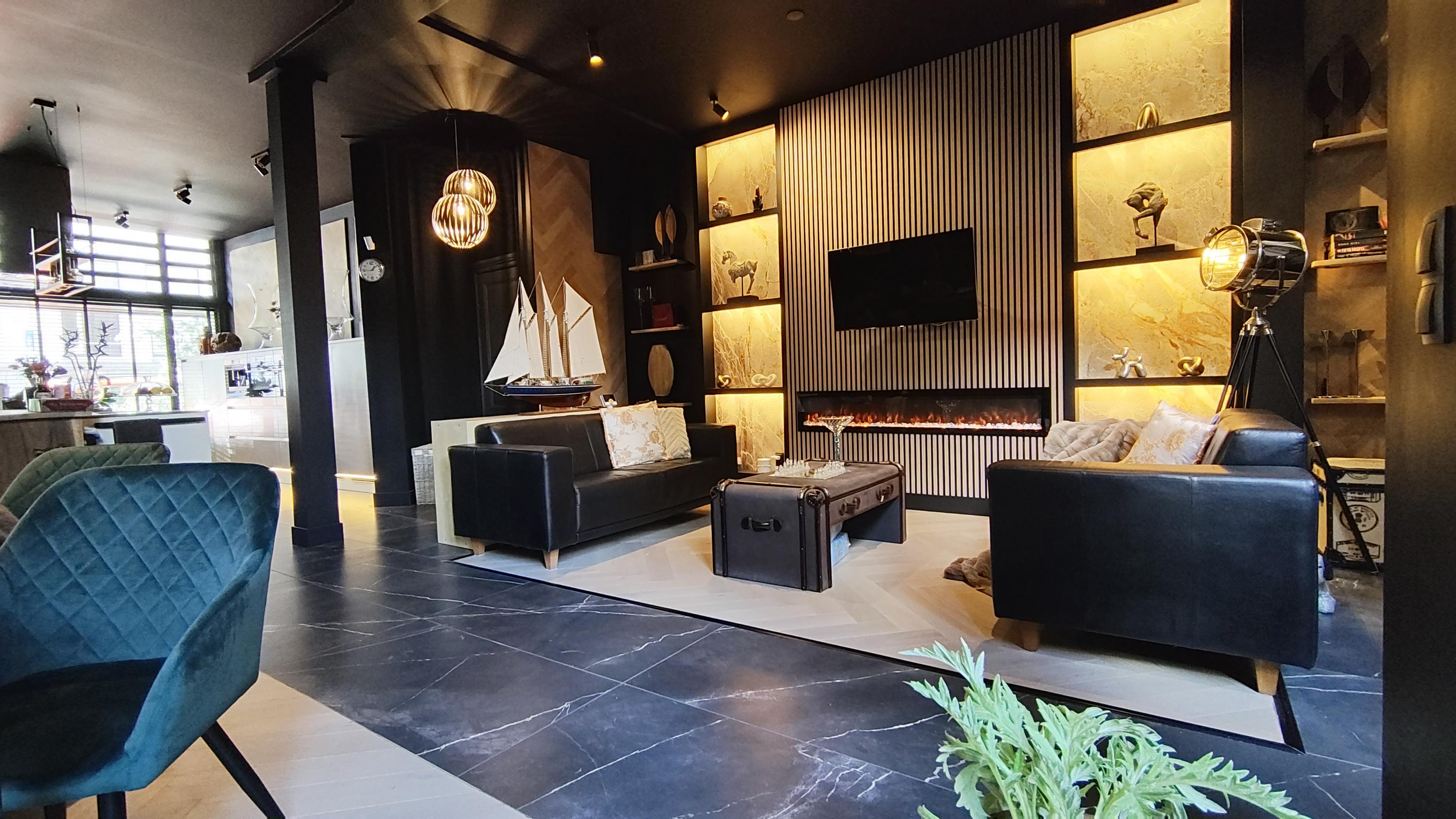 The spacious entrance hall leads into an impressive open-plan kitchen with an island of over four meters long and a wall of appliances that will delight even the most demanding culinary enthusiast. Double ovens, refrigerators, dishwashers, a built-in coffee machine, and Quooker make this kitchen the vibrant heart of the home.