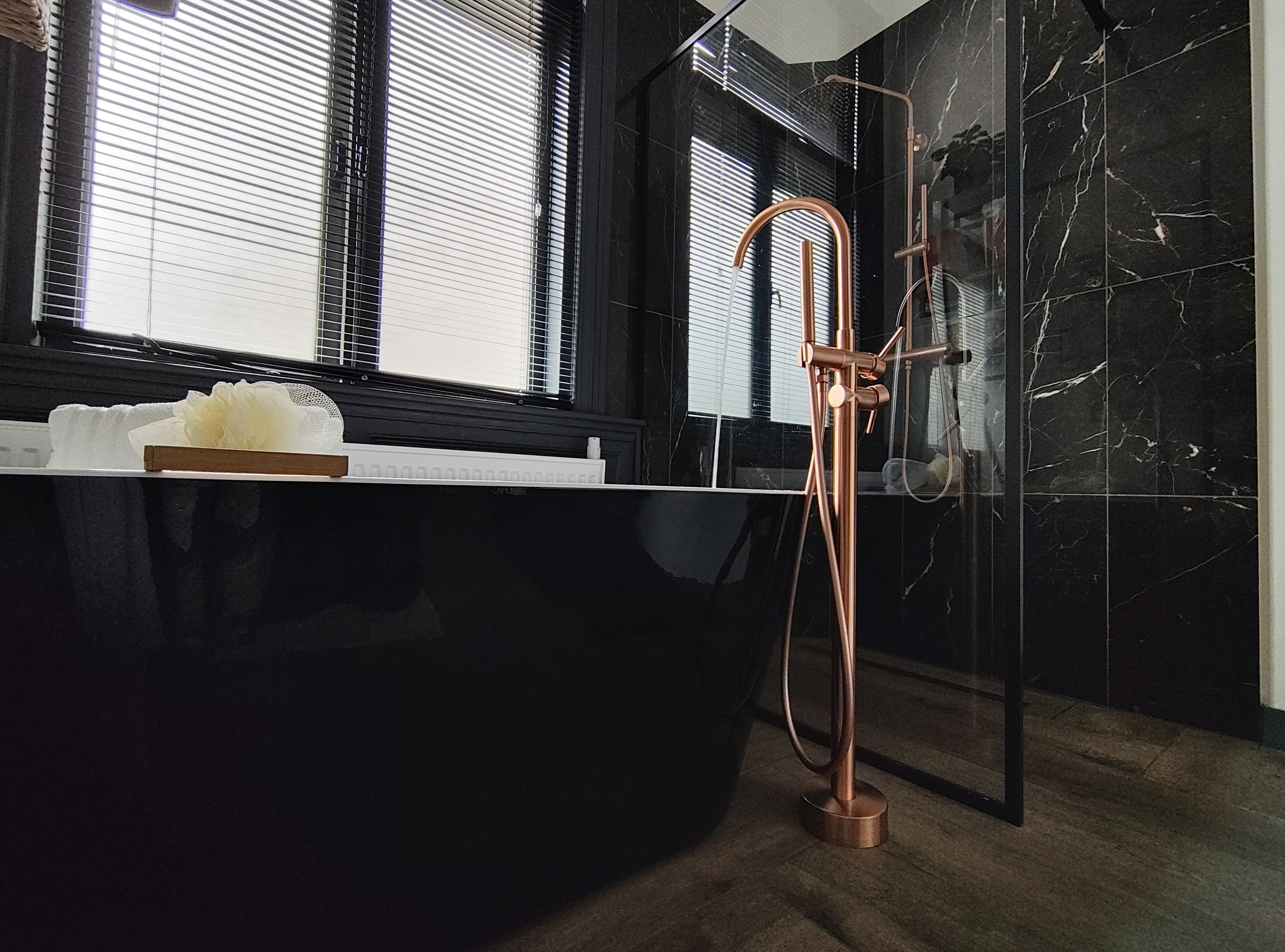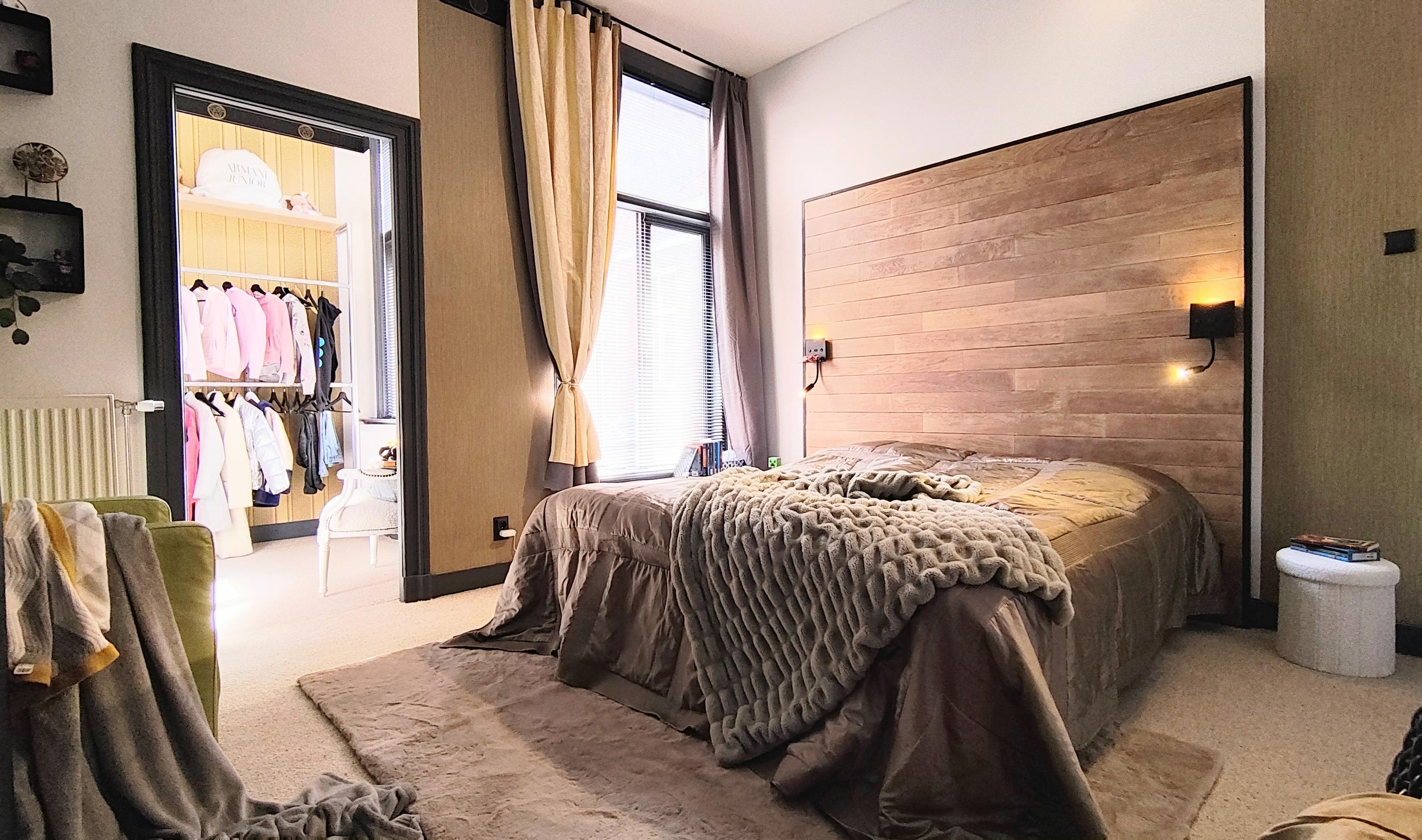 The master bedroom exudes grandeur, with mahogany parquet flooring, elegant period details, and direct access to the garden. A second room on this level – currently used as a study – also opens onto the garden through French doors. Both luxurious bathrooms are fitted with a freestanding bathtub, walk-in rain shower, and double sinks, finished with high-end materials and chic herringbone floor tiles.