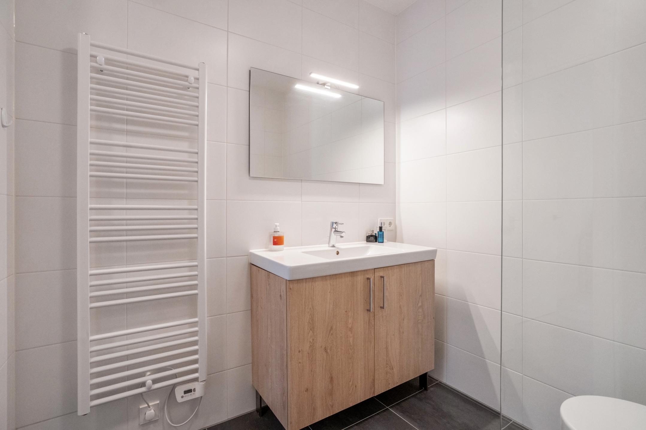 A door in the living room leads you to the hallway with a deep closet that offers plenty of storage space and houses the technical installations out of sight. A modern bathroom, the smaller of the two, with a tiled floor, deep walk-in shower, vanity unit, and toilet.