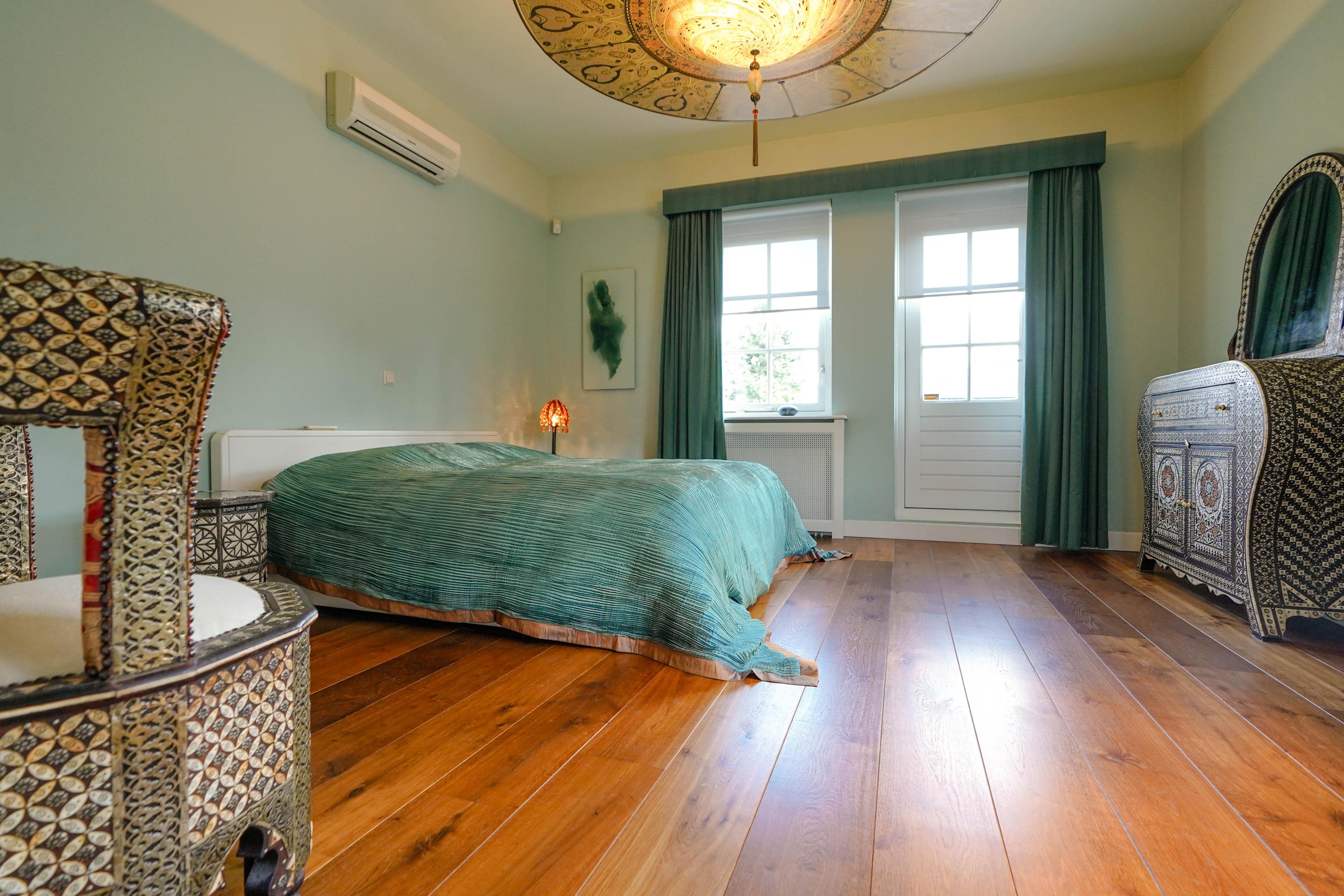 Aan de ruim bemeten overloop op de eerste verdieping bevinden zich de toegangsdeuren voor alle ruimten. De plafondhoogte op deze etage is overal 2,9 meter. Op de overloop en in alle vertrekken van de eerste verdieping zijn de betonnen vloeren voorzien van massief houten vloerdelen (m.u.v. badkamer en toilet).