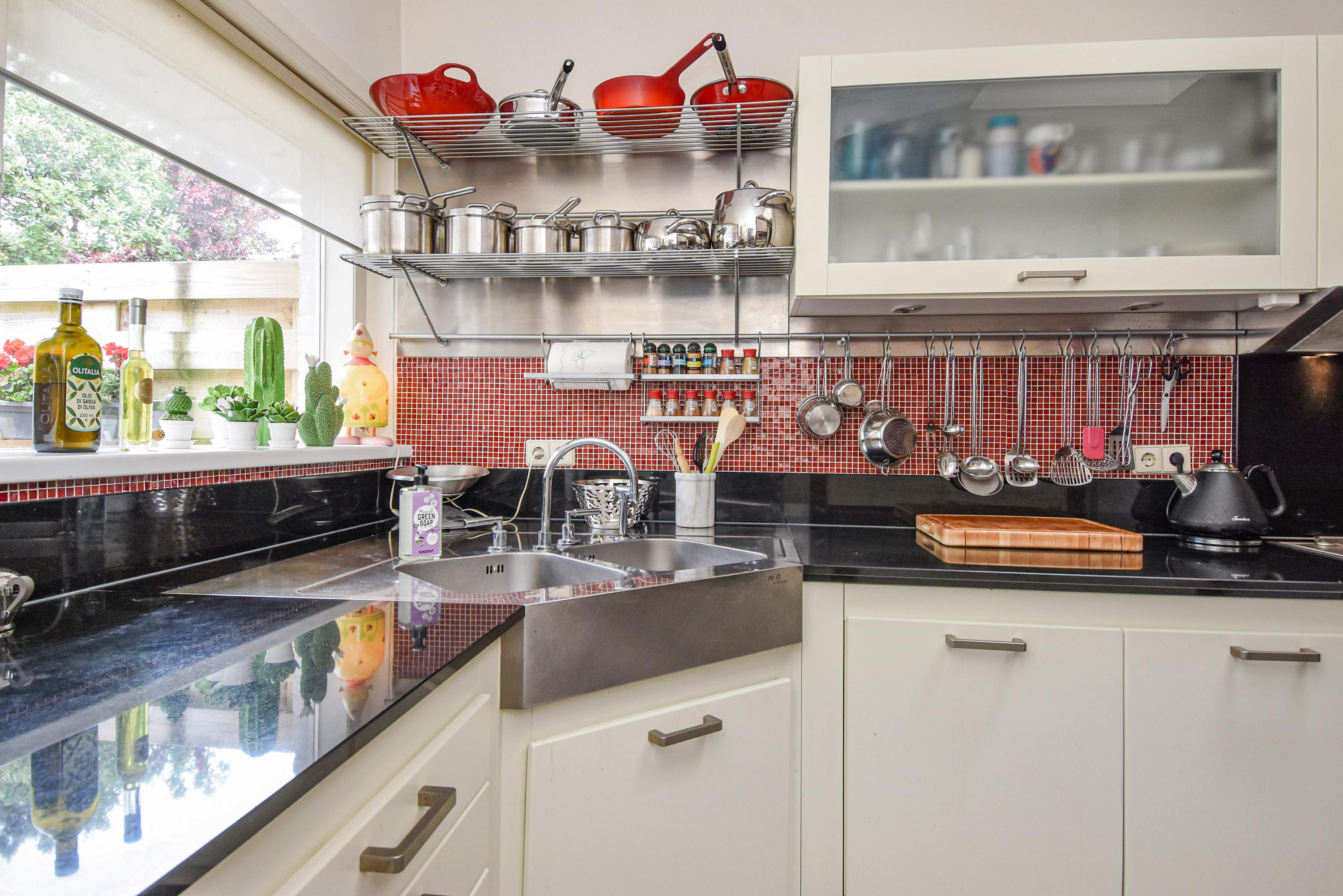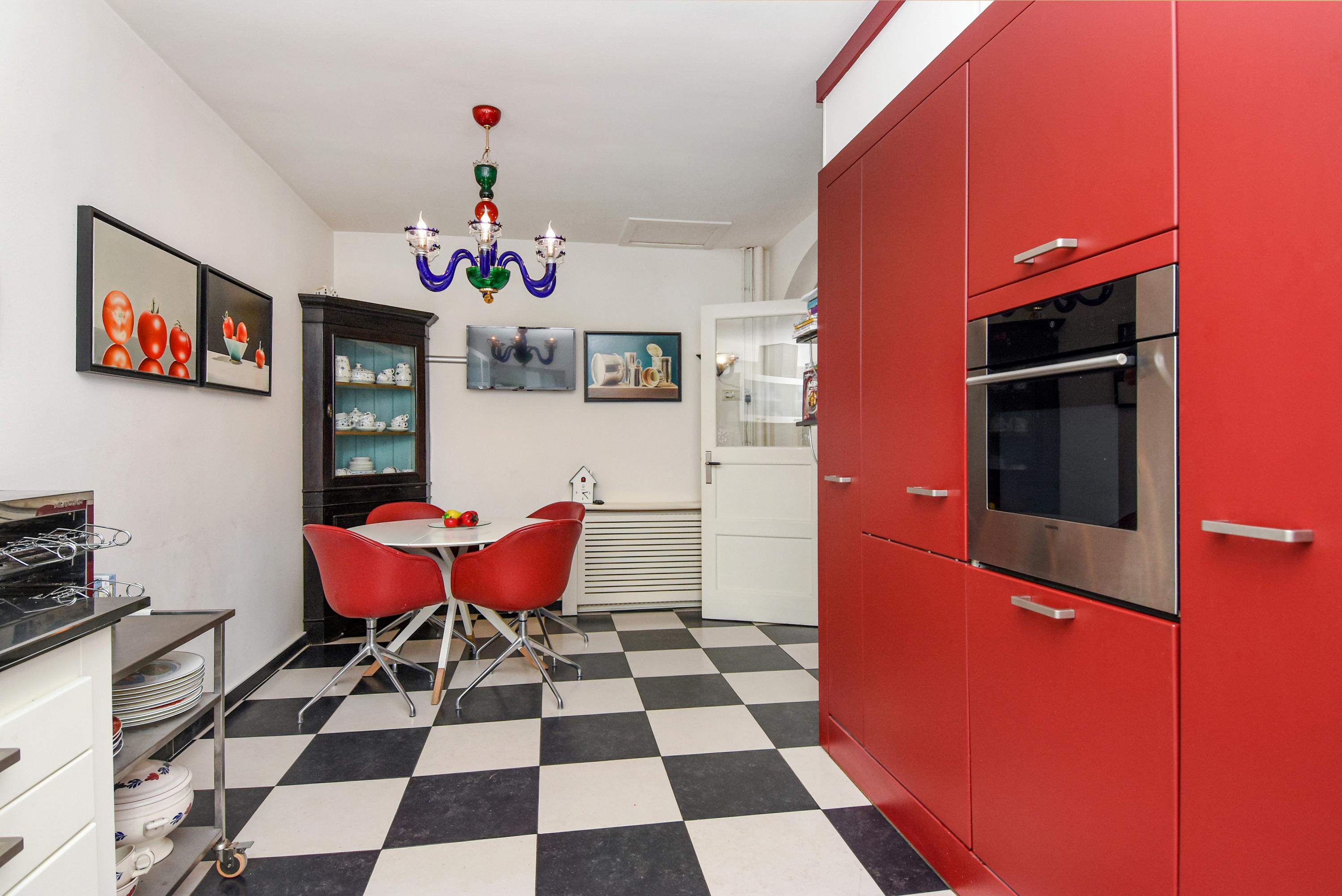 The spacious kitchen, illuminated by a skylight, has a black and white tiled floor and ample storage space including a separate cupboard housing the central heating unit. Built-in appliances include an oven, fridge, and freezer; above the five-burner gas stovetop and grill plate set in the stylish stone countertop is a wide extractor fan.