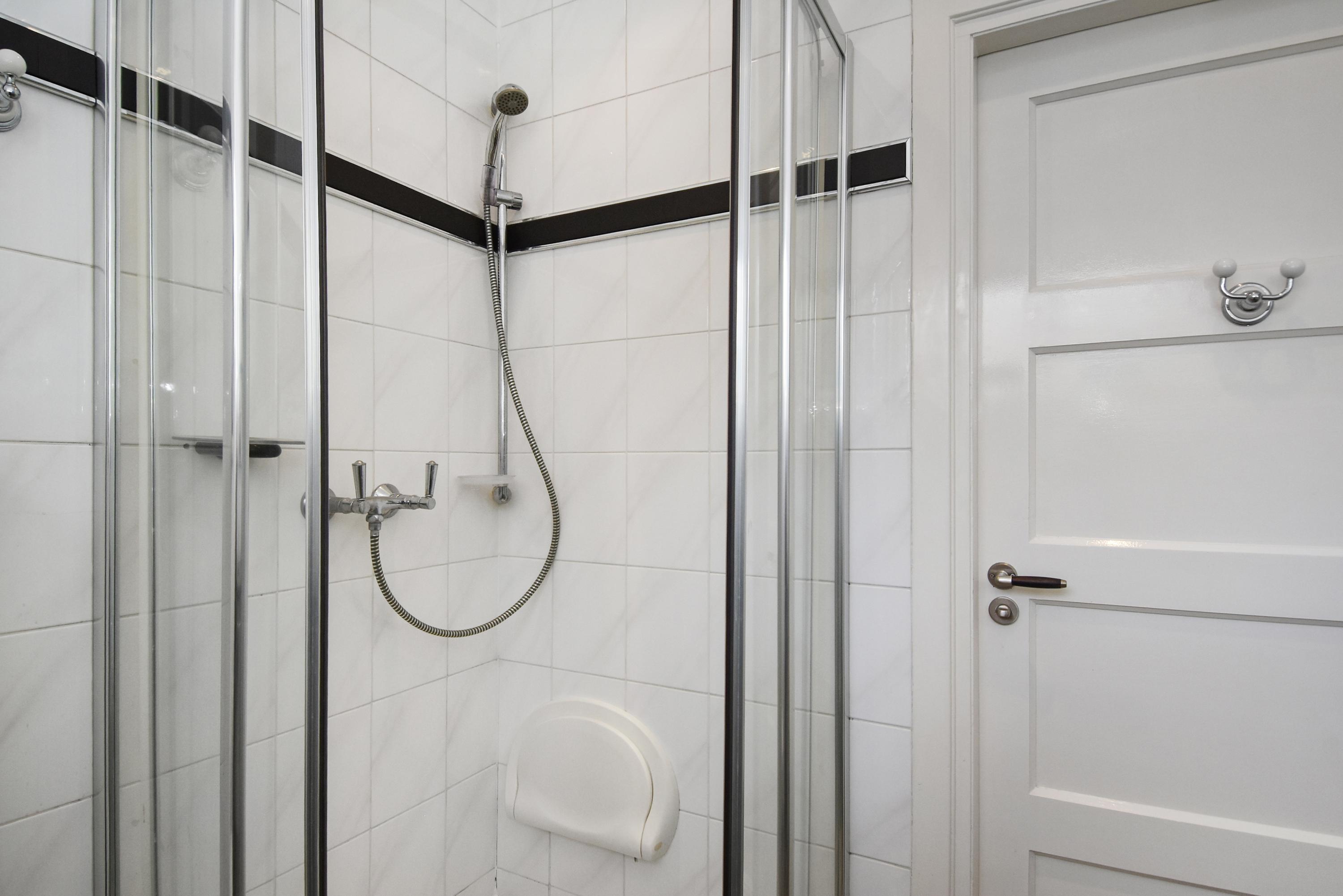 A hallway leads to the three bedrooms with windows to the backgarden. Vestibule with double doors to the back garden. Through a small passage with fitted cupboards and a separate electric boiler is the first bathroom, with a walk-in shower, wide washbasin, and toilet. A second bathroom is similarly outfitted with a shower, washbasin, and toilet.