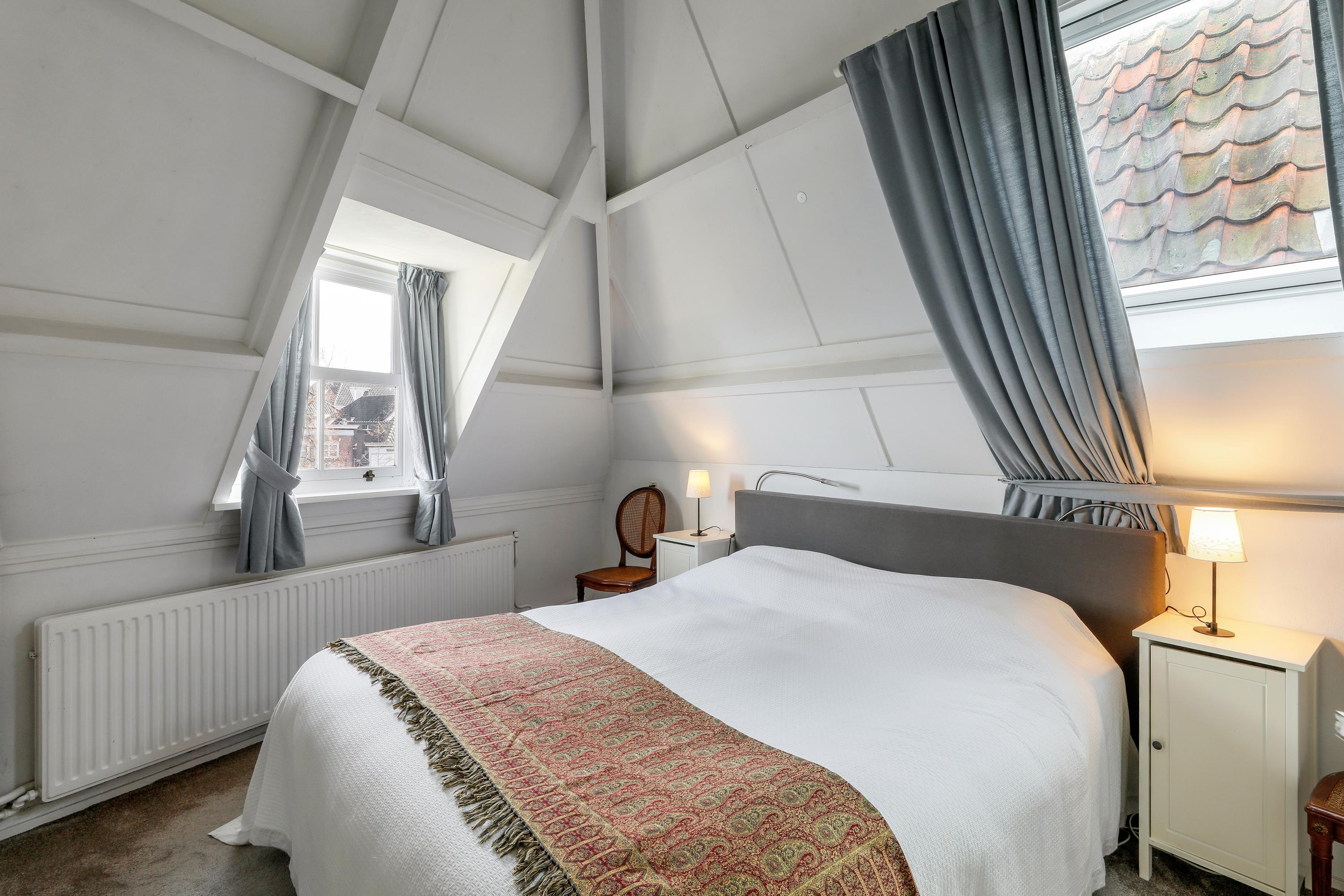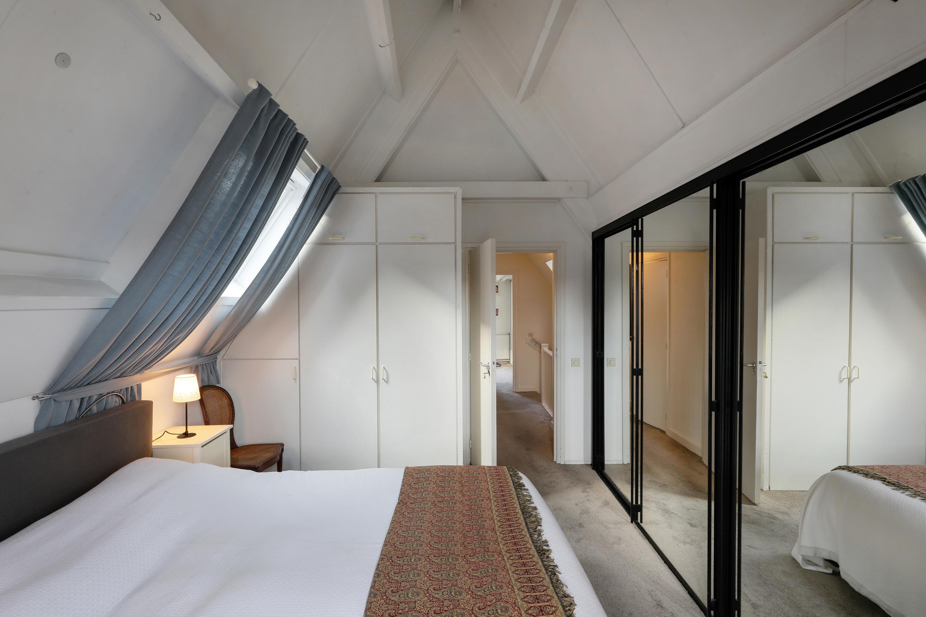 The upper floor features two bedrooms. The main bedroom is located at the front under the roof and has a charming atmosphere thanks to the high ceiling and dormer window. The second bedroom is also spacious and versatile.