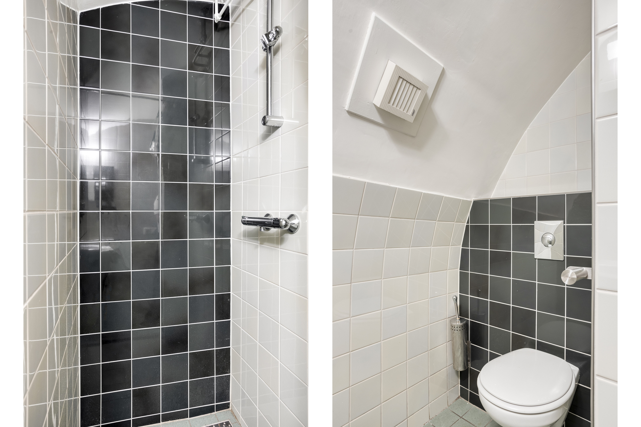 On the top floor are two additional spacious bedrooms, both extended with dormer windows. This floor also includes a separate toilet and a third bathroom equipped with electric underfloor heating, a bathtub/shower combination, washbasin, and washing machine connection. A pull-down ladder in the hallway provides access to the spacious attic, where the central heating boiler is located, along with a hatch for roof access and maintenance.