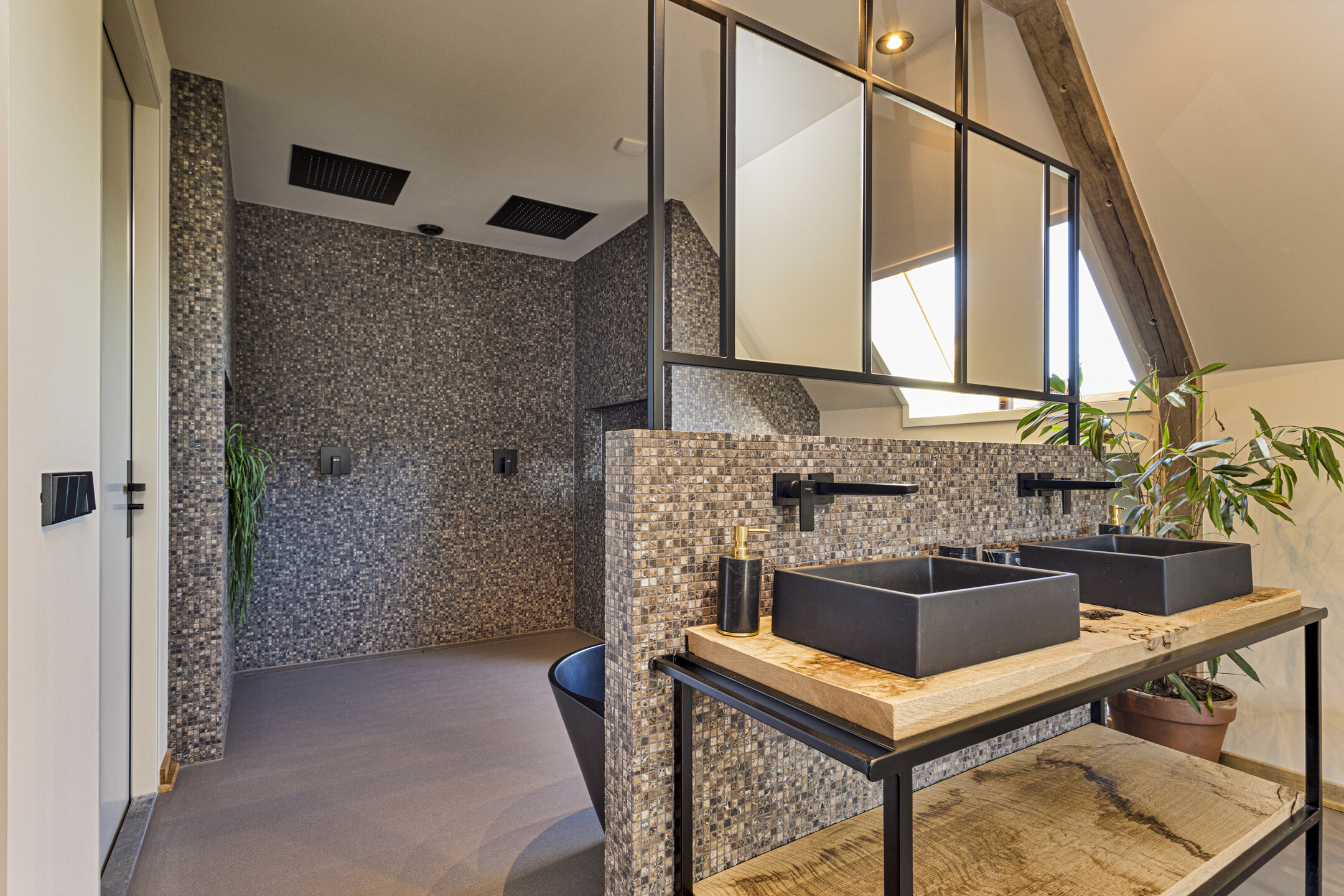 The master bedroom is accessed through the bathroom: with the allure of an exclusive resort, it features a double shower with rain shower, a freestanding bathtub overlooking the garden, and a large double sink.