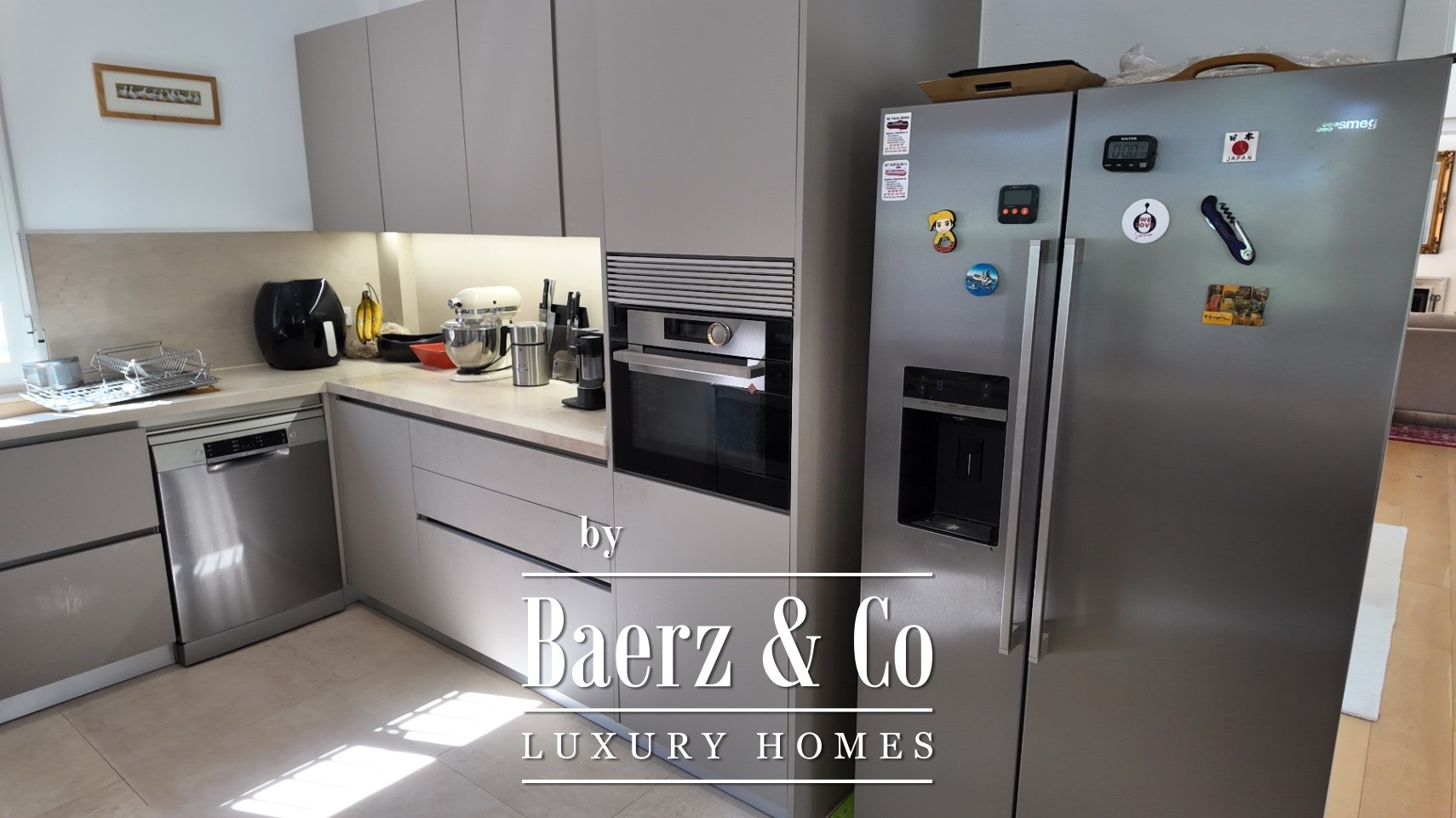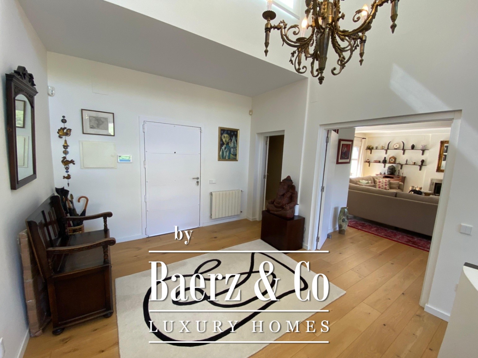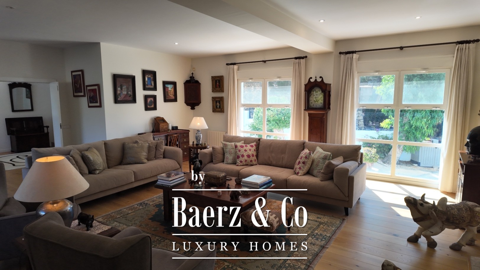 Landscaped grounds are designed for effortless enjoyment, featuring a saltwater pool with pre-installed heating, spacious terraces, and a fully equipped summer kitchen. A double garage, air conditioning, central gas heating, solar panels with batteries, Scandinavian oak flooring, security features, and water softening systems contribute to both comfort and efficiency.