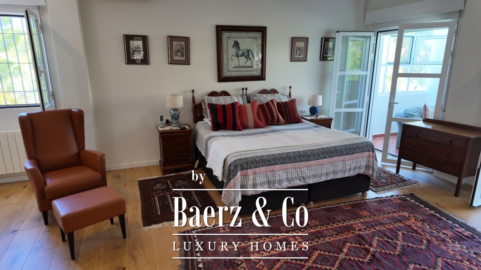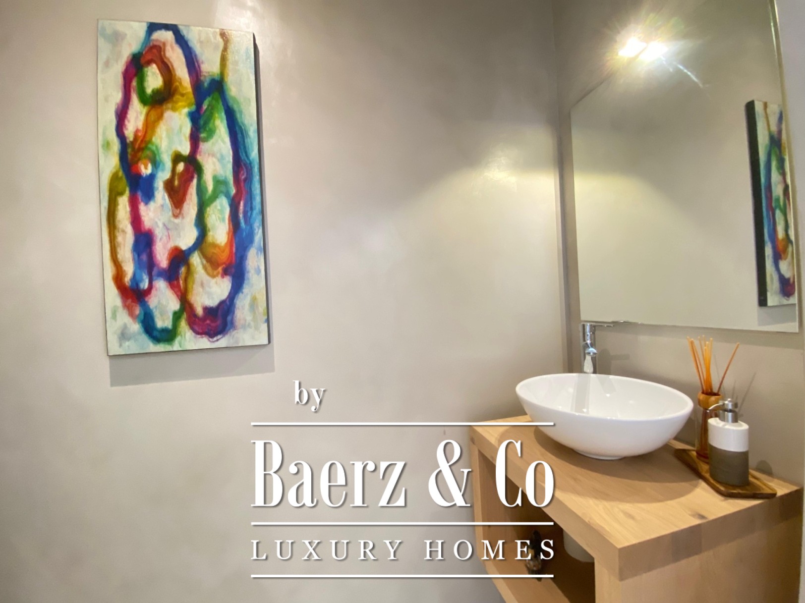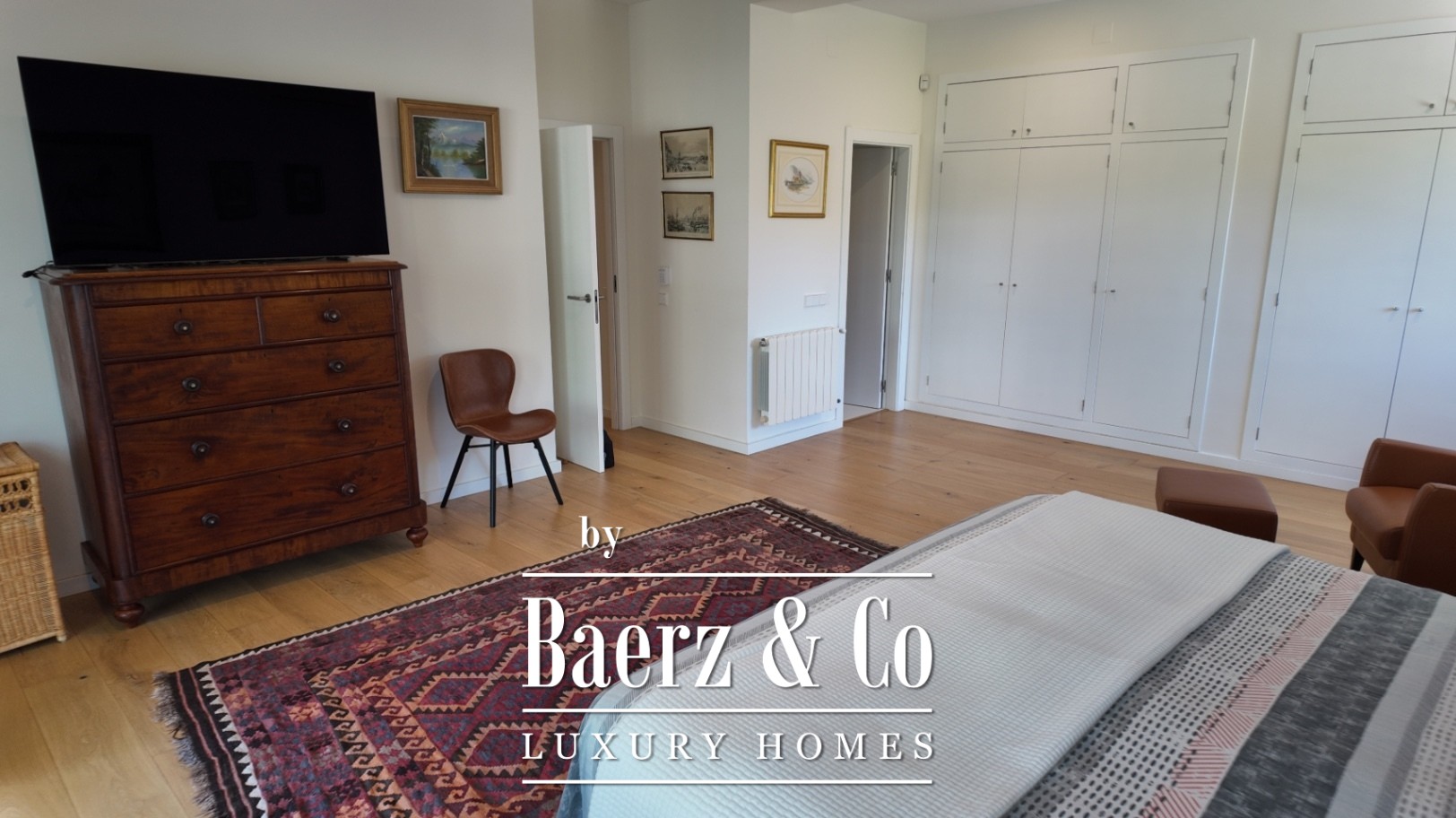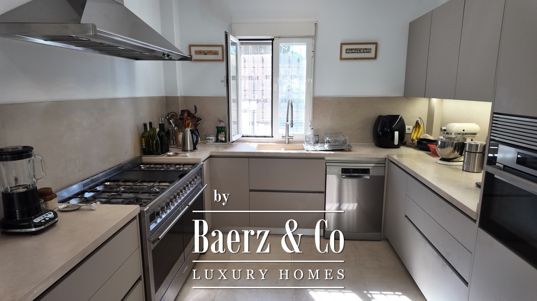 Landscaped grounds are designed for effortless enjoyment, featuring a saltwater pool with pre-installed heating, spacious terraces, and a fully equipped summer kitchen. A double garage, air conditioning, central gas heating, solar panels with batteries, Scandinavian oak flooring, security features, and water softening systems contribute to both comfort and efficiency.