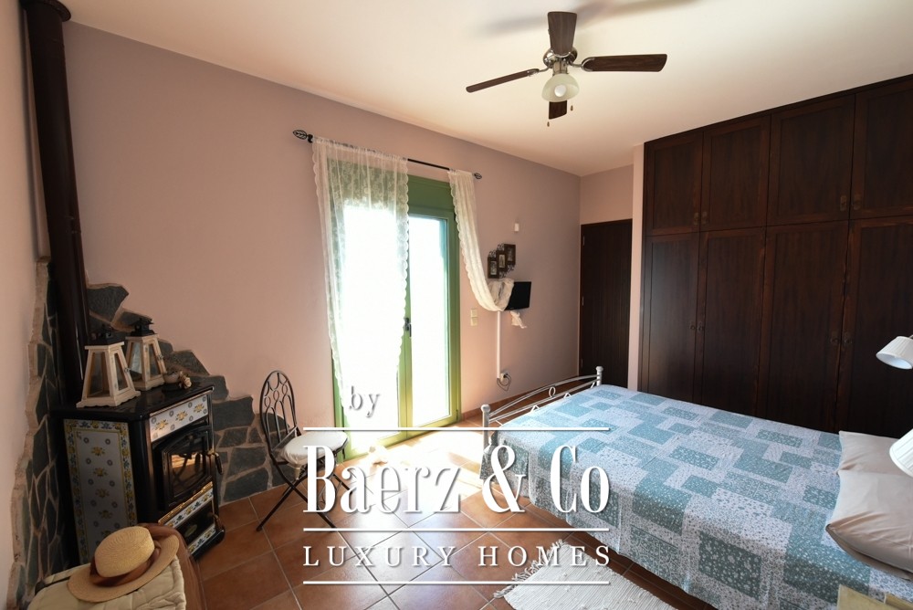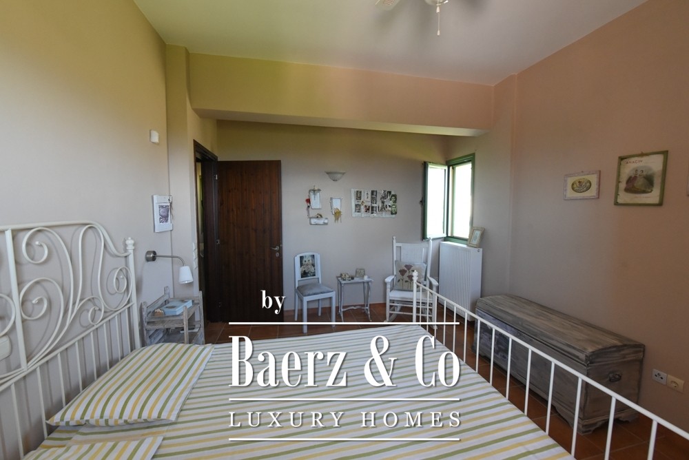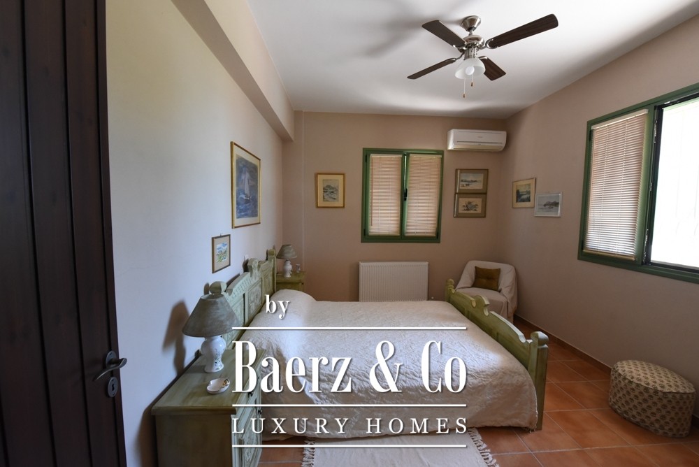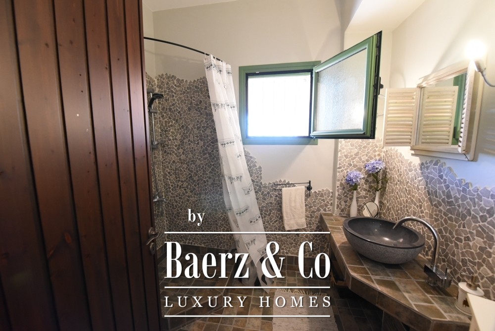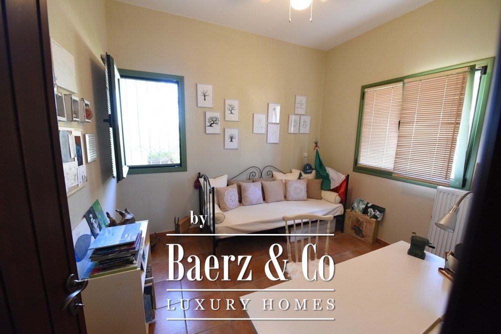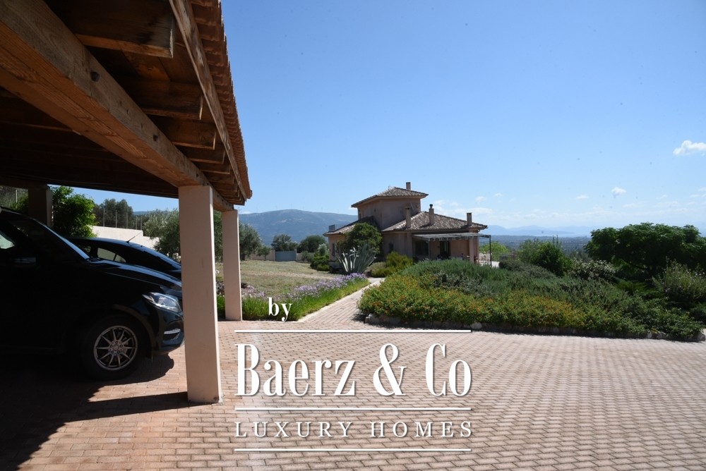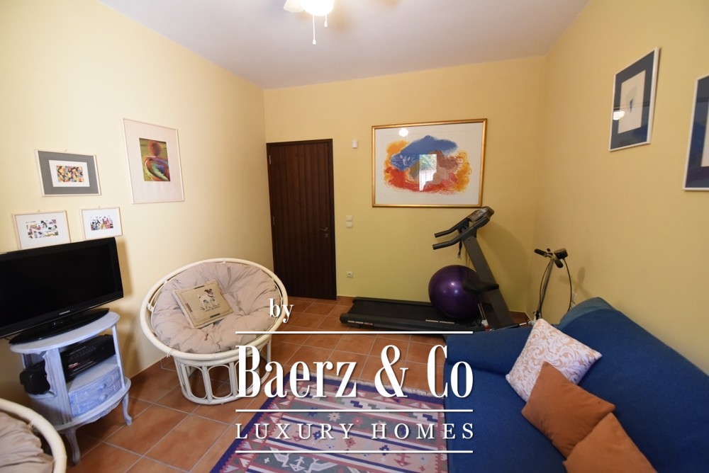 Covered parking for four cars, a mechanical room, and an external structure with guest house potential add to the versatility and privacy. Two gated entrances with electric garage doors assure discreet access. Offered fully furnished and meticulously maintained since its 2011 construction, this villa represents a rare opportunity to acquire an exceptional property in Amarynthos—one where privacy, light, and timeless design are perfectly balanced.