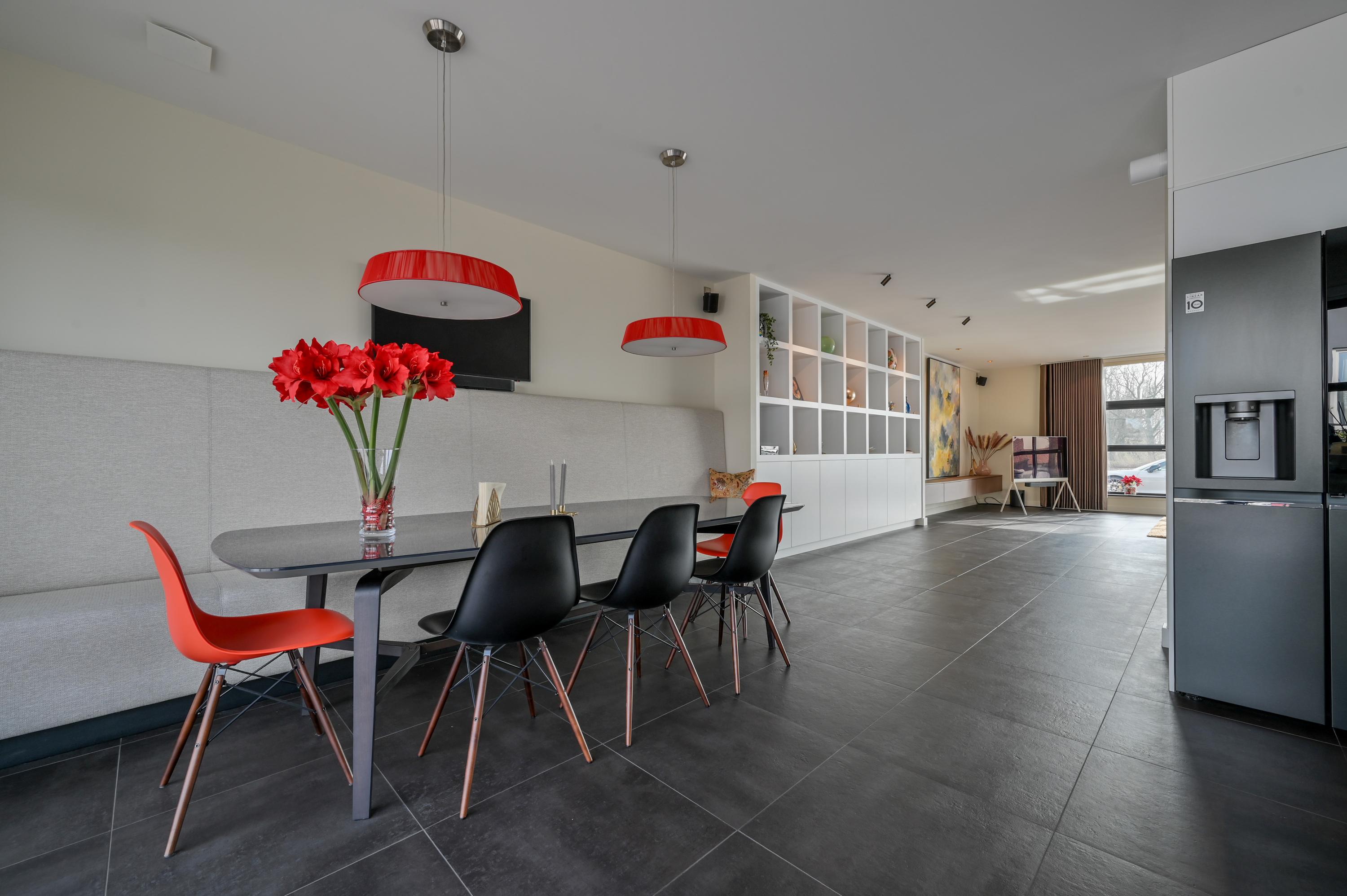 At the rear of the home, you will find the generous and luxurious open-plan kitchen, designed for both cooking and living. The kitchen features a central island with sink, a Quooker, dishwasher, combi ovens, induction hob with extractor, a large LG refrigerator with freezer and ice maker, a Liebherr wine climate cabinet, and extensive storage space. A built-in bench at the large dining table creates a cozy seating area, while double French doors provide access to the spacious terrace garden, where light, space, and tranquility come together.