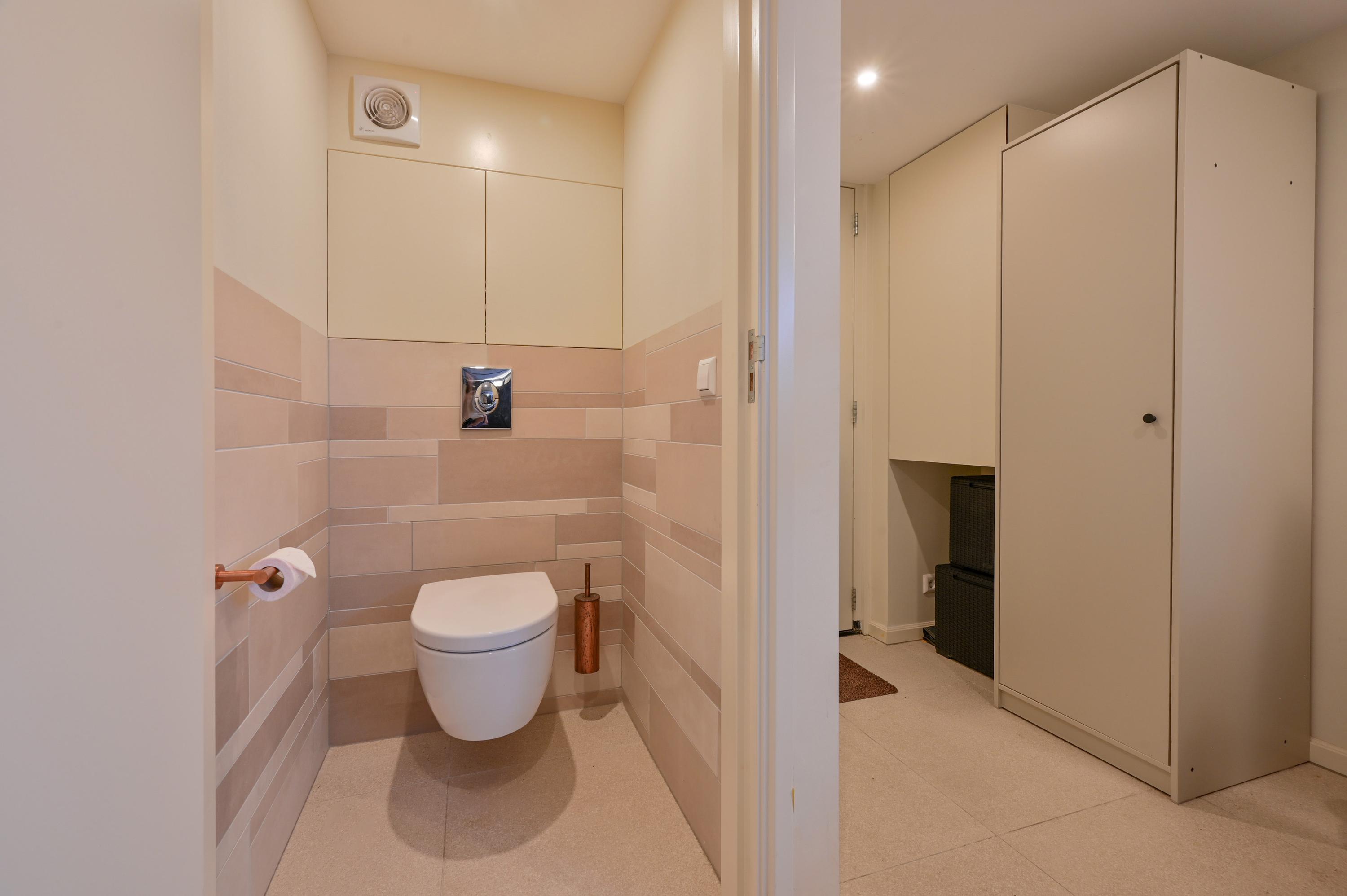 Via the driveway, you reach the front door and the spacious entrance hall, which features a wardrobe, toilet, and staircase to the upper floor. The living room is located at the front of the house and offers breathtaking views over the Amstel. Large windows allow an abundance of natural light to flood in, while the motorized curtains can be operated via an app. Luxaflex Silhouette blinds (motorized, with memory function) are also installed here. The stylish black tiled floor with underfloor heating, built-in dimmable Modular spotlights, and large custom-designed cabinets complete the space.