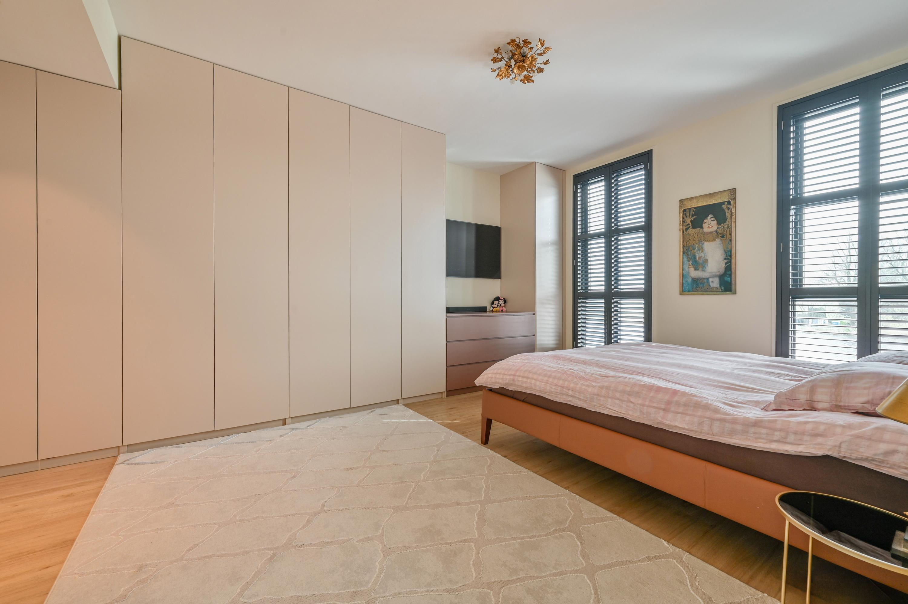 The staircase in the hall leads to the first floor, where four generously sized bedrooms are located. The two bedrooms at the rear are connected by an open passage and share a private bathroom with a toilet, large washbasin, modern shower, and towel radiator. As throughout the home, air conditioning is installed here for year-round comfort.