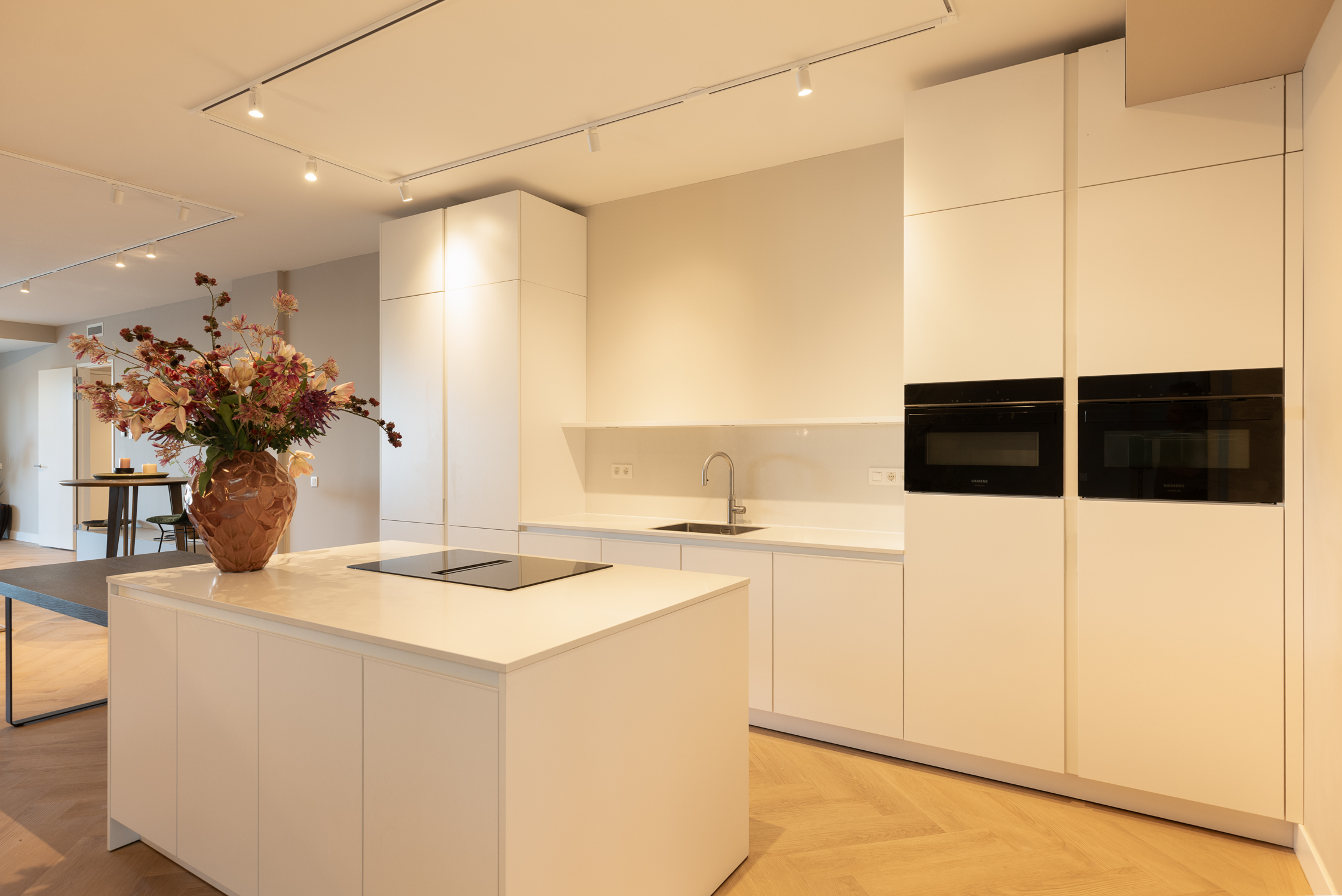 A vast living area of nearly 90 m² integrates a custom-designed lounge, elegant dining zone, and modern open kitchen equipped with premium appliances and a generous island. Light flows in through expansive windows, connecting the living spaces to a private garden at the front and a wide terrace stretching the full width of the apartment at the rear.