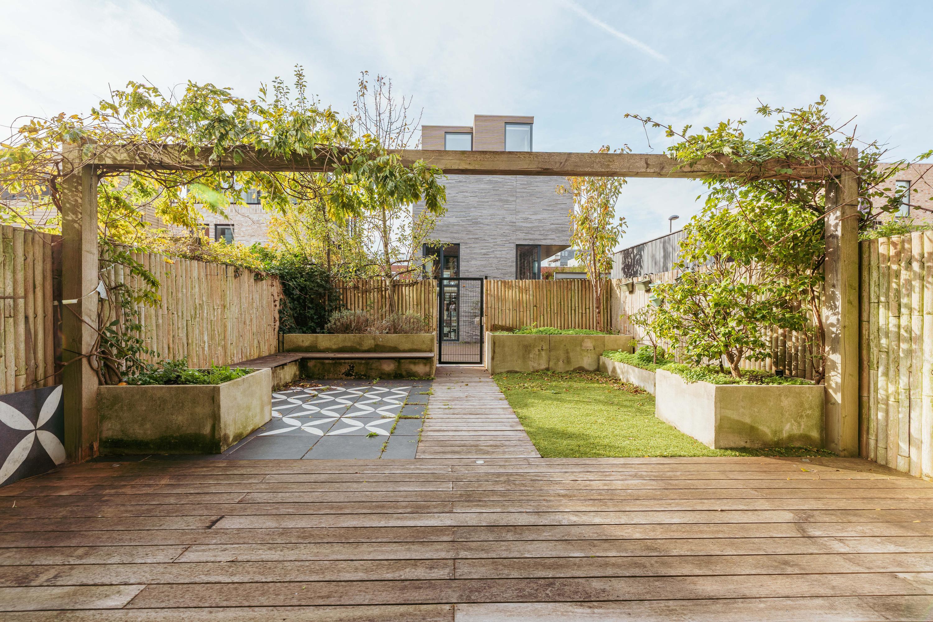 The custom-designed kitchen features a large cooking island with a composite worktop and premium built-in appliances, including a Quooker, induction cooktop, dishwasher, microwave, oven, and plate warmer. French doors open onto the beautifully landscaped, low-maintenance garden of approximately 54 m², with wooden decking, stone paving, and lush greenery. A private gate provides direct access to the back area with two private parking spaces equipped with an electric charging station.