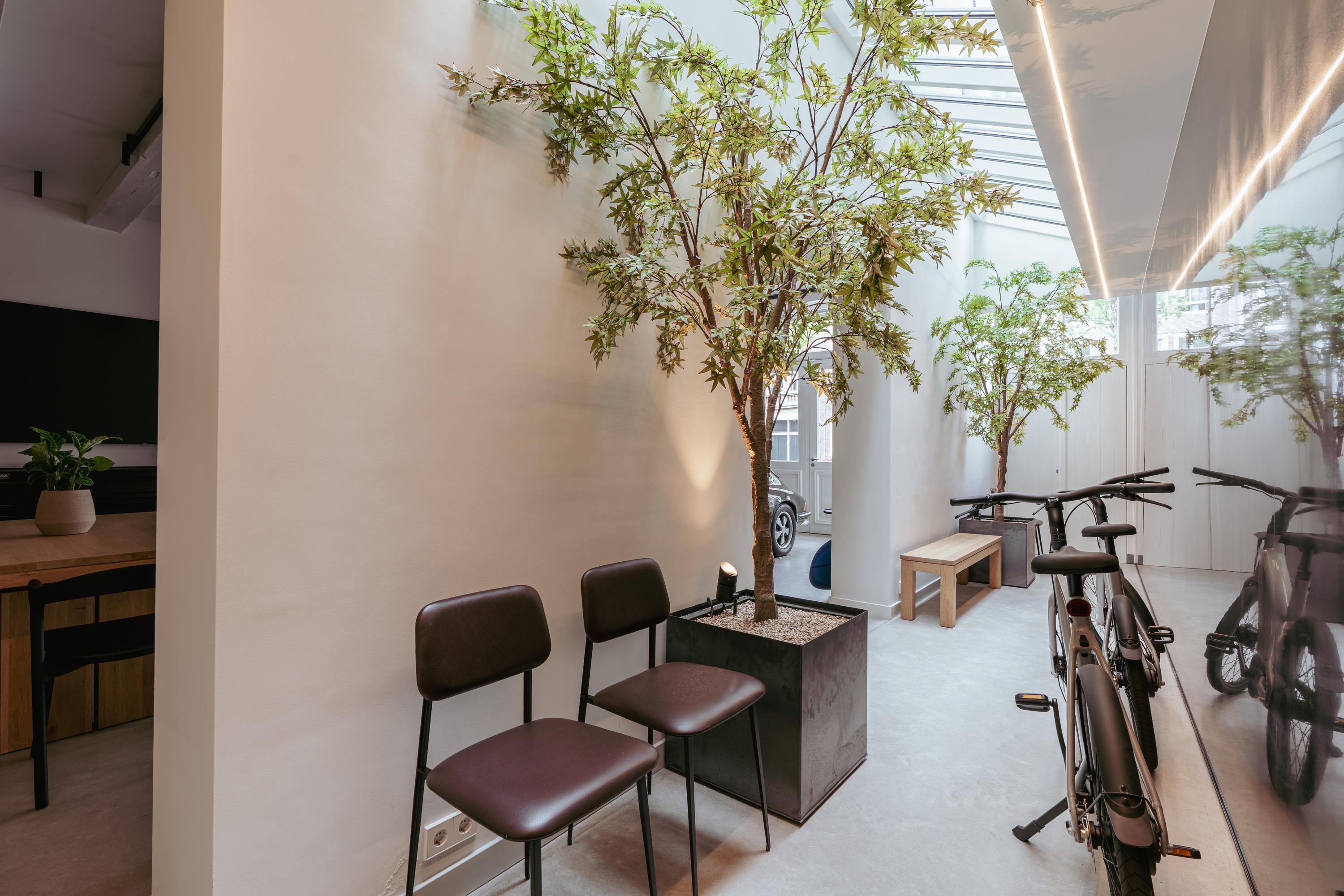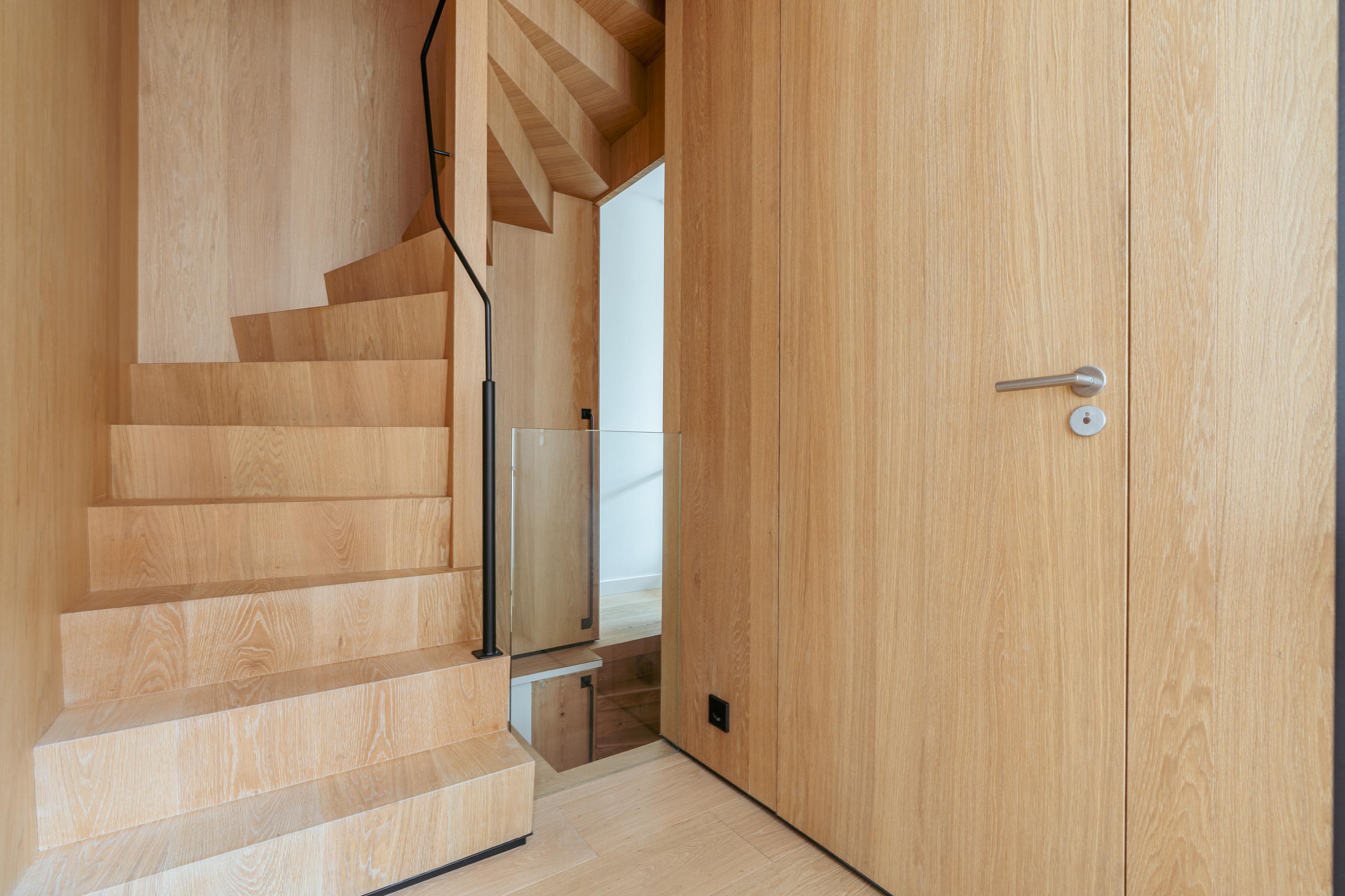 The entrance provides access to both the residence and the multifunctional commercial space on the ground floor. This space is finished with great attention to detail, exuding character through wooden elements, exposed ceiling beams, and high-quality materials. Large double doors at the front can be fully opened, creating an inviting look and allowing for ample natural light. Inside, the space is practical yet stylishly arranged. A compact but luxuriously finished kitchenette, a neat toilet, and a separate laundry and technical room complete this floor. A large skylight at the rear brings in abundant daylight, adding to the open and airy feel. Rear access to a private outdoor space is available, as well as a second entrance directly from the street — providing flexibility for use as a studio, home office, or practice space.