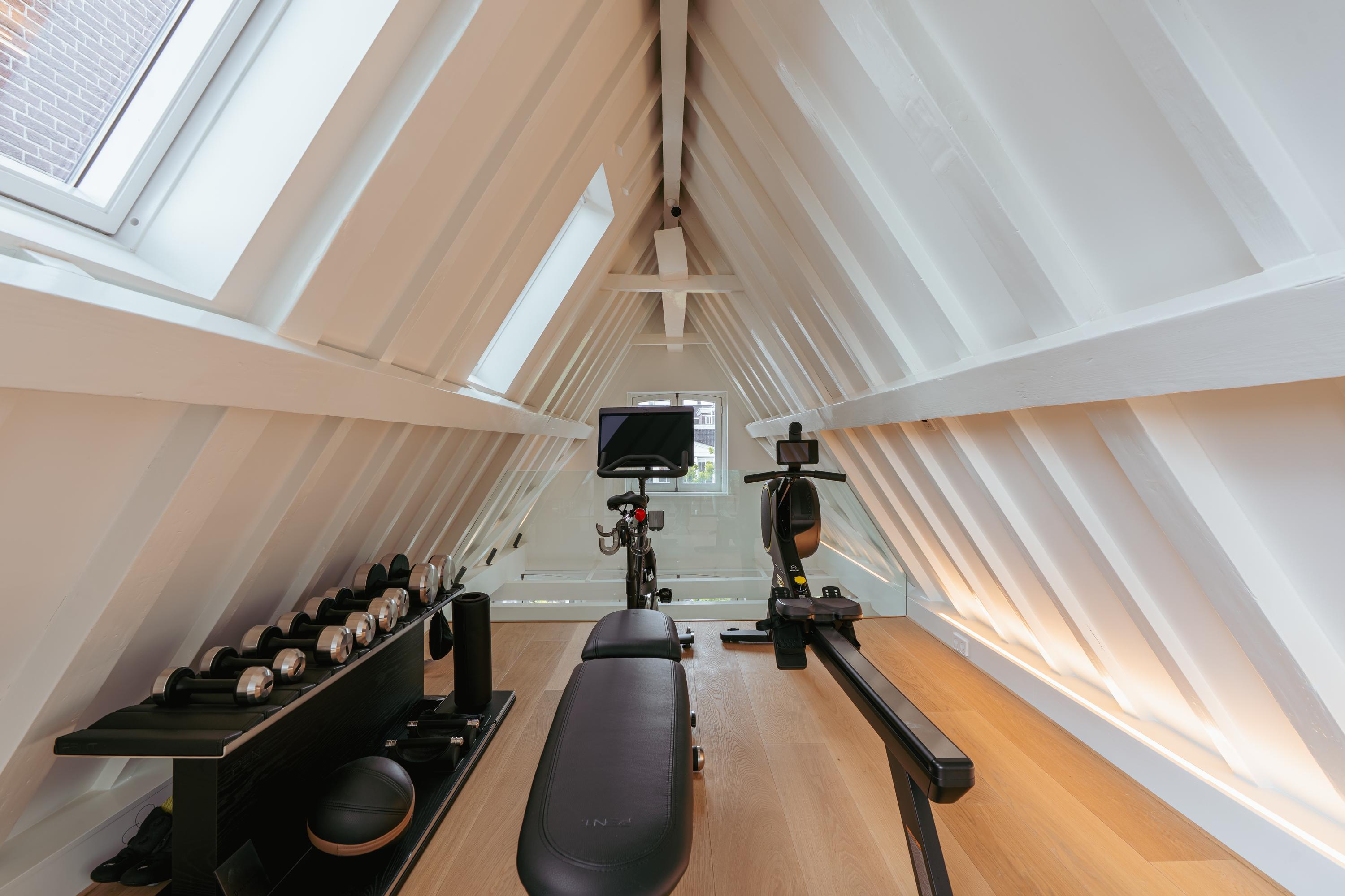 This upper floor is dedicated to a luxurious master suite — a private sanctuary of peace, space, and comfort. A central walk-in closet features custom cabinetry that is both functional and stylish. At the front is the cozy bedroom, where original ceiling beams and impressive ceiling height immediately draw the eye. Tall windows extending into the gable enhance the sense of openness and bring in wonderful natural light. Built-in wardrobes contribute to the clean, elegant look. At the rear lies the spectacular bathroom — a true wellness retreat at home. Here you’ll find a striking freestanding Agape Spoon Woodline bathtub, a double vanity with stylish cabinetry, a spacious walk-in shower, a steam cabin, and a built-in recliner for ultimate relaxation. The space is finished with warm materials and thoughtful design elements, including integrated lighting for a hotel-like atmosphere. Beautiful wooden sliding panels provide both shading and aesthetic appeal, offering privacy without blocking light. The toilet is separate from the bathroom.