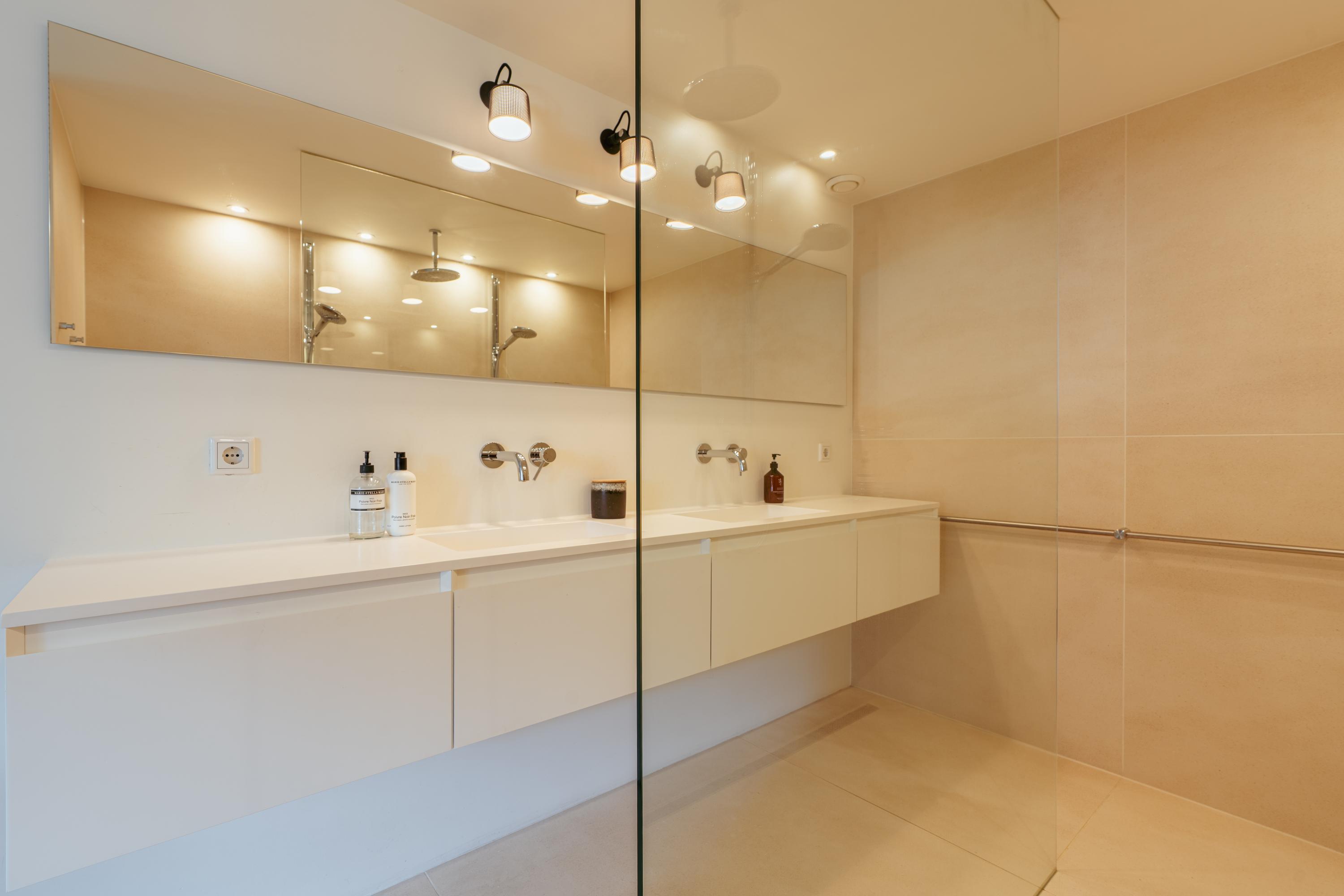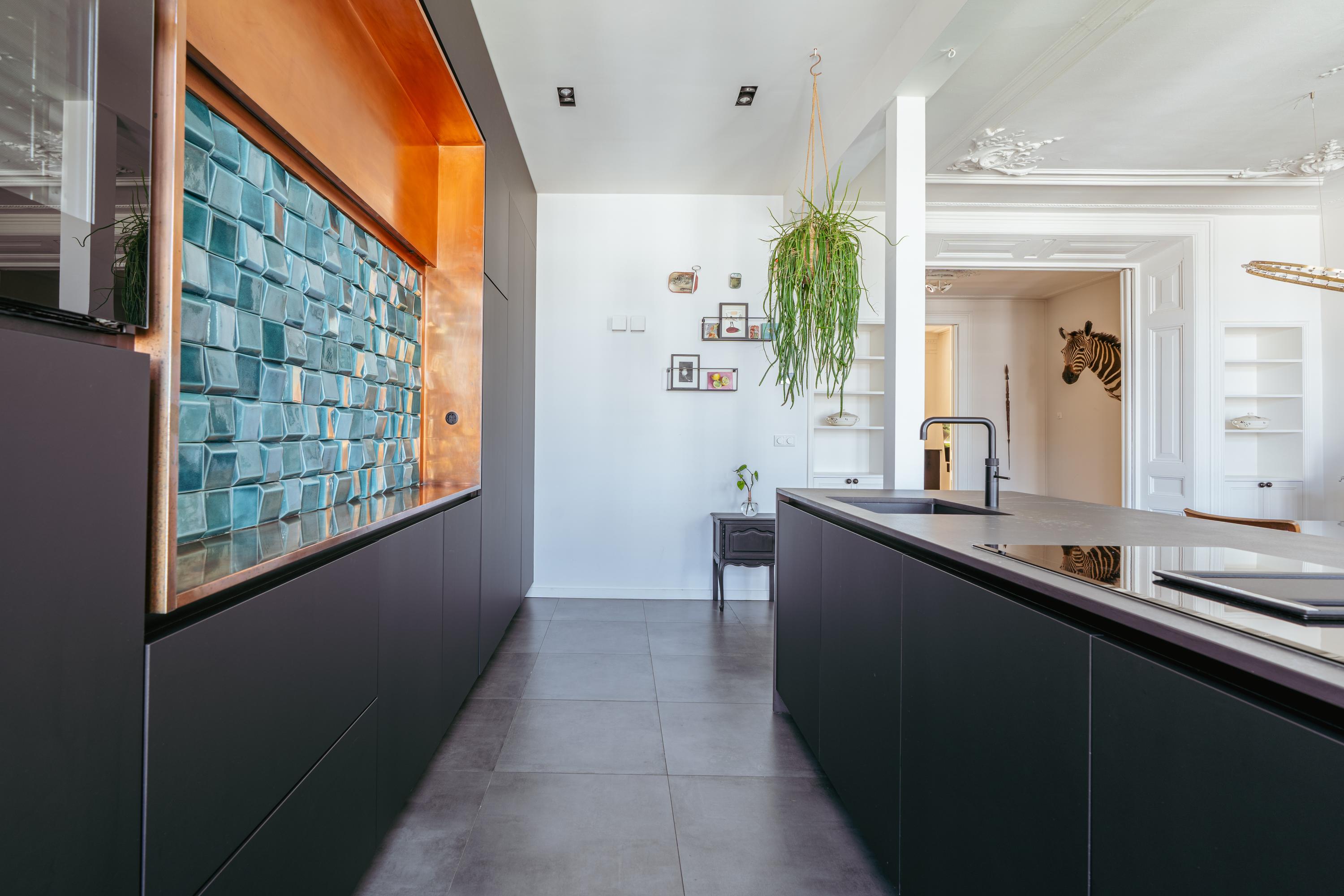 The modern open kitchen, located at the bright rear side of the home, boasts a unique island with a Dekton countertop and a copper backsplash featuring Portuguese 3D tiles. Luxury appliances include an induction cooktop with integrated extractor, (steam) oven with sous-vide and plate-warming functions, large refrigerator and separate freezer, dishwasher, and a Quooker tap with sparkling water function. The expansive dining area spans an impressive 35 m², perfect for unforgettable gatherings with family and friends.