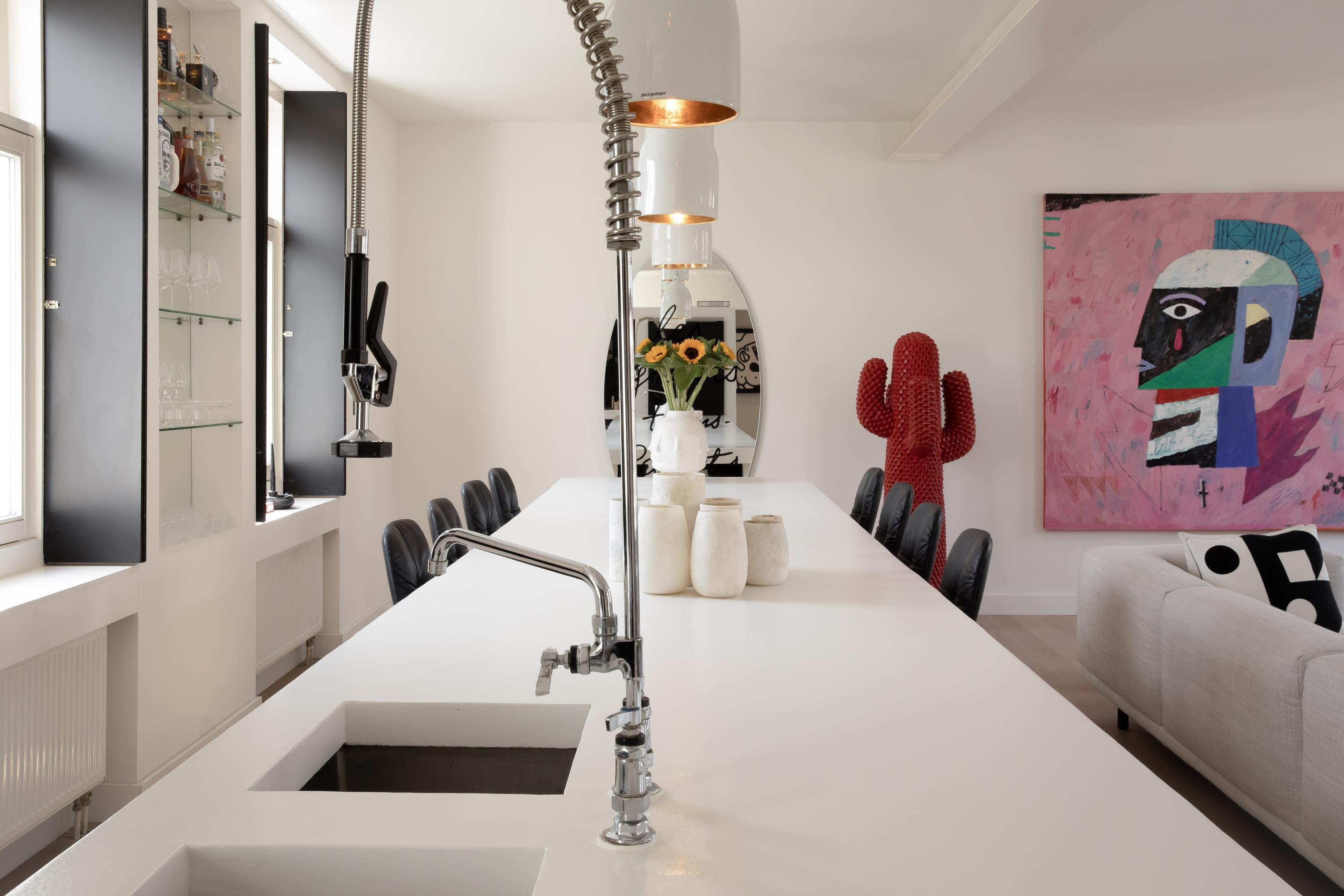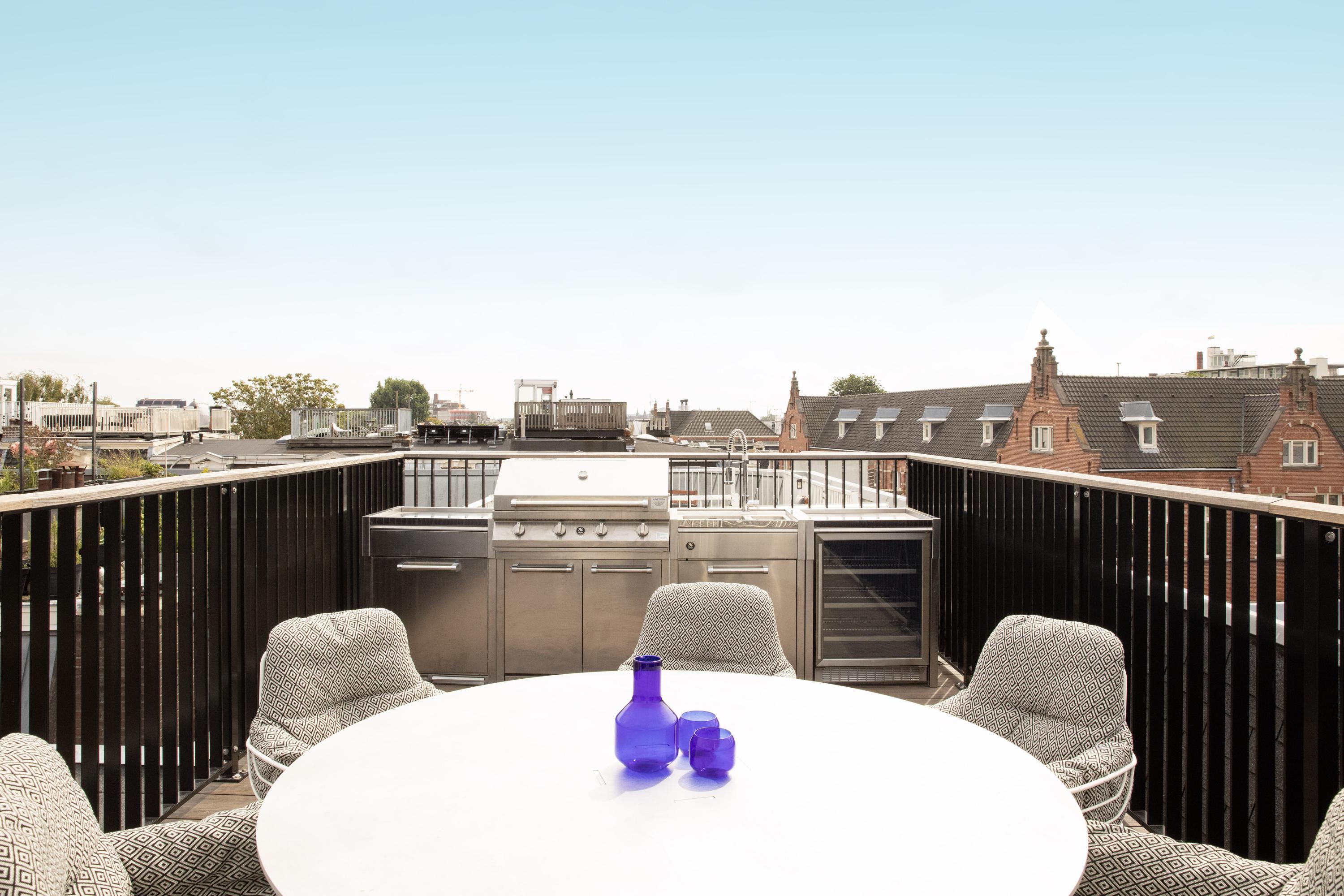 This apartment spans two floors and features a strikingly wide façade with no fewer than four large windows. The property offers a generous living room with open kitchen, a balcony, two well-sized bedrooms, and two modern bathrooms. The spacious roof terrace with outdoor kitchen provides a stunning view over the city. Finished with high-quality materials and great attention to detail, this loft-like apartment offers a stylish and comfortable living environment, with the vibrant city center just around the corner.