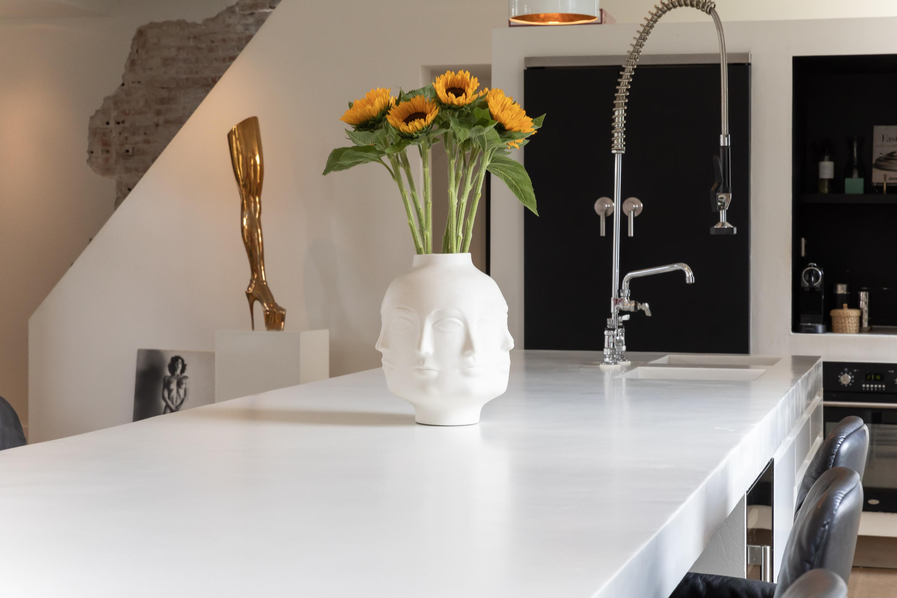 The modern open kitchen is equipped with an impressive cooking island with dining area and high-end built-in appliances from Boretti, including an oven, fridge-freezer, 8-burner gas stove with extractor hood, dishwasher, and wine cooler. Ample storage space is also provided. From the kitchen, you have access to the wide, cozy balcony (approx. 4 m²), facing east.
