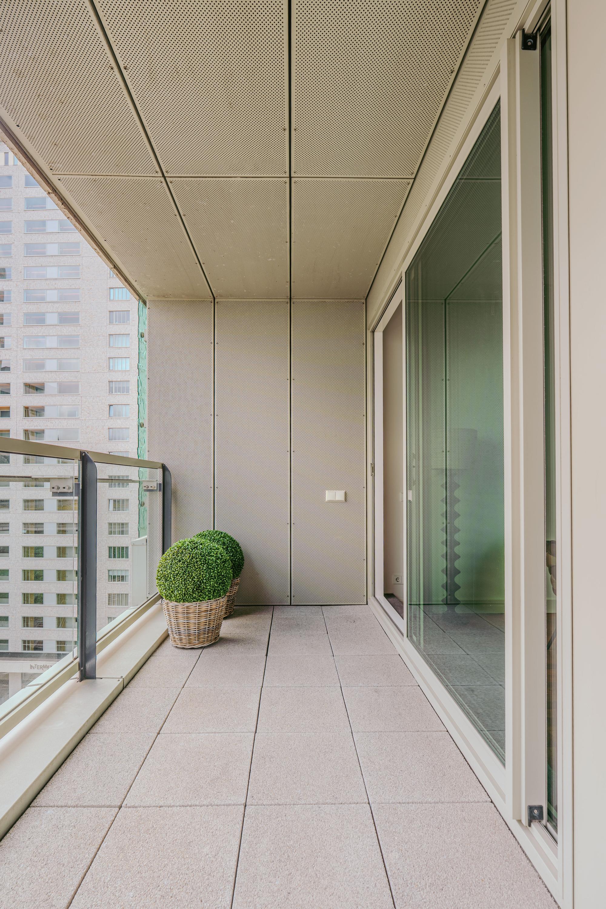 Upon entering the 8th floor, you step into a spacious hallway with a meter cupboard, separate toilet, and room for a wardrobe. From here, you enter the bright and airy living area, where the views immediately catch your eye, creating a sense of openness and calm. At the front, sliding glass doors give access to the generous balcony that spans the full width of the apartment — an ideal spot to relax, enjoy breakfast, or take in the view. The open-plan kitchen is situated at the rear and is equipped with modern built-in appliances, including a fridge, freezer, induction hob, Quooker, and dishwasher.