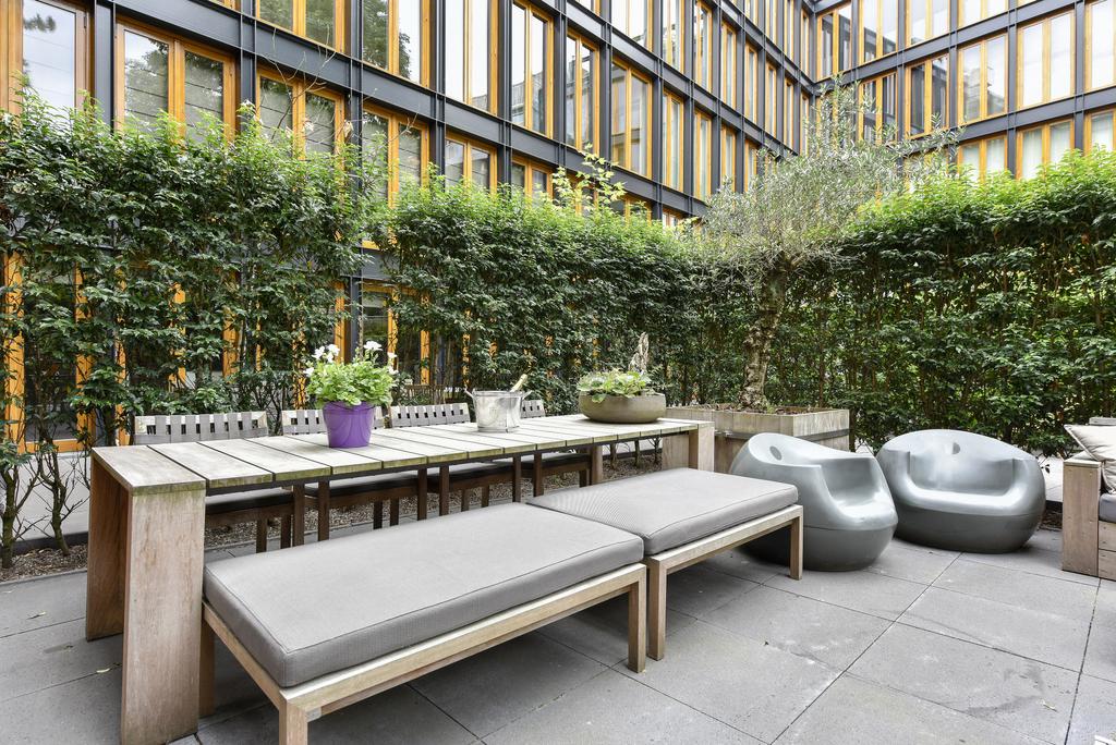 This block was designed and finally completed in 2012, with an eye for detail and quality. The design provided for extra high ceilings and the use of predominantly glass in the façades on the garden side. The apartments are light, airy and spacious. The current owners finished off the apartment’s interior with a great deal of taste and an eye for detail which may be seen in the sturdy materials such as the herringbone pattern floors and the steel surrounds to the internal framing for doors and windows. Lots of details are repeated throughout the apartment. This apartment has a floor area of 135 m² and a garden of 41 m².
