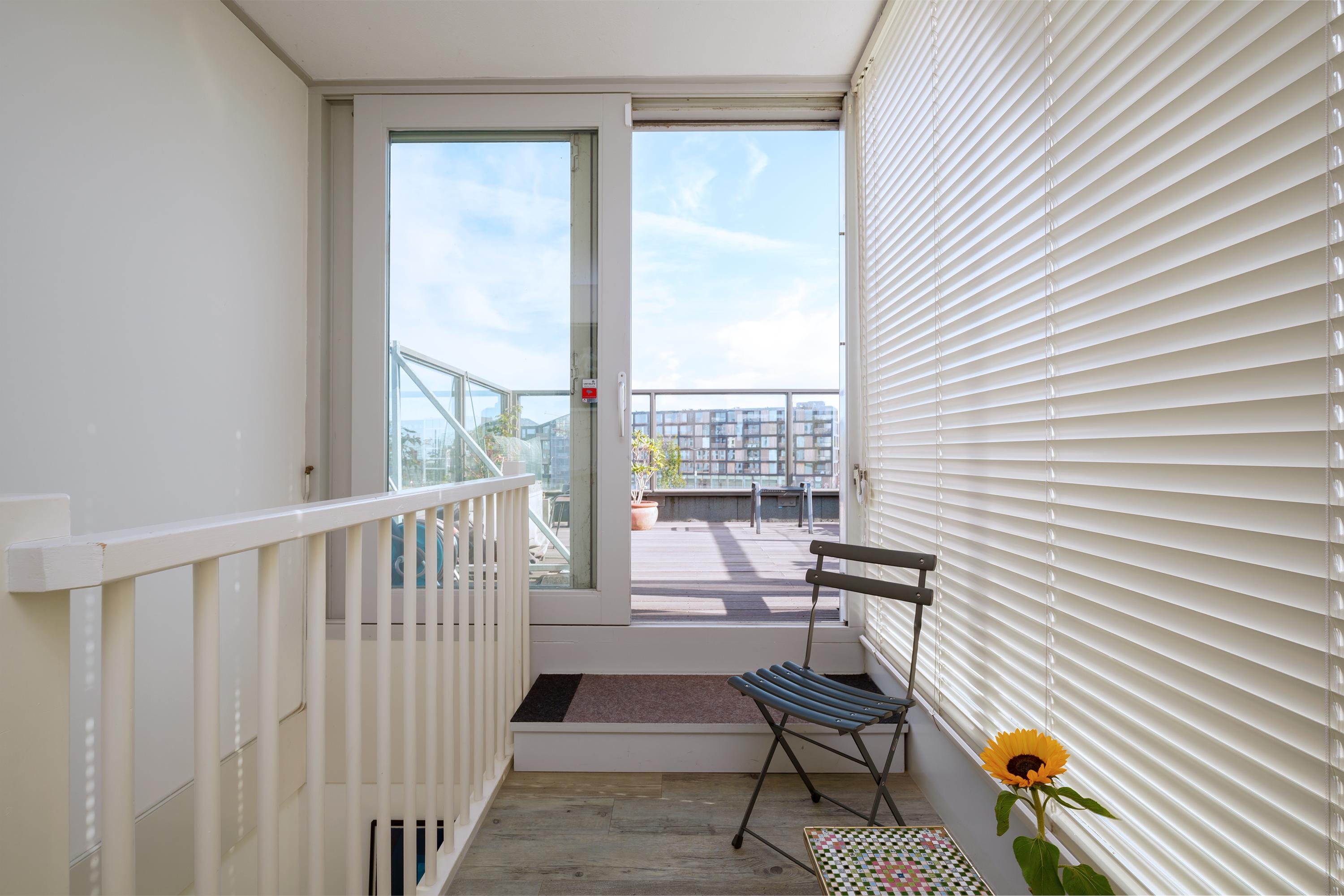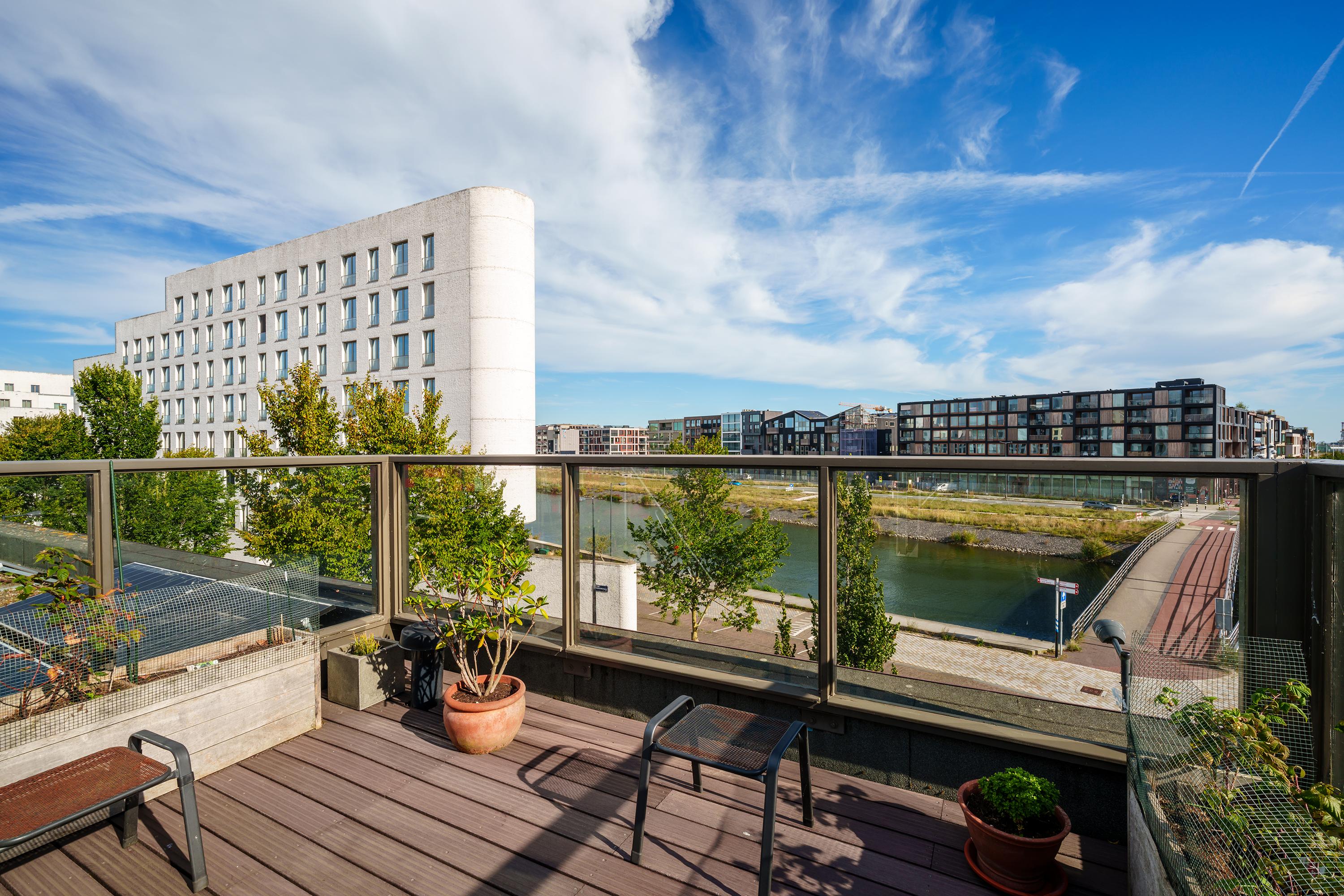 A staircase from the second floor leads to the generous roof terrace (over 18 m²), one of the highlights of this property: spacious, sunny and offering unobstructed views over the water and the neighbourhood. The high glass balustrade (providing shelter from the wind) and the decking create a modern, open feel while maintaining plenty of privacy.