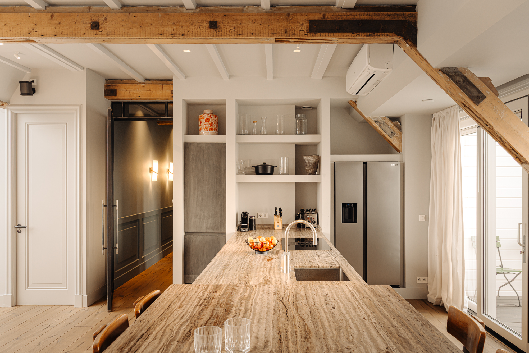 Upon entering, you immediately notice the spacious and light-filled design of the apartment. The living room features a charming south-facing balcony and large windows on both sides, allowing plenty of natural light and offering a panoramic view of the city. The visible wooden beams add character, while the elevated seating area creates a cosy space to relax. An air conditioning unit is installed above the kitchen, which boasts a large cooking island with a natural stone worktop and high-end built-in appliances, including a four-burner induction hob with extractor, a dishwasher, a fridge-freezer combination, a Quooker, and a built-in wine climate cabinet. A stylish raised bar area is integrated into the kitchen island. The dining area comfortably accommodates a large table, benefiting from ample natural daylight through the expansive windows.