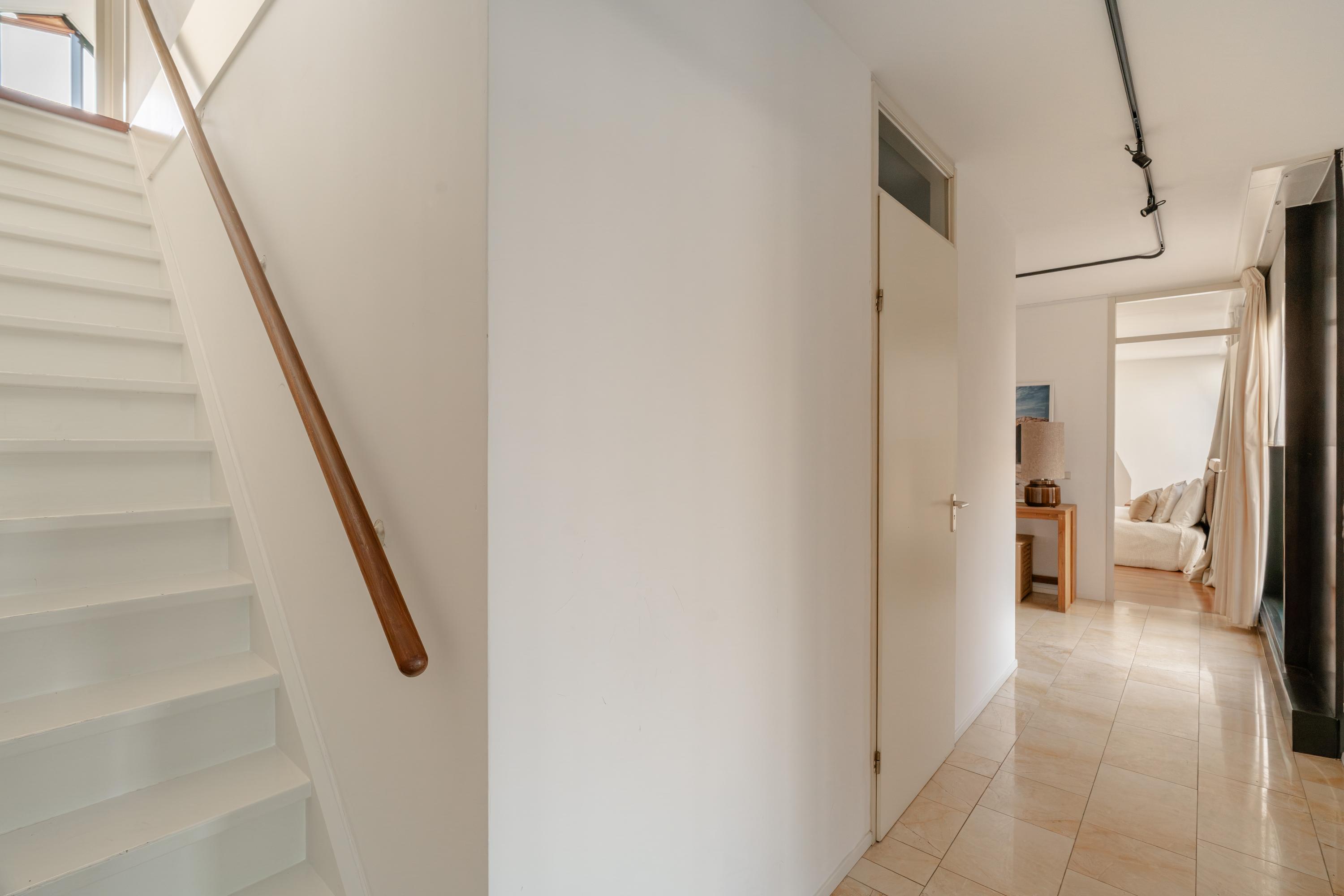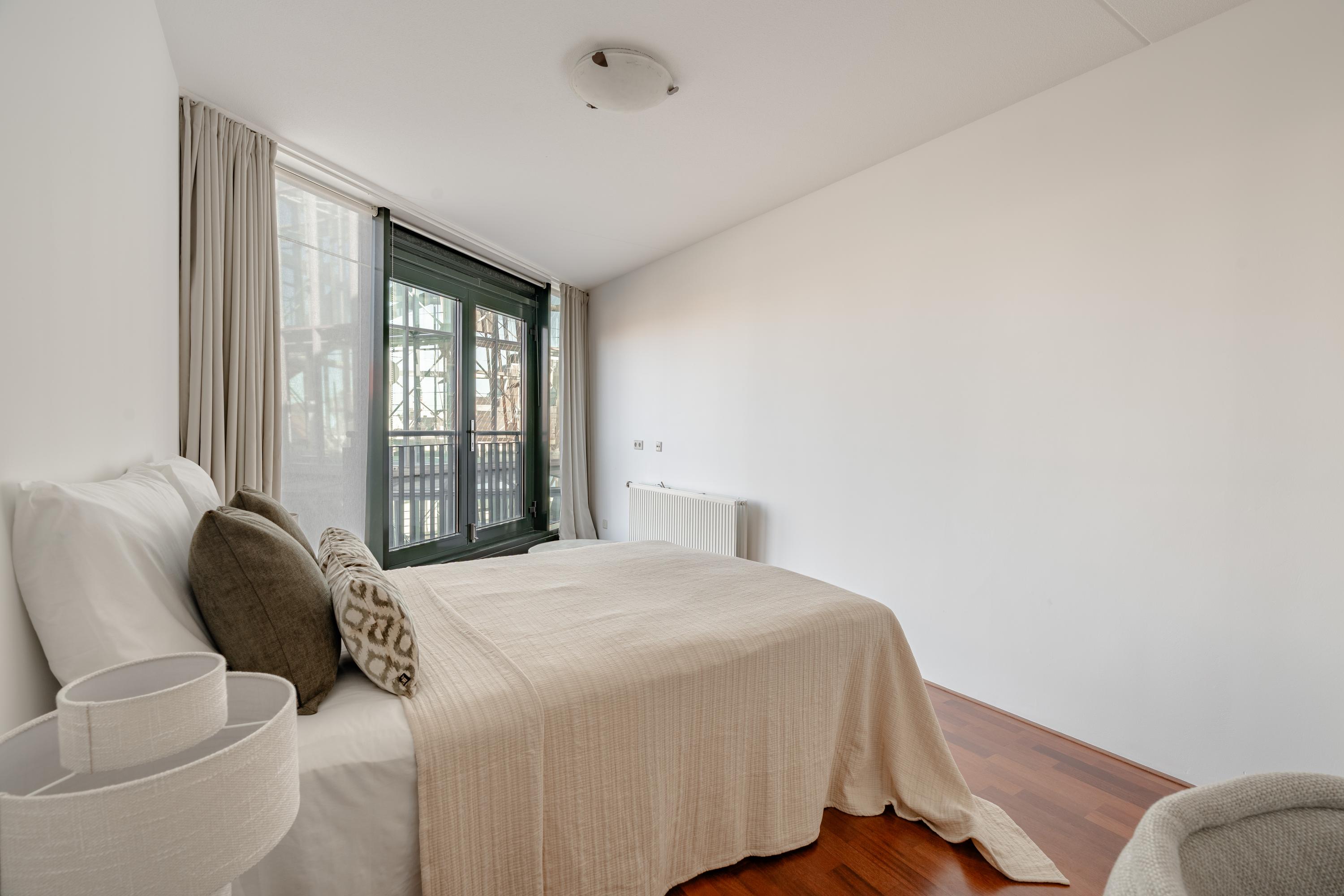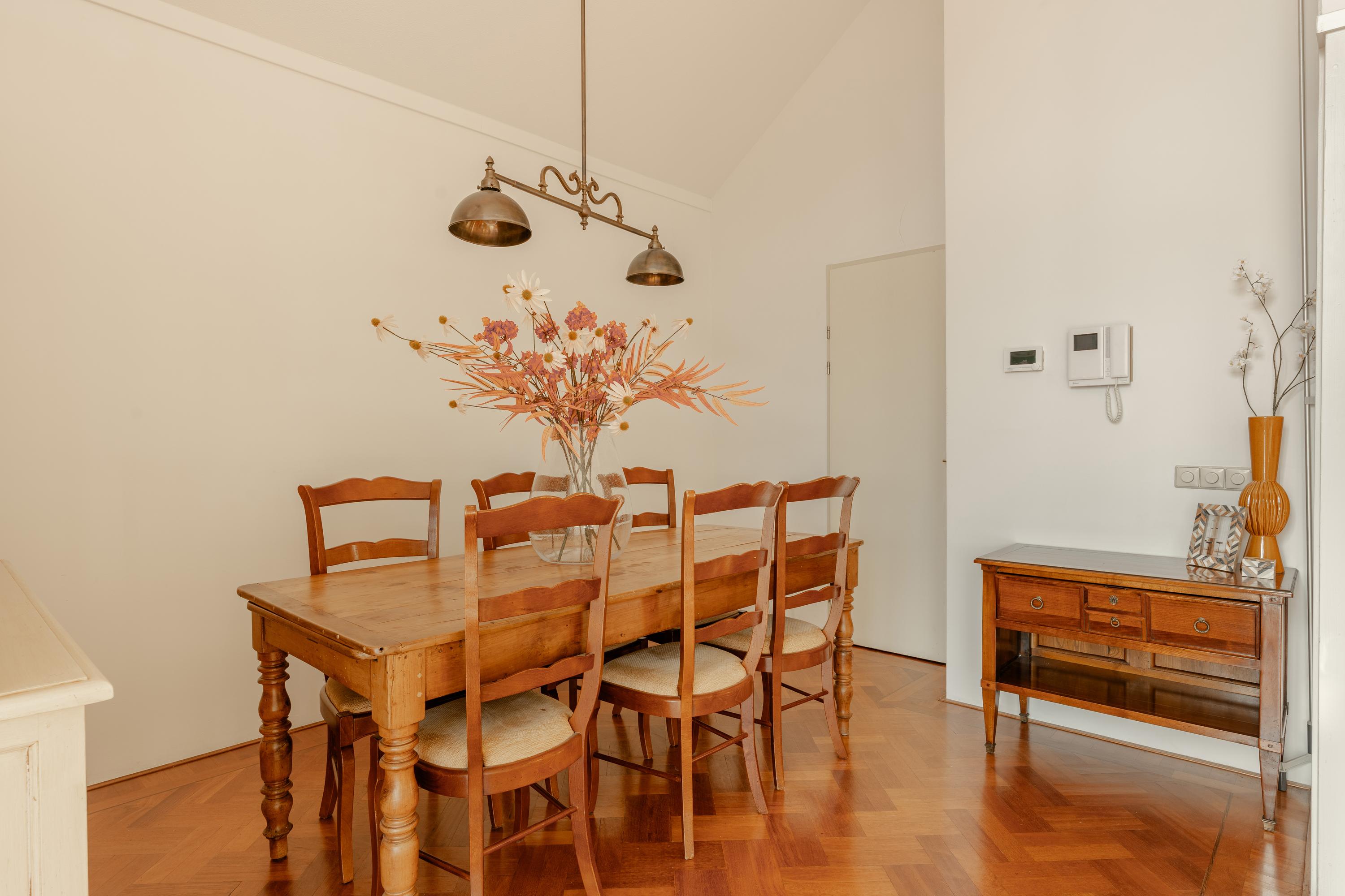 The apartment’s living level occupies the top floor, where large windows and generous ceiling heights invite daylight to animate the interiors. The living room opens to far-reaching views across the Singel and the city’s celebrated Flower Market, setting an atmosphere of refined urban calm. A half-open kitchen, complete with built-in appliances and an adjacent storage area, seamlessly connects to the dining space, ideal for gathering and entertaining.
