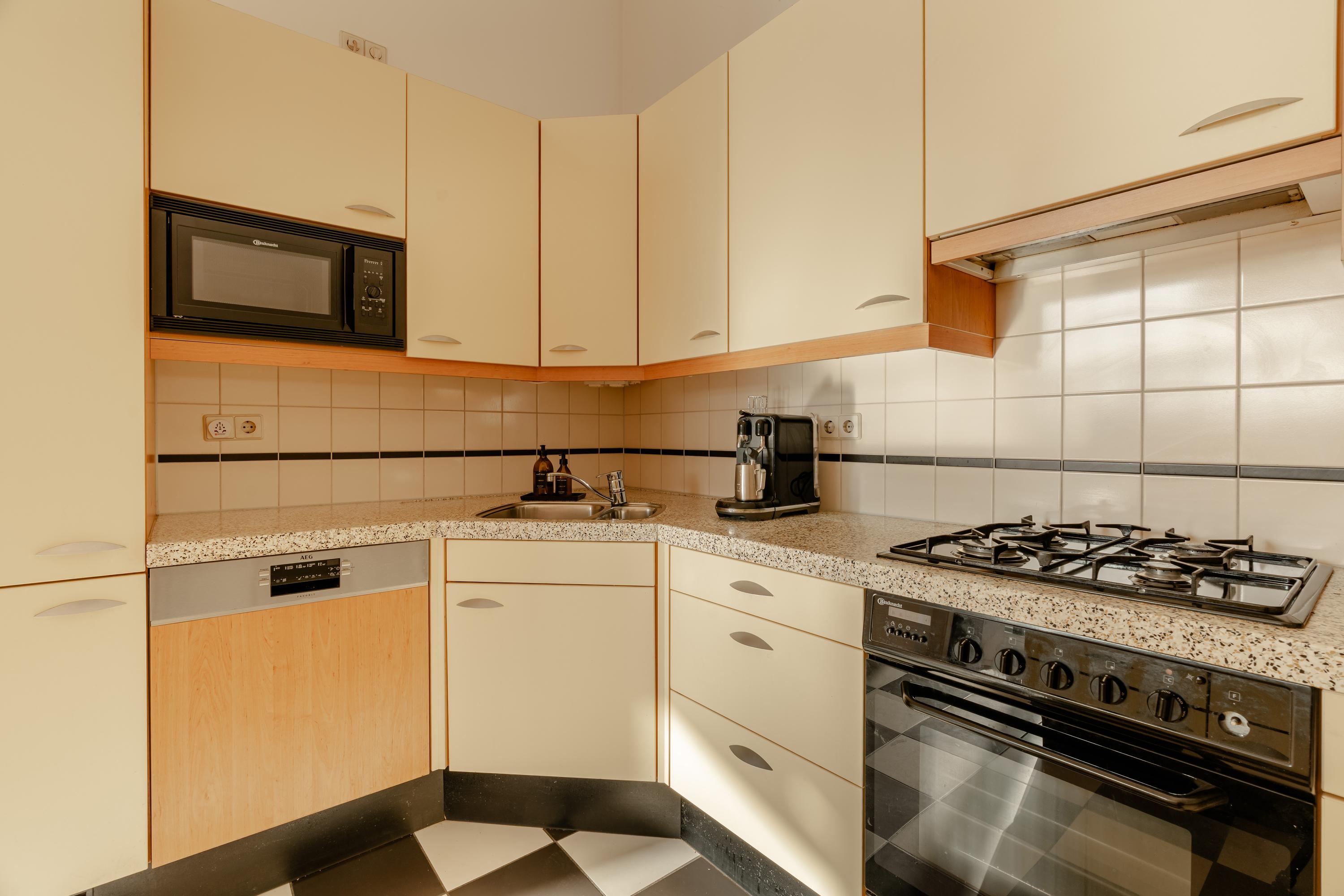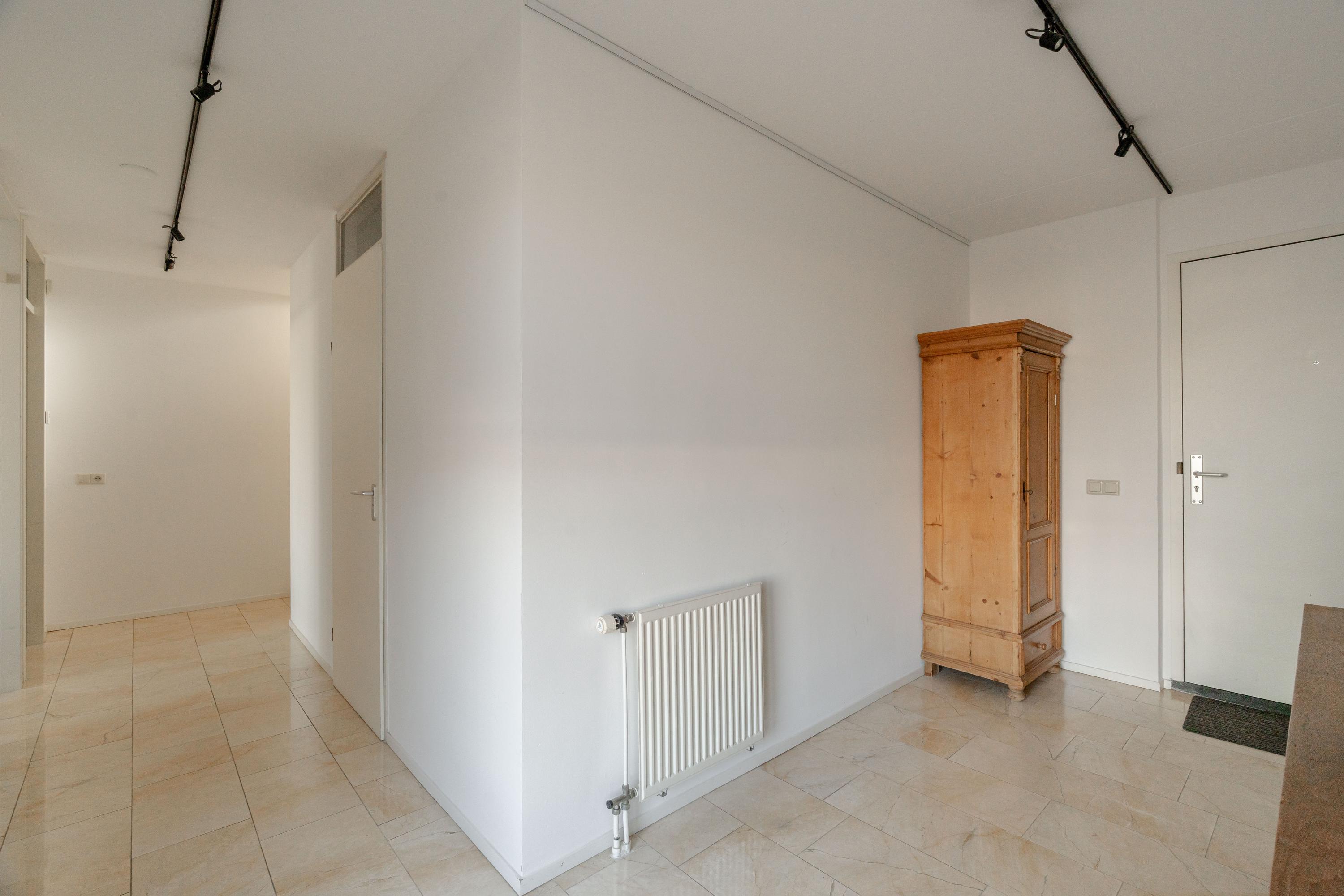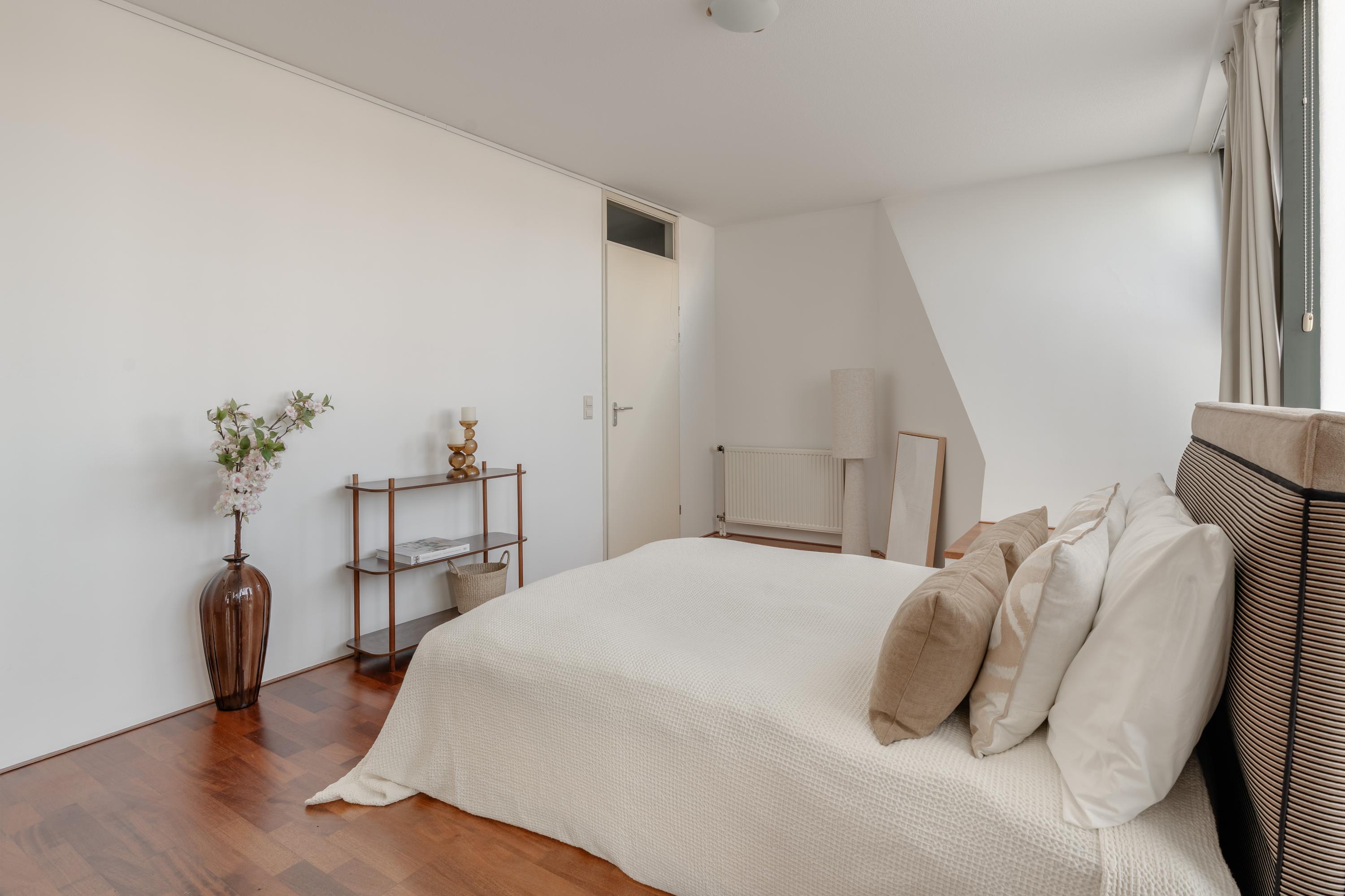 The apartment’s living level occupies the top floor, where large windows and generous ceiling heights invite daylight to animate the interiors. The living room opens to far-reaching views across the Singel and the city’s celebrated Flower Market, setting an atmosphere of refined urban calm. A half-open kitchen, complete with built-in appliances and an adjacent storage area, seamlessly connects to the dining space, ideal for gathering and entertaining.