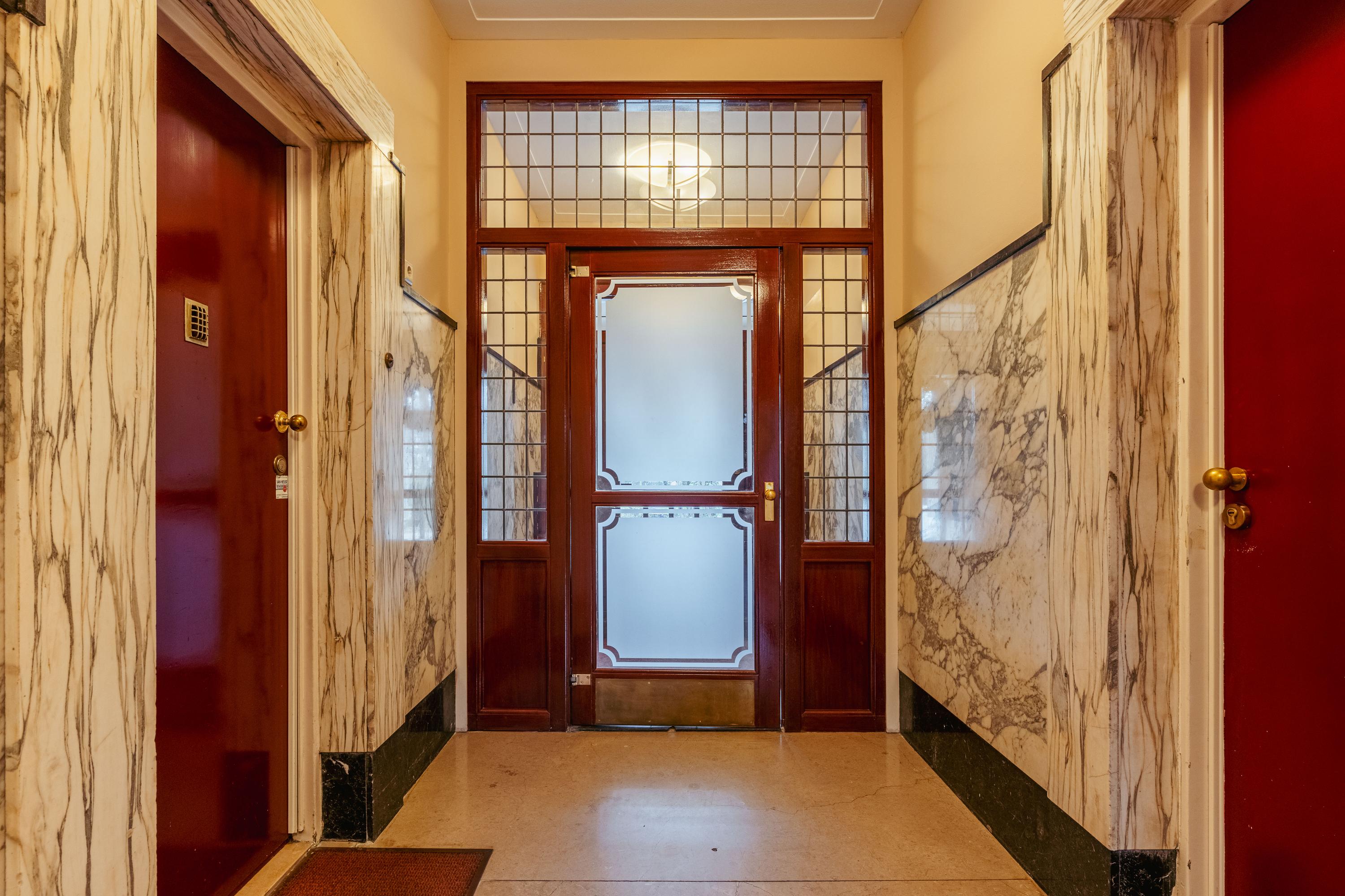 The communal entrance is neat and well maintained. You reach the second floor via the staircase or the elevator, where the private entrance to the apartment is located.