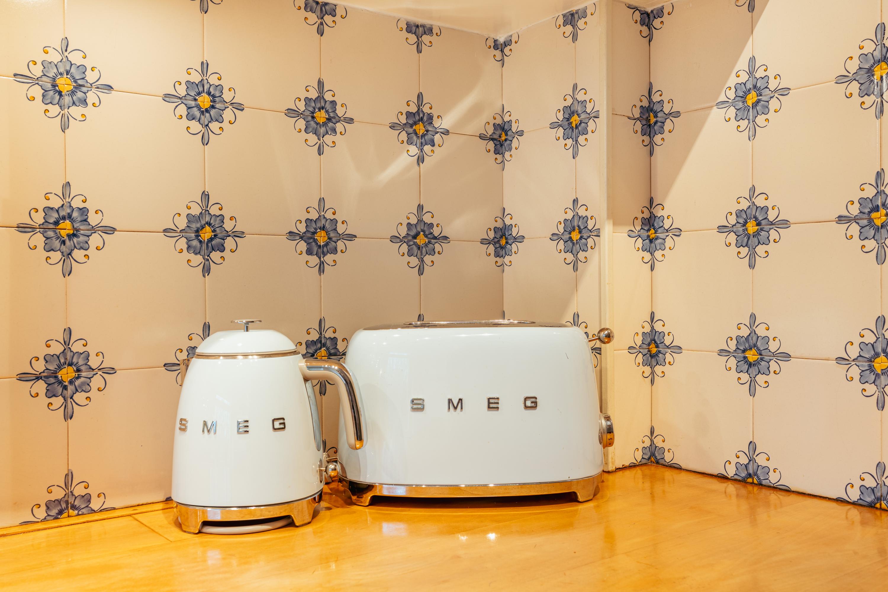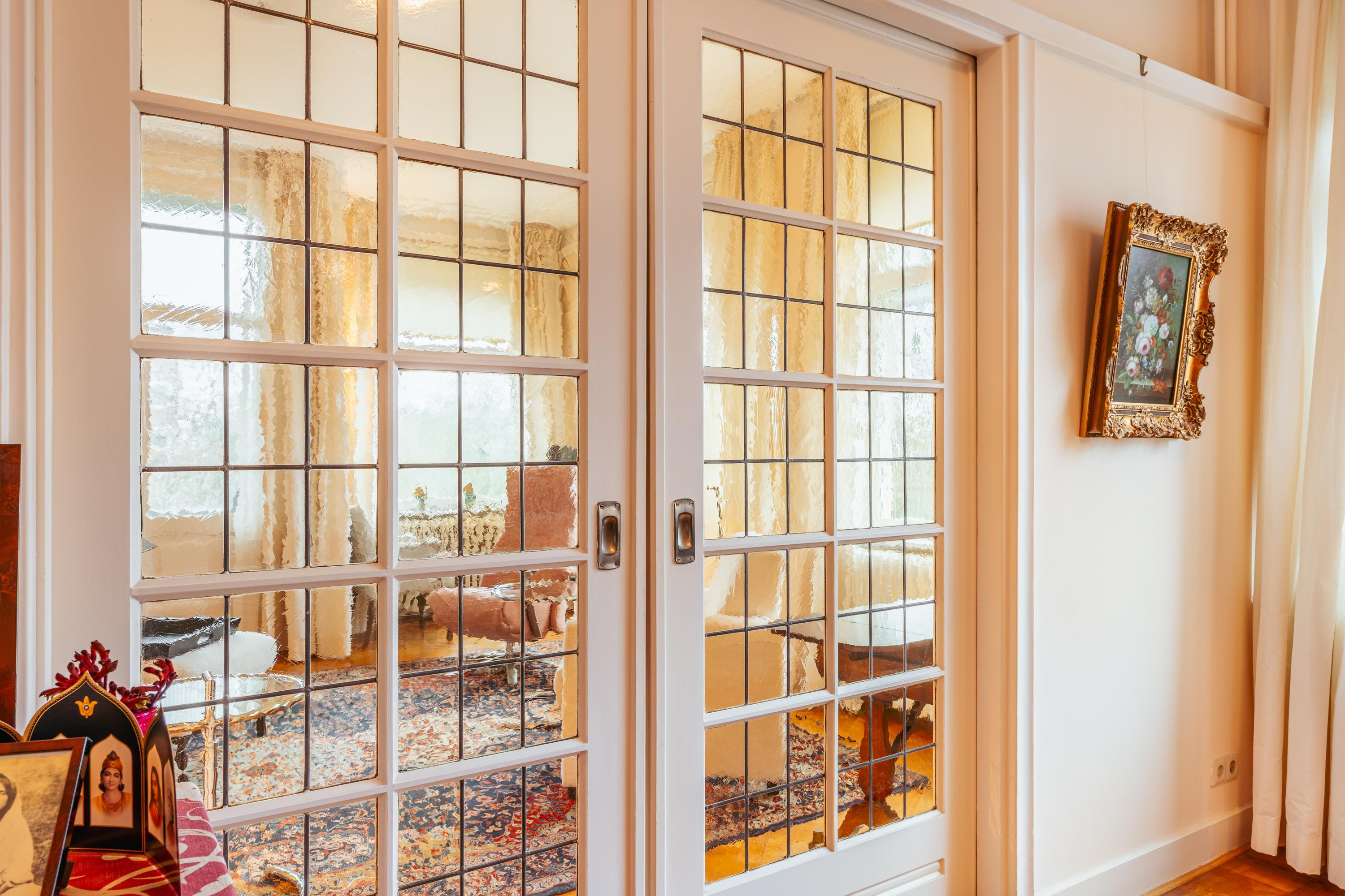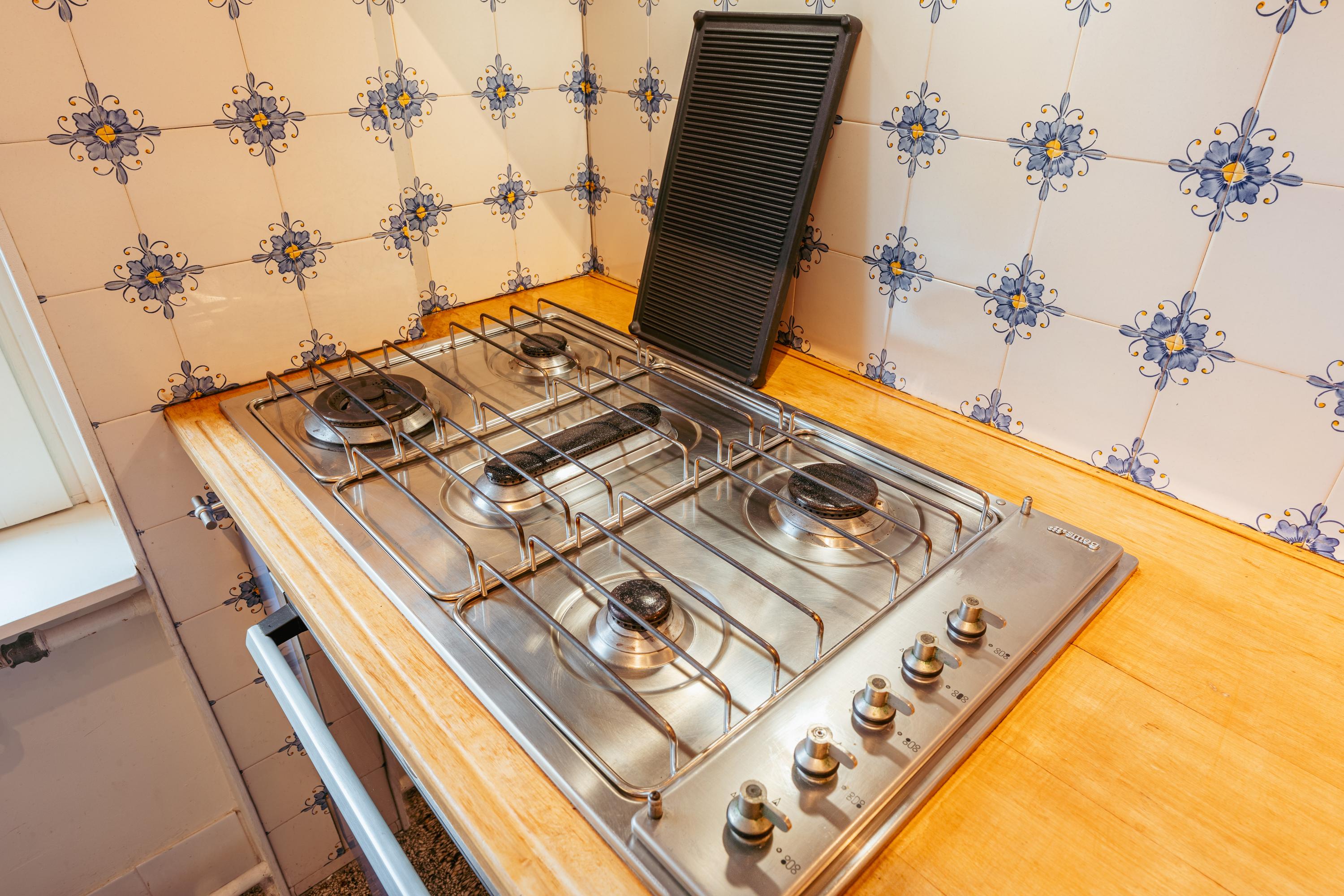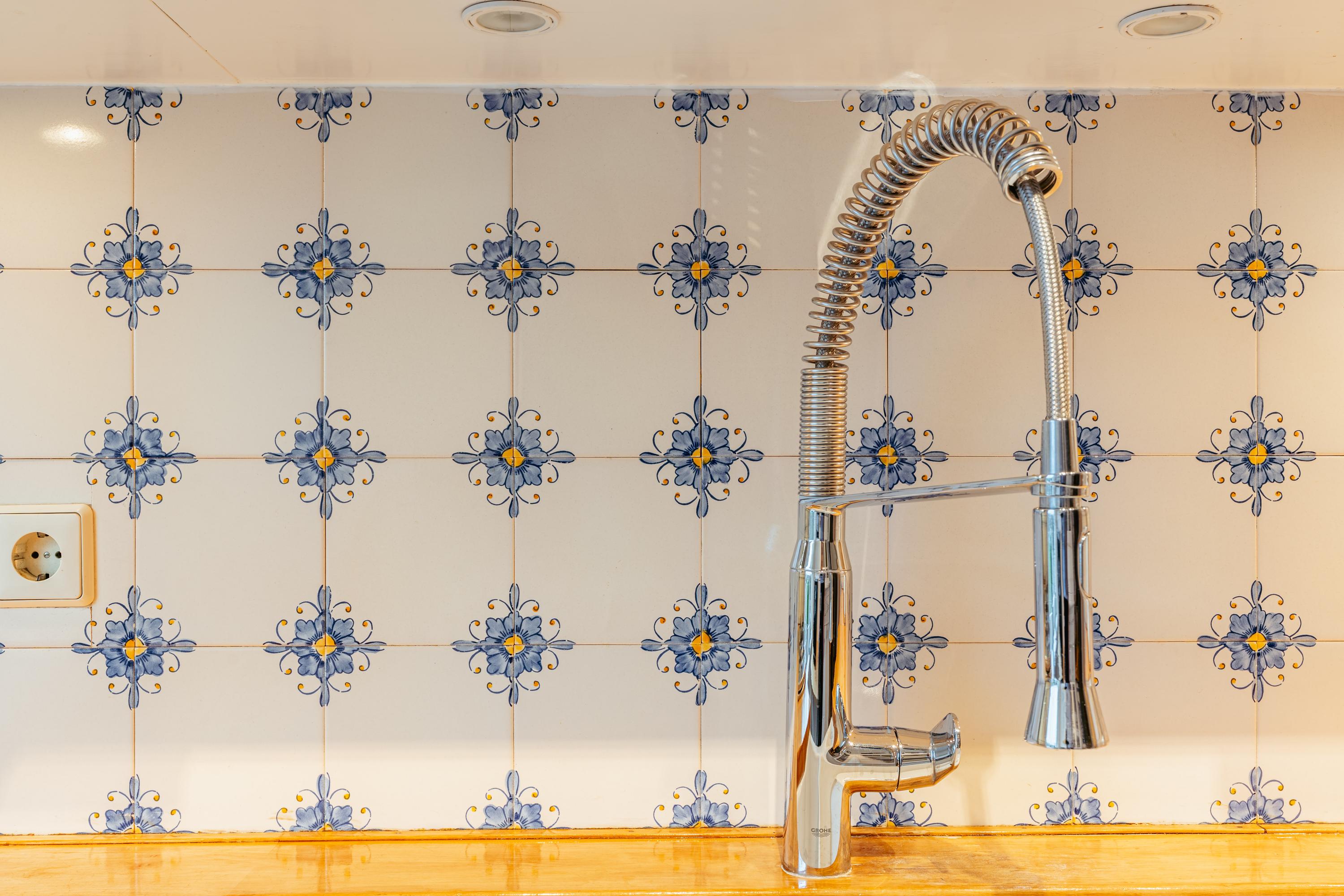 Located next to the dining room is the kitchen, finished in a distinctive design with abundant cupboard space and a practical layout. The wooden worktop, stone sink and original tiled wall contribute to the kitchen’s warm appearance. The kitchen is equipped with a 5-burner gas hob, oven and dishwasher.
