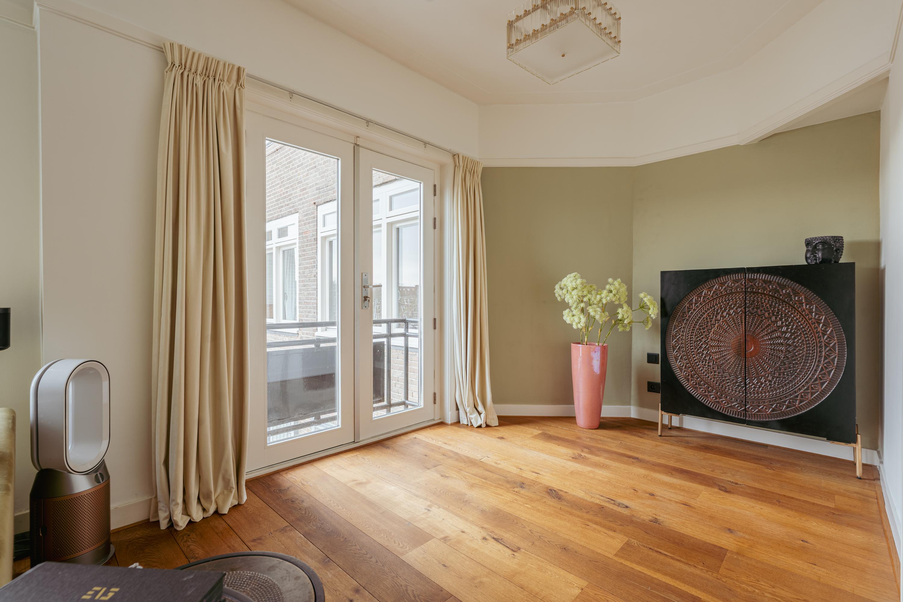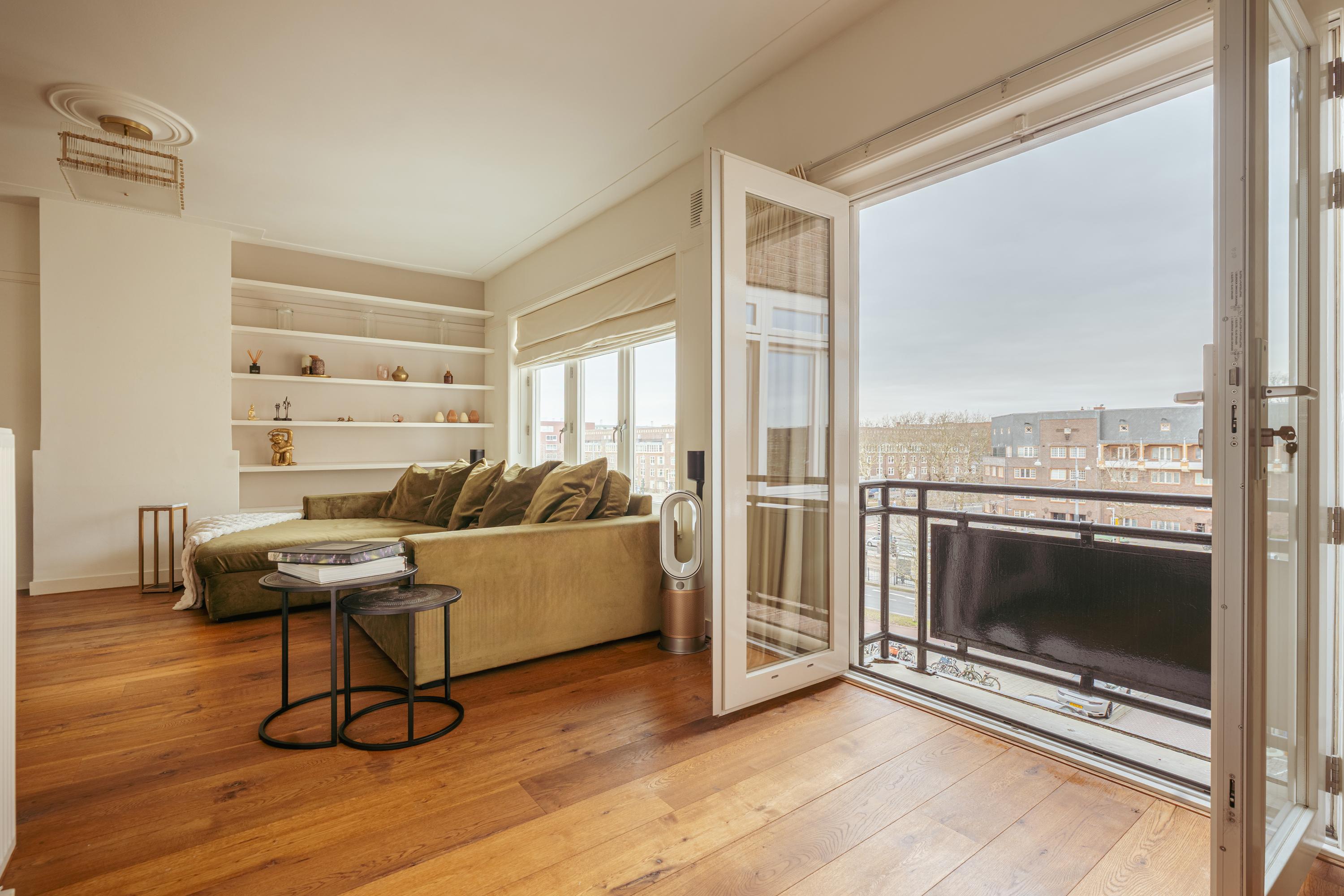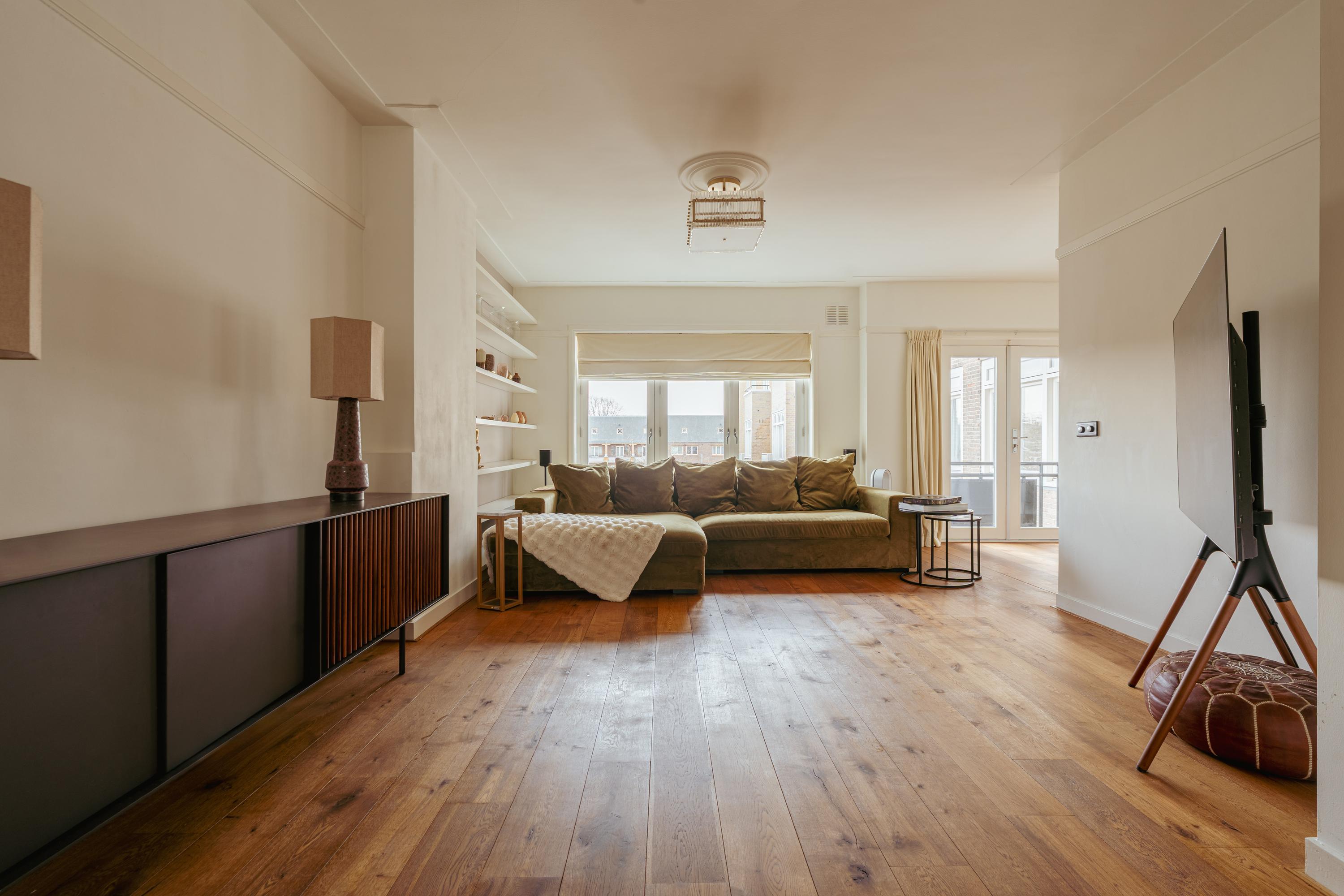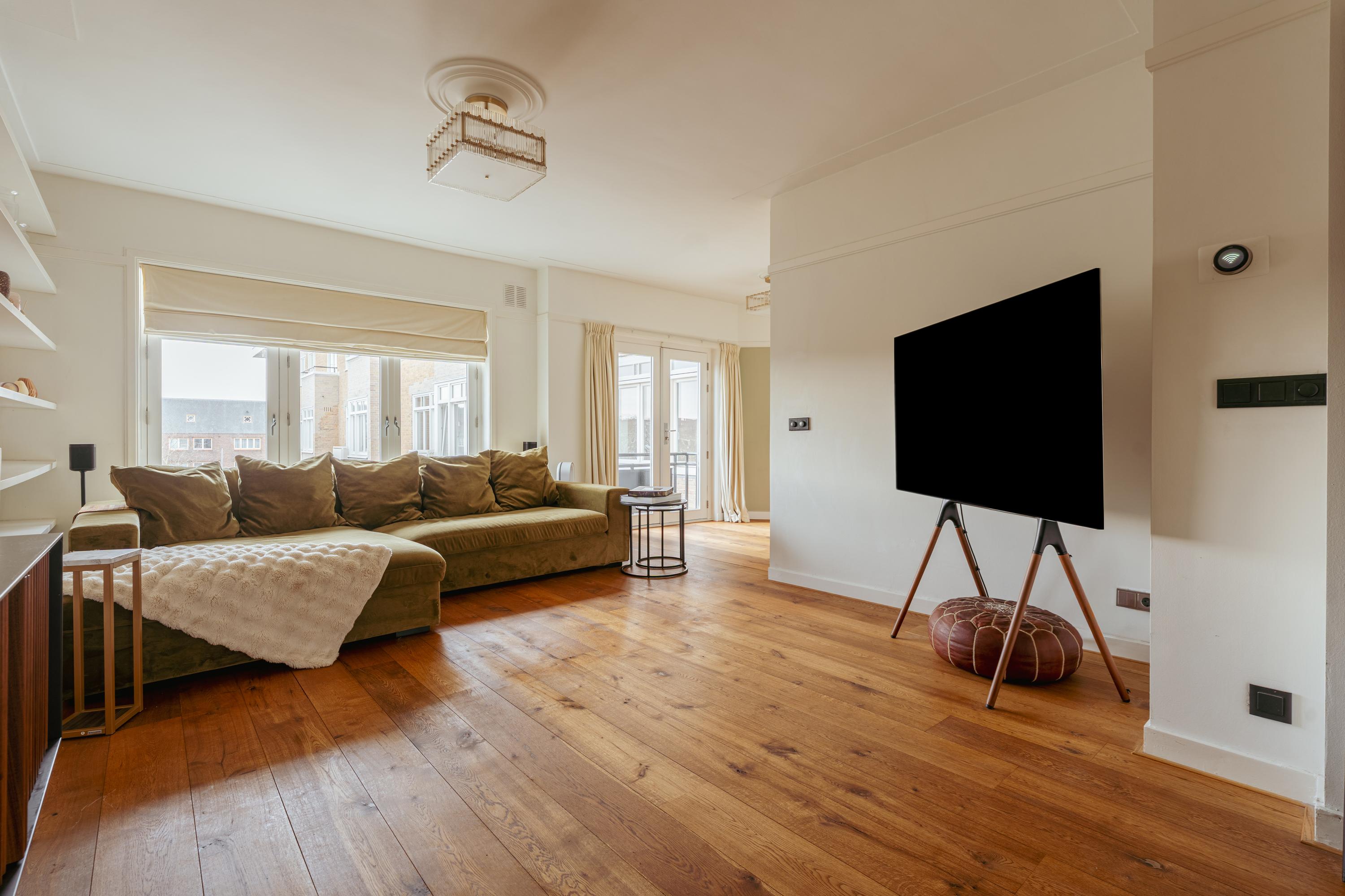 The spacious living area forms the heart of the apartment: an impressive L-shaped living room extending from the front to the rear of the property. Large windows at the front provide beautiful natural light. French doors open onto a charming balcony with open views over the lively Stadionplein. The generous layout offers various possibilities for furnishing and arrangement.