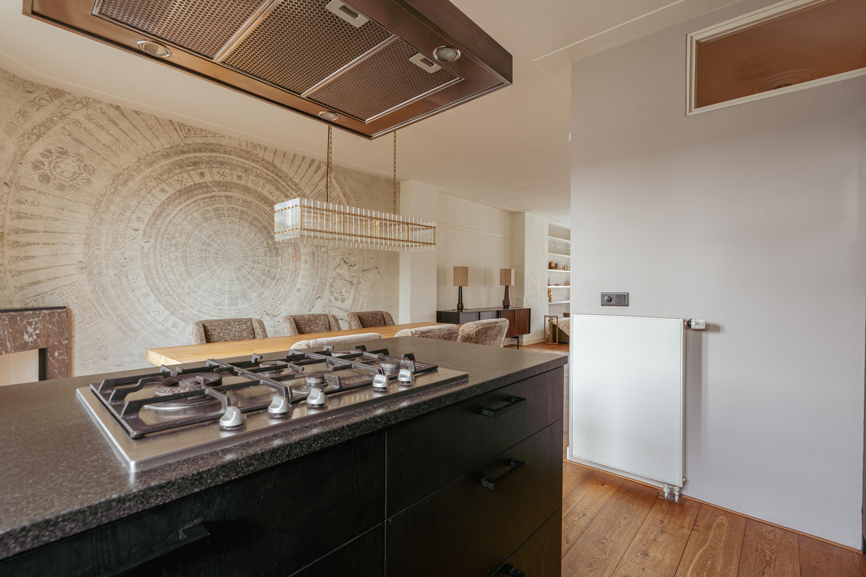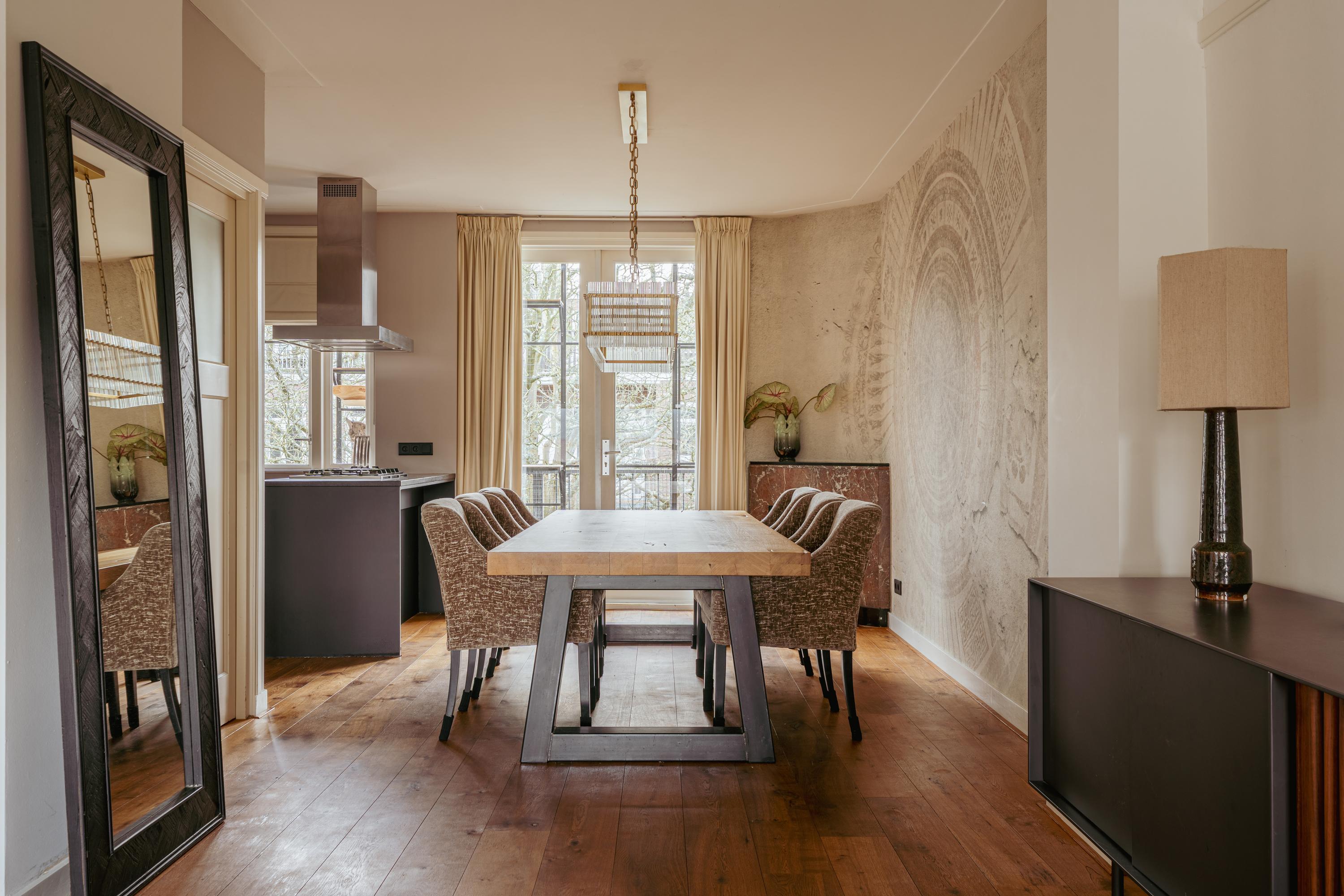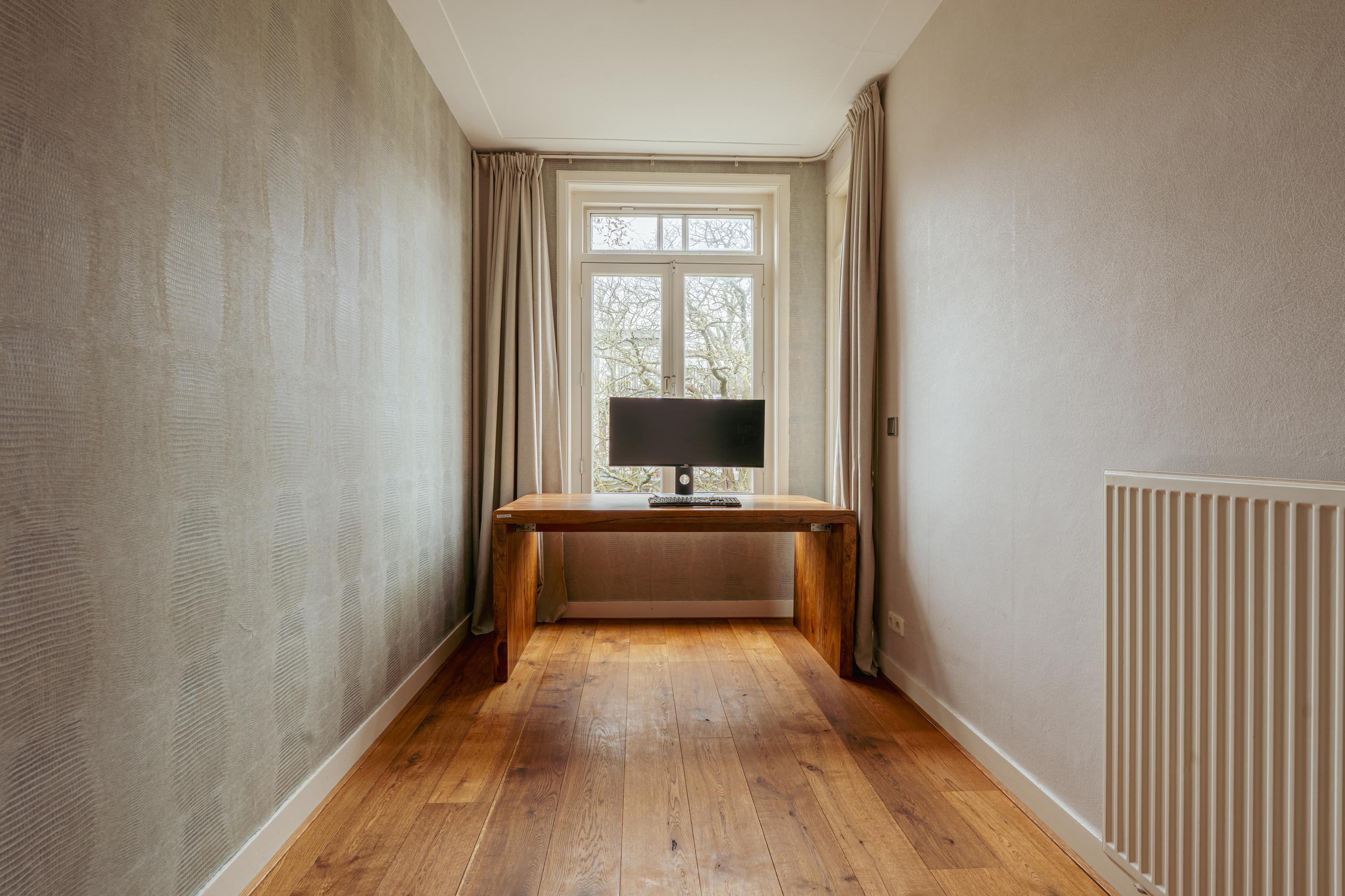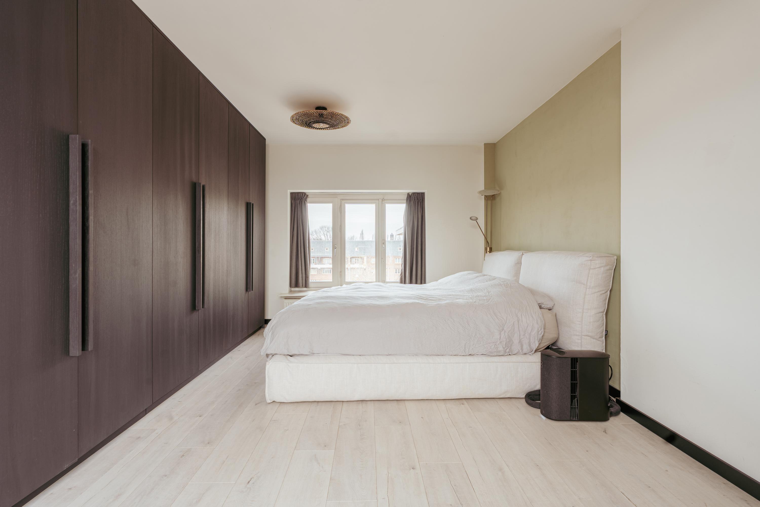 The spacious living area forms the heart of the apartment: an impressive L-shaped living room extending from the front to the rear of the property. Large windows at the front provide beautiful natural light. French doors open onto a charming balcony with open views over the lively Stadionplein. The generous layout offers various possibilities for furnishing and arrangement.