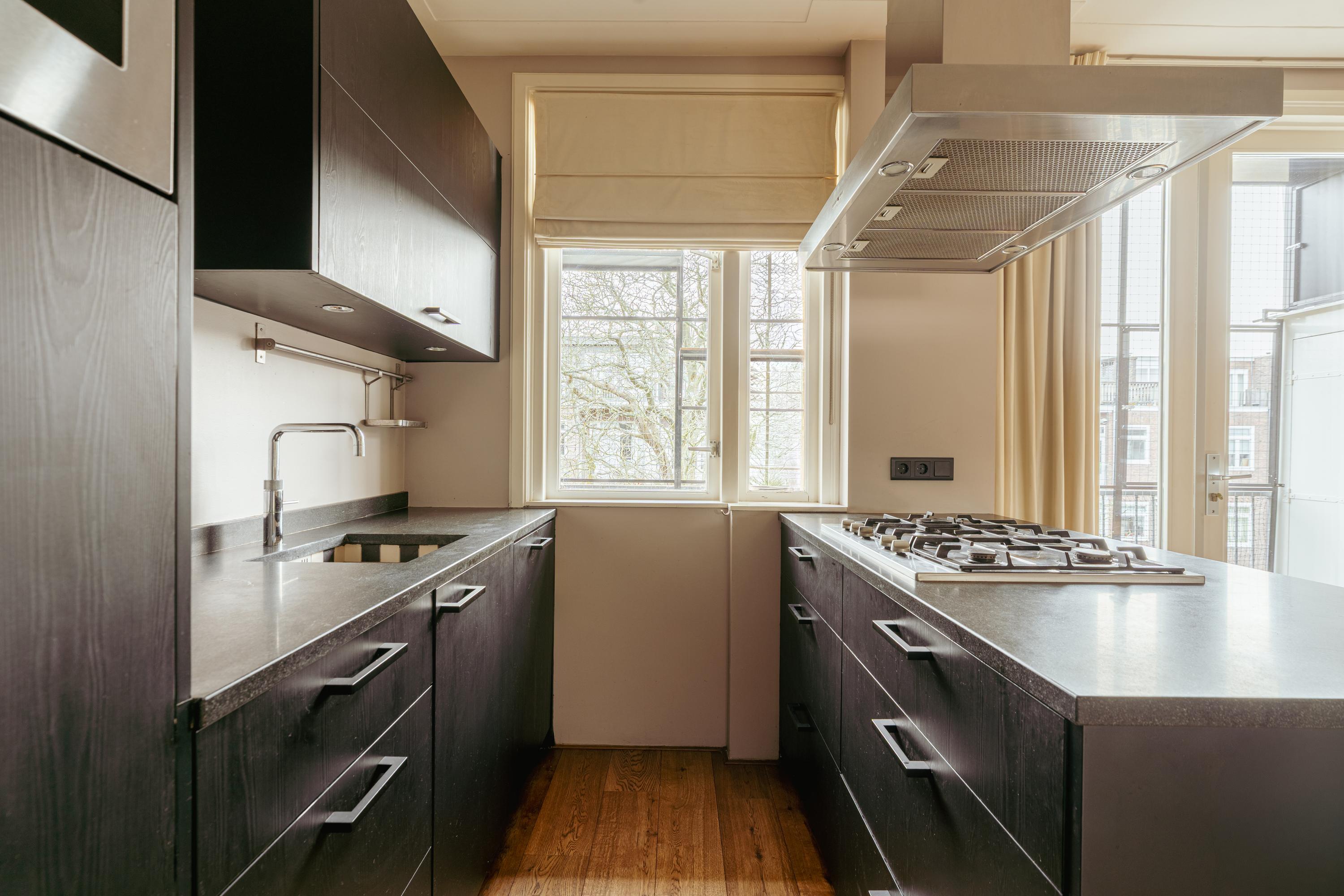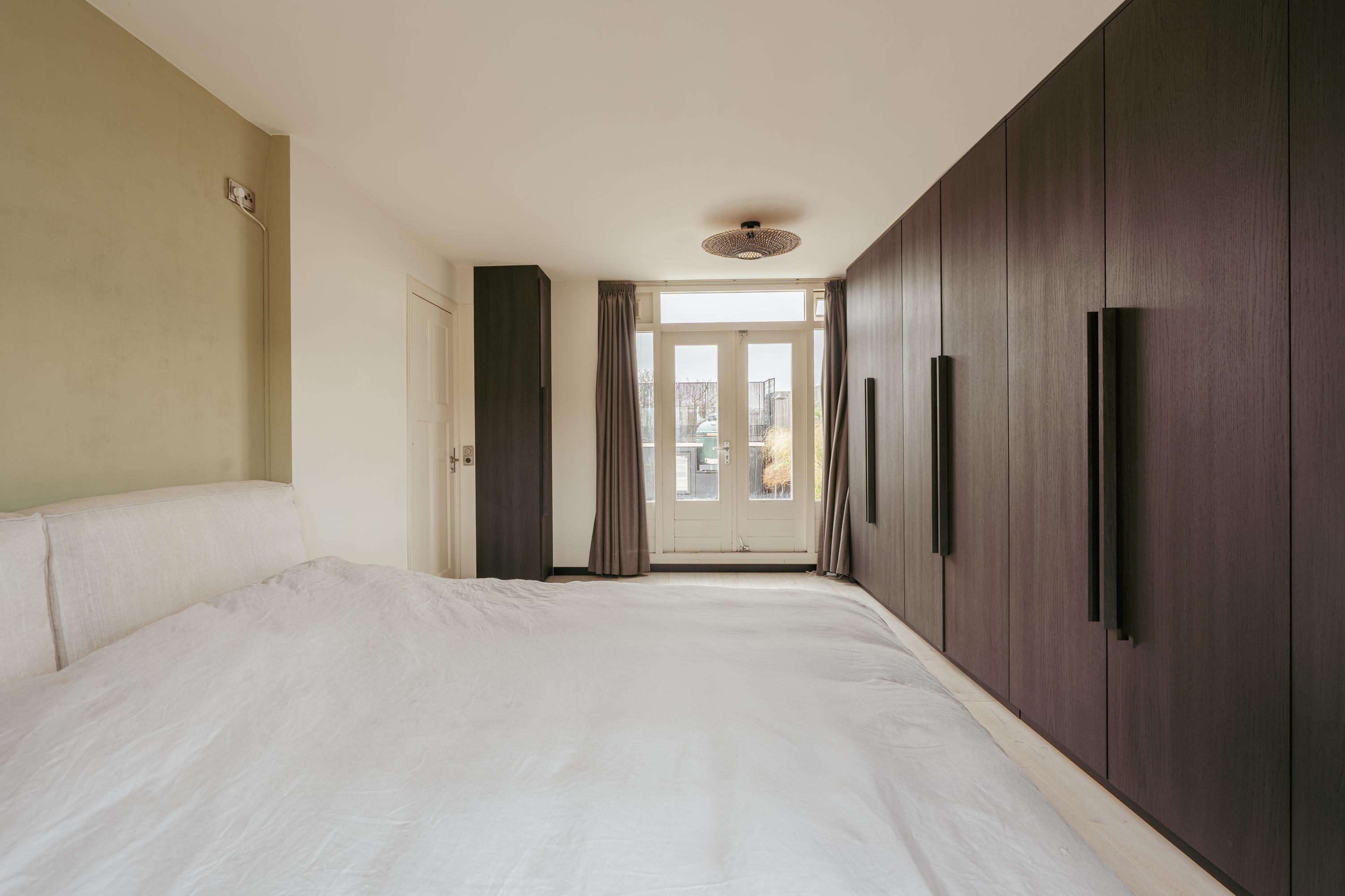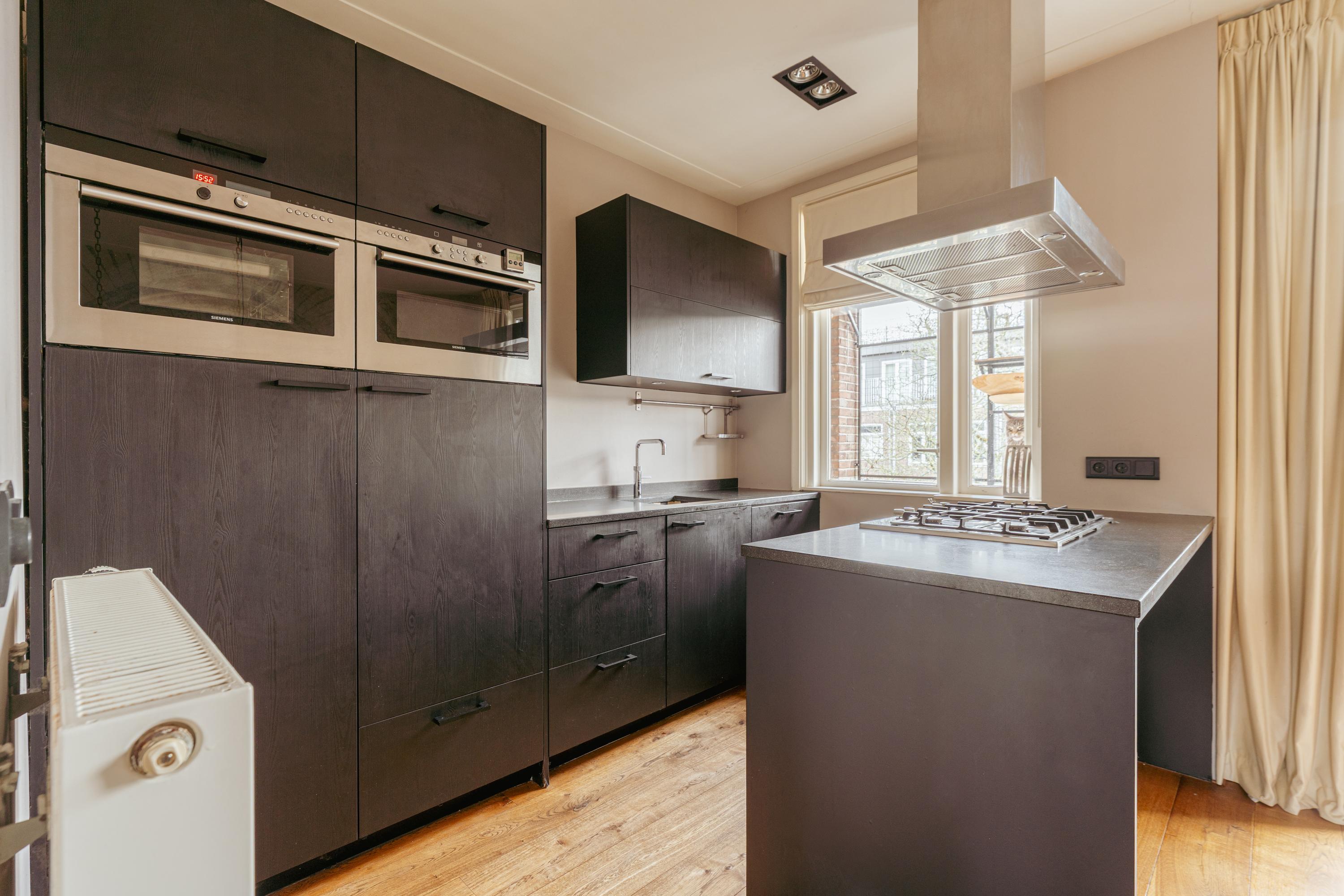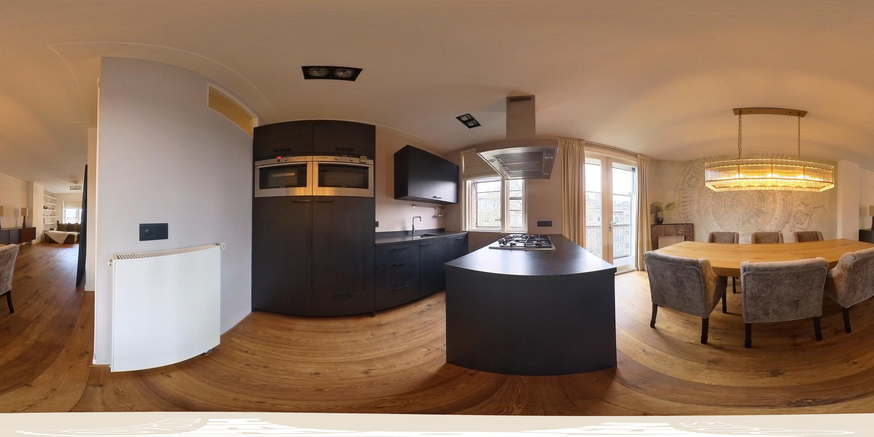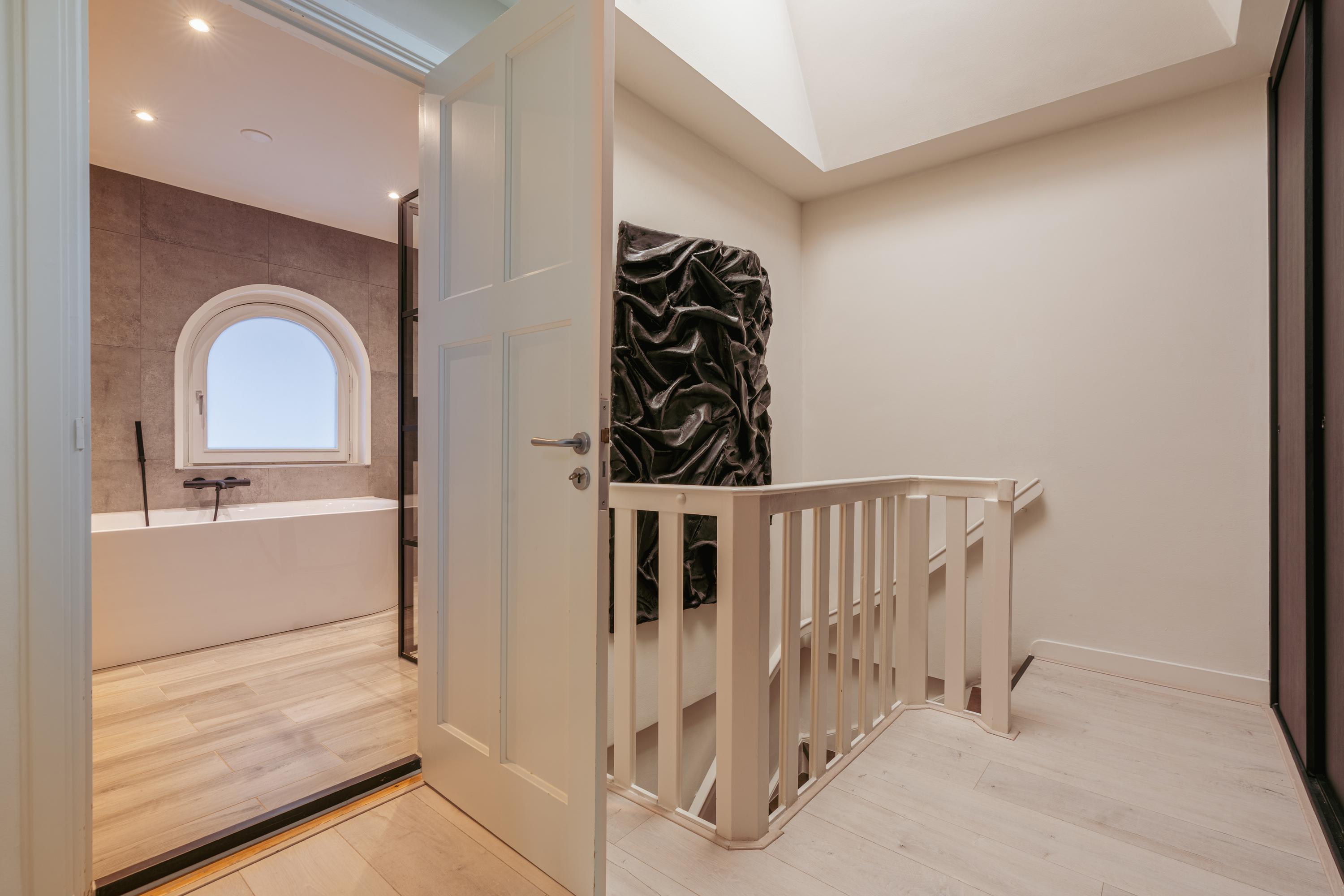 The spacious living area forms the heart of the apartment: an impressive L-shaped living room extending from the front to the rear of the property. Large windows at the front provide beautiful natural light. French doors open onto a charming balcony with open views over the lively Stadionplein. The generous layout offers various possibilities for furnishing and arrangement.