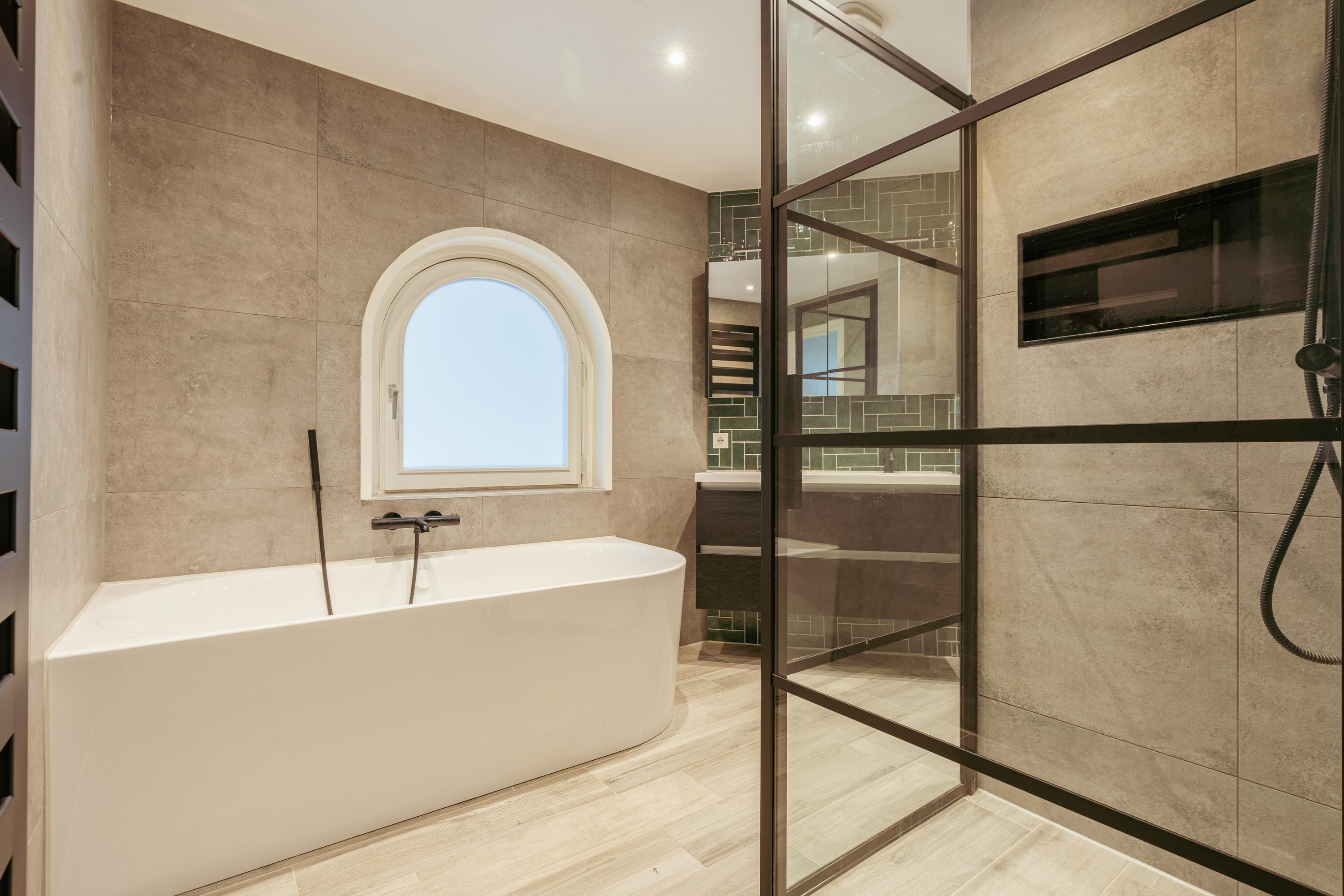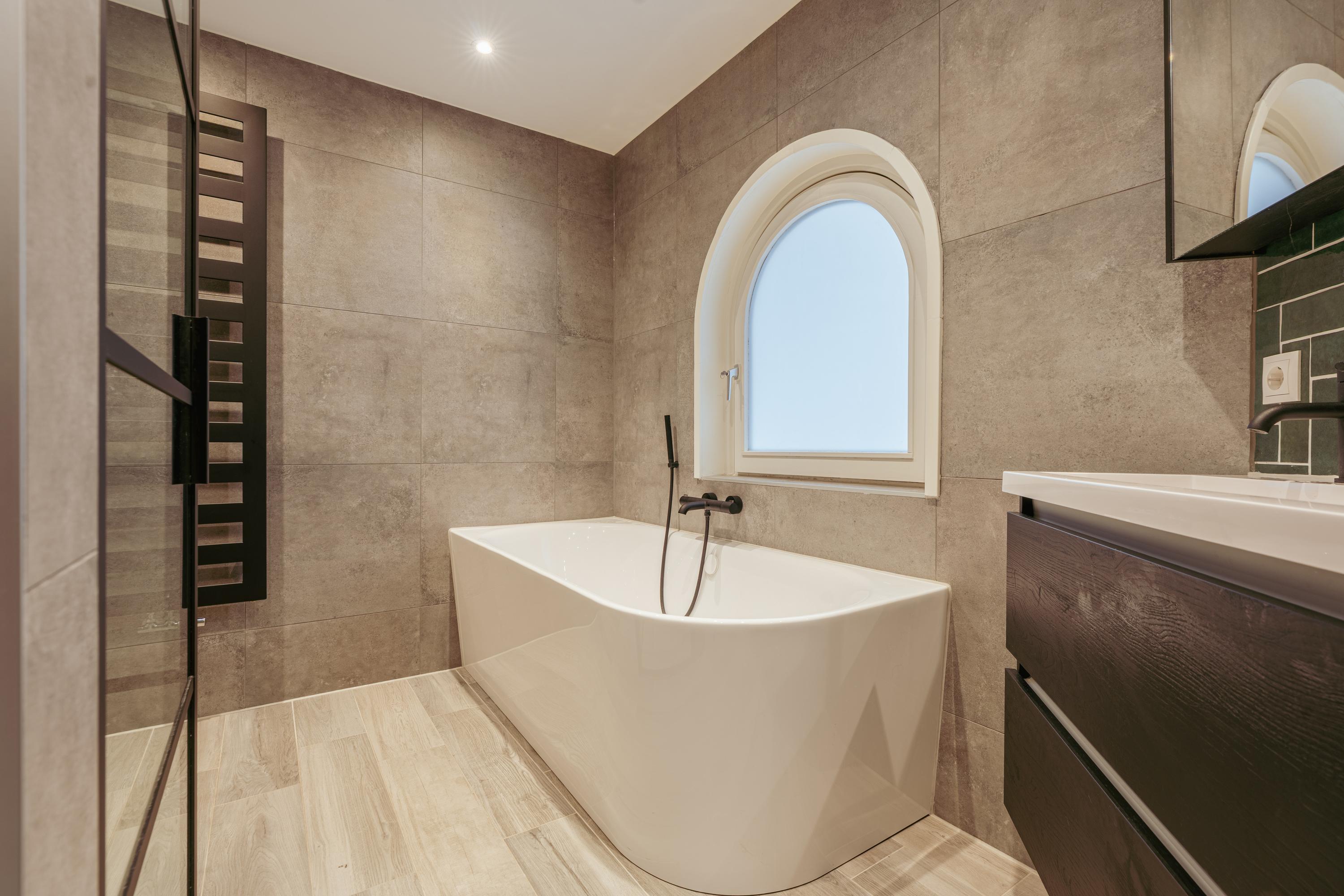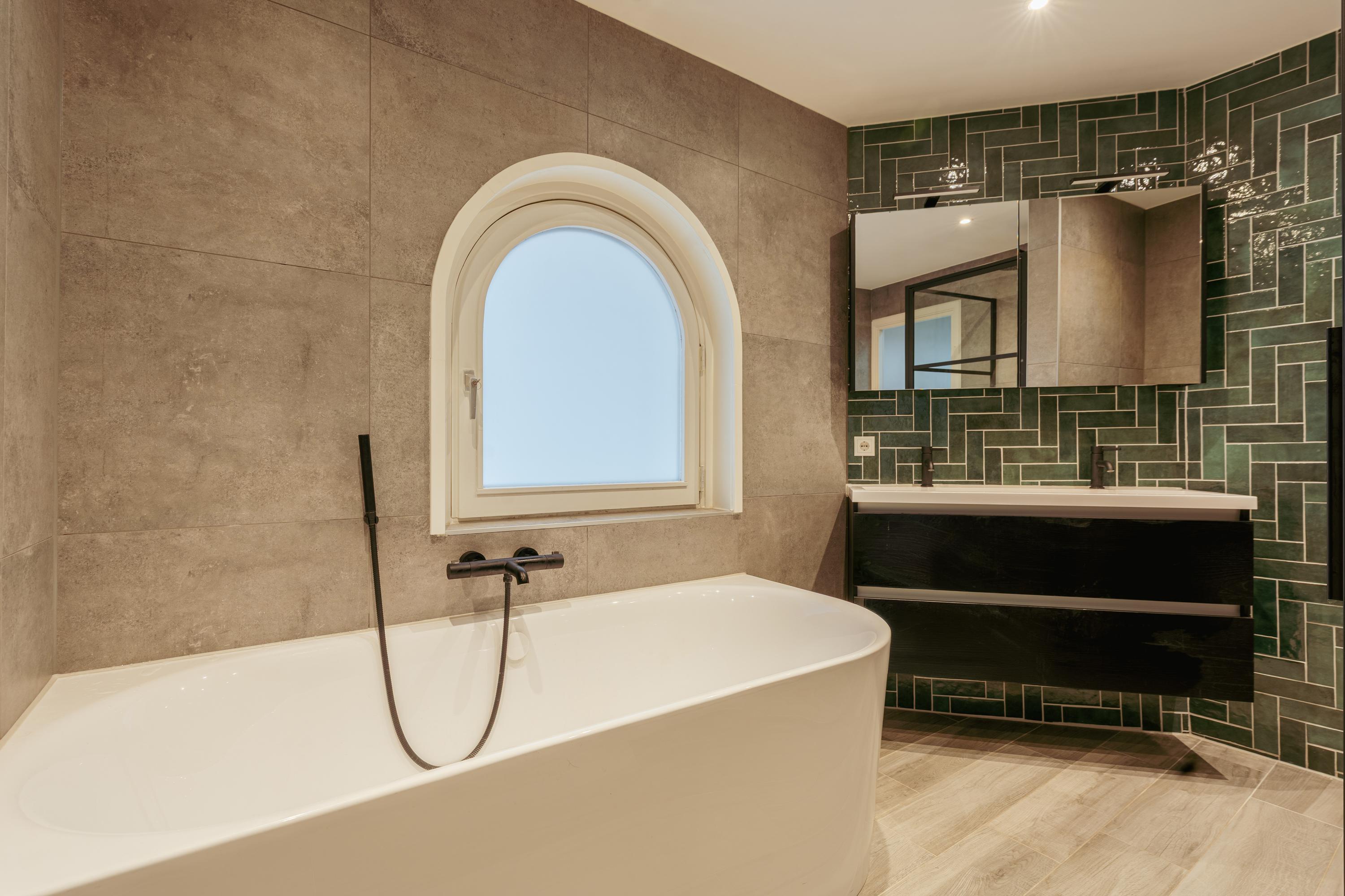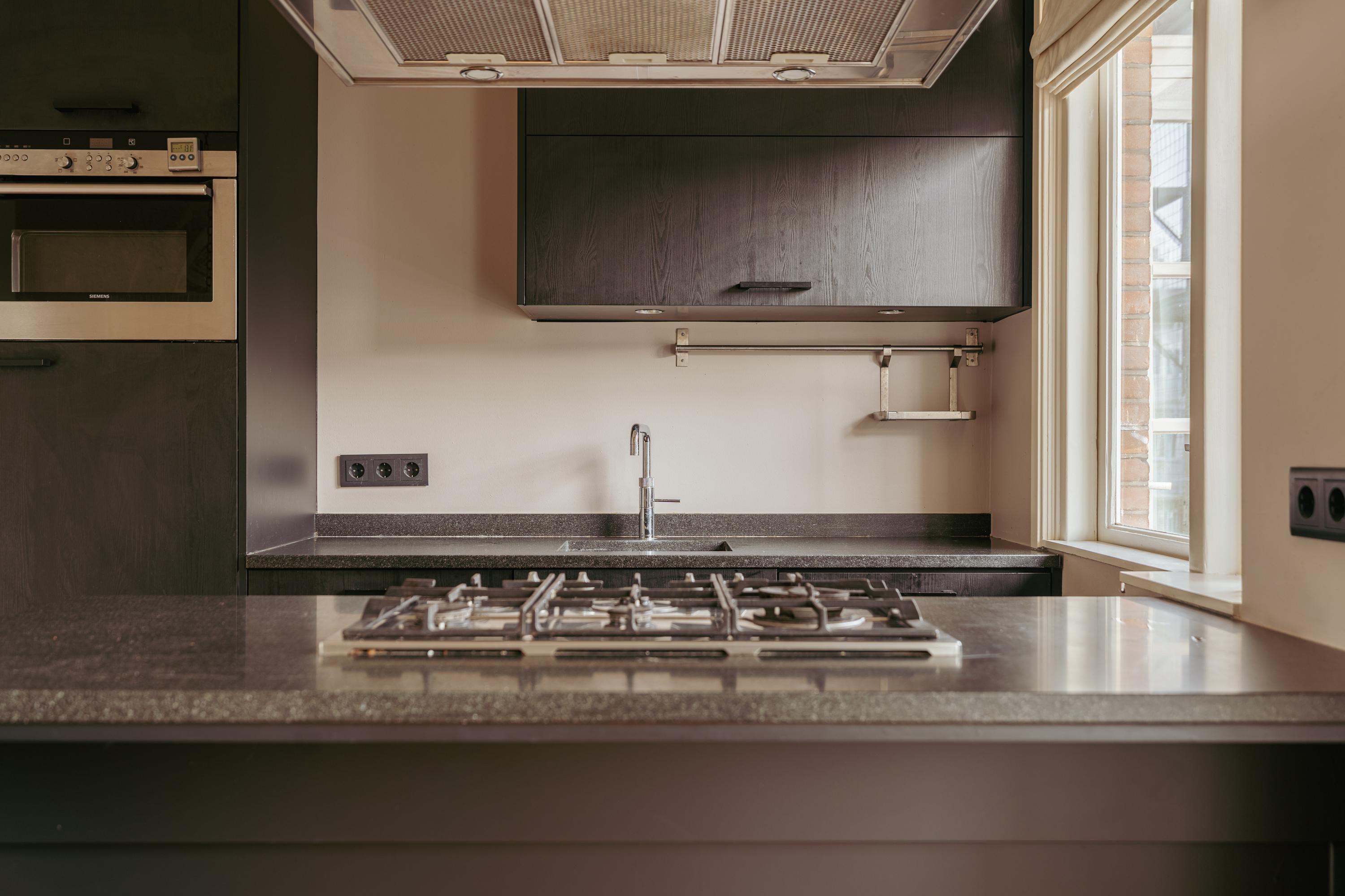 The spacious living area forms the heart of the apartment: an impressive L-shaped living room extending from the front to the rear of the property. Large windows at the front provide beautiful natural light. French doors open onto a charming balcony with open views over the lively Stadionplein. The generous layout offers various possibilities for furnishing and arrangement.