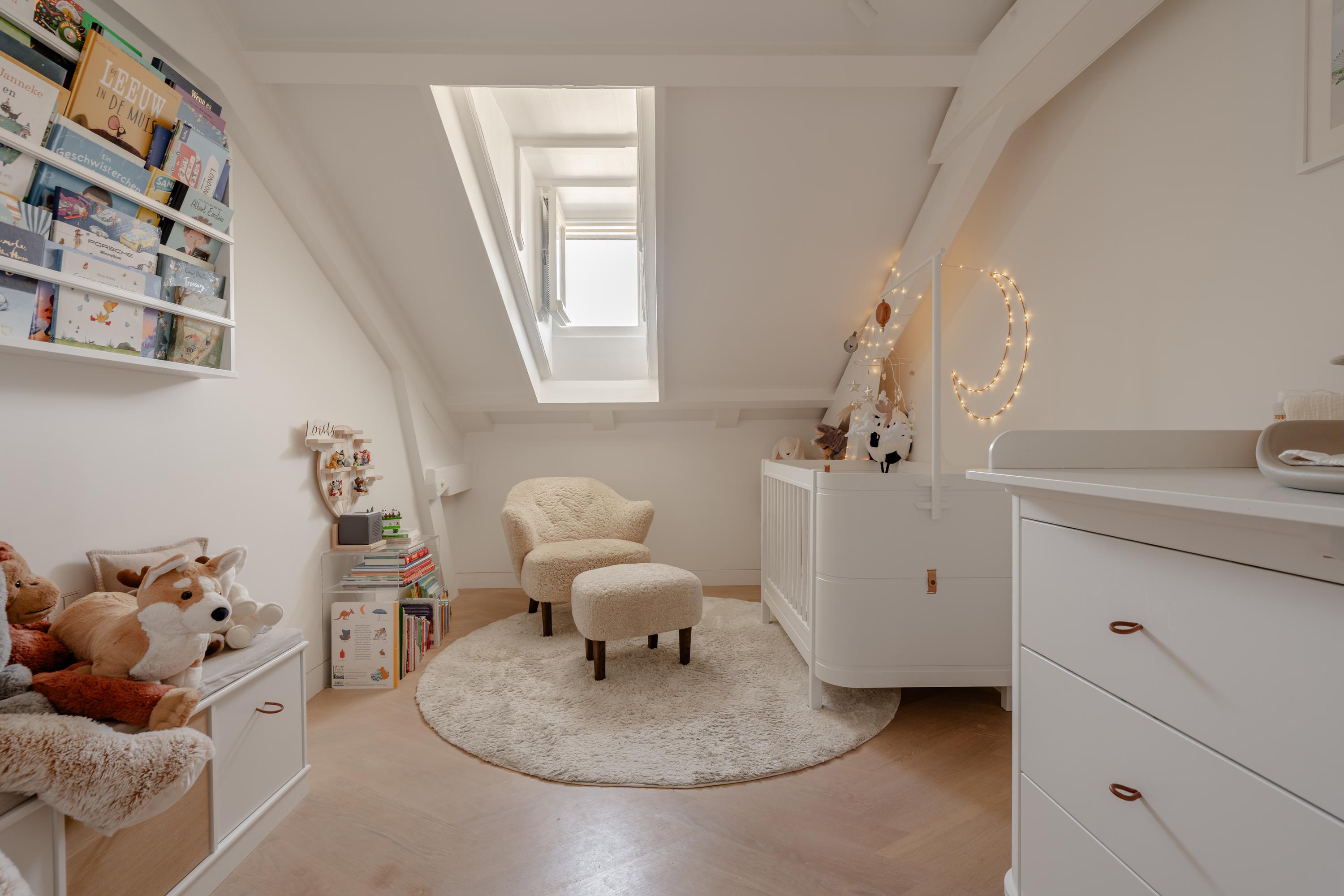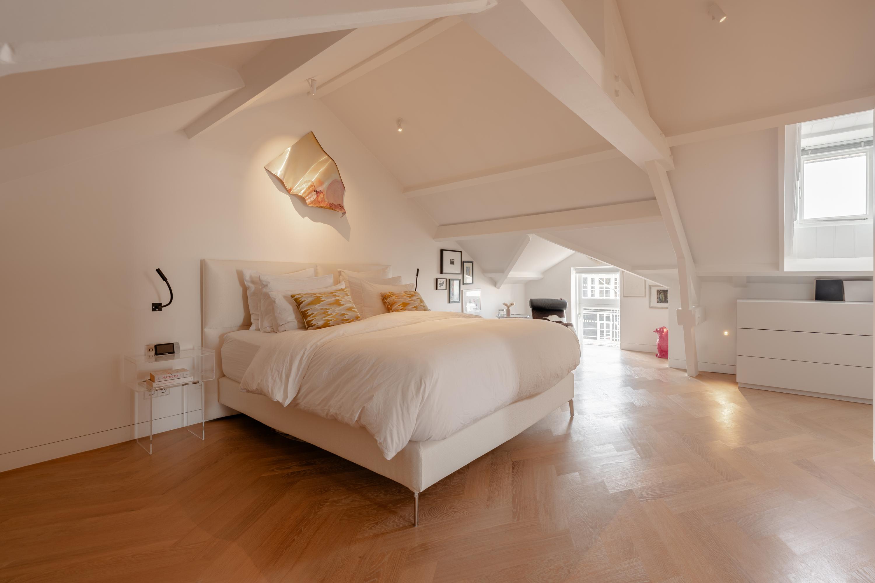 Thanks to the large windows, the space is filled with natural light and offers beautiful views over the characteristic rooftops of Oud-West, creating an open and serene living experience. The kitchen is equipped with high-end Siemens built-in appliances, an induction hob, Quooker tap, and a wine climate cabinet. Integrated air conditioning completes the comfort.
