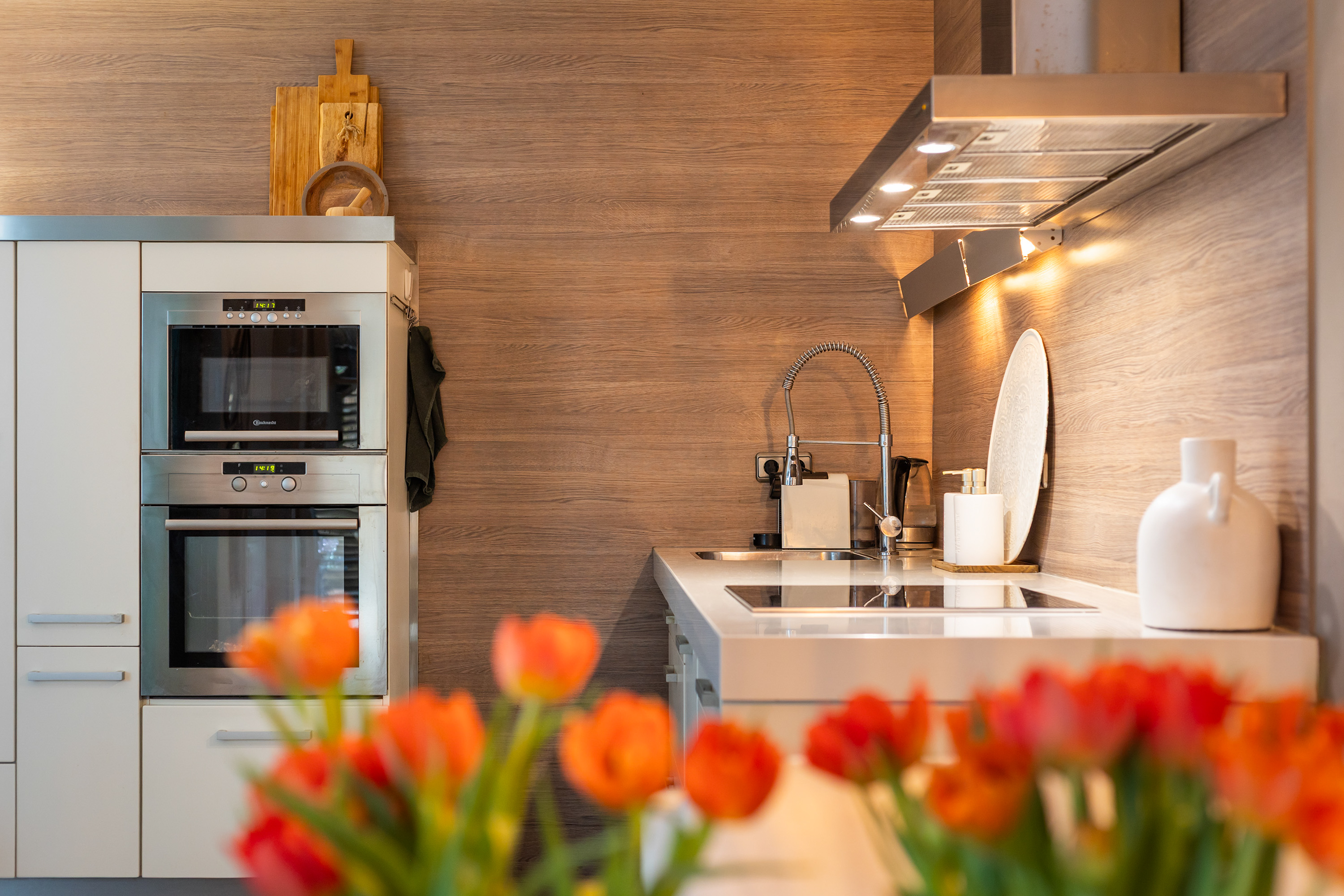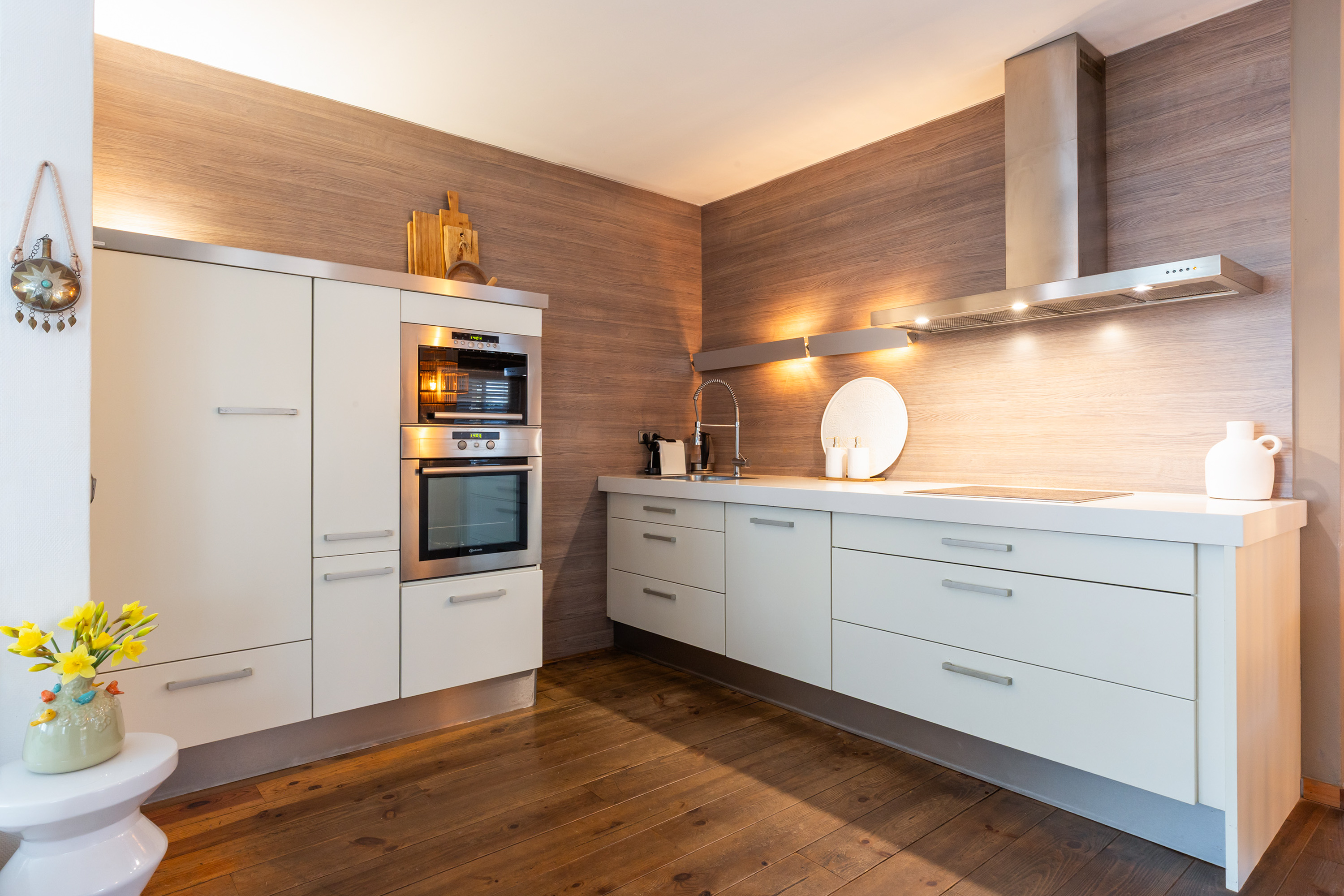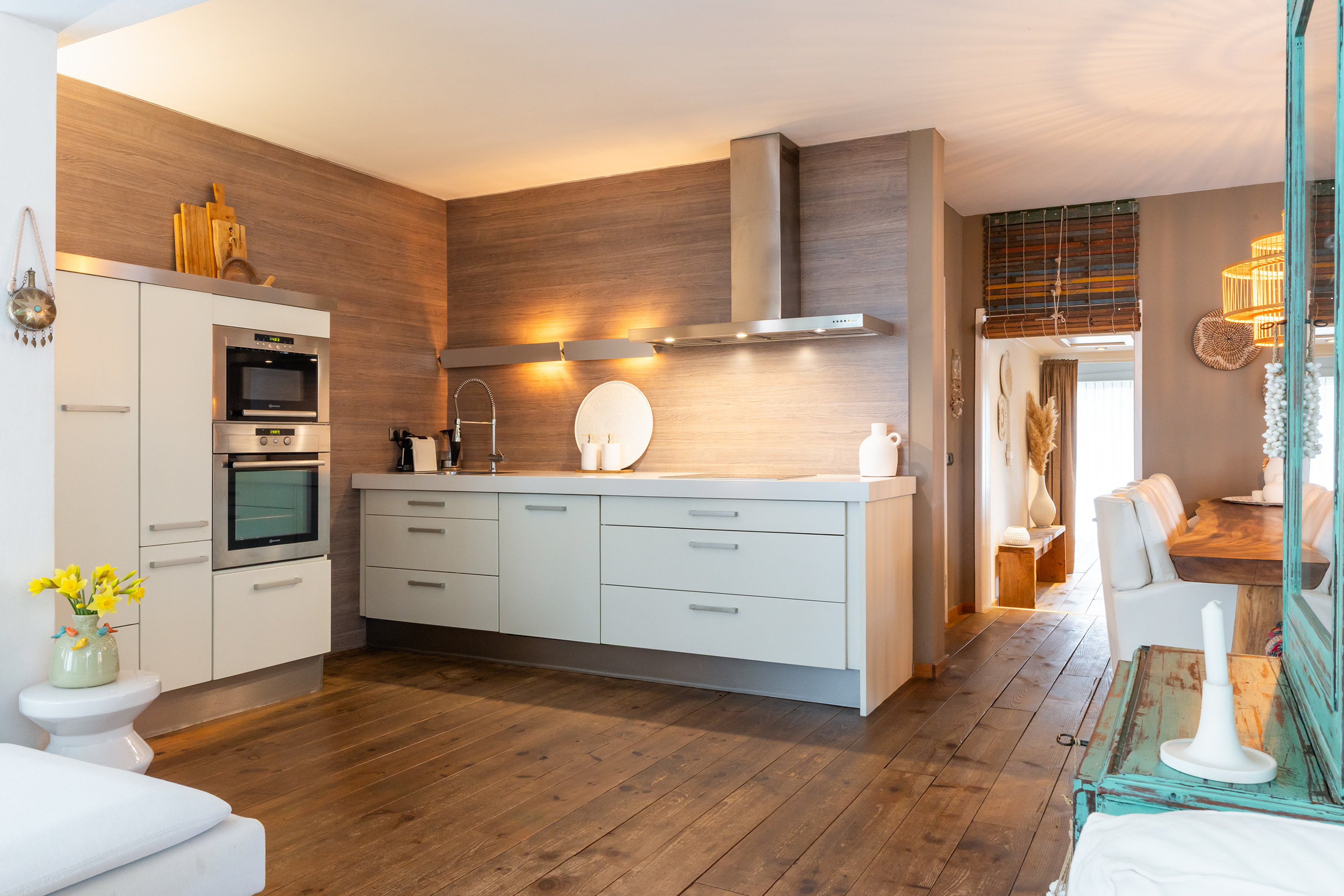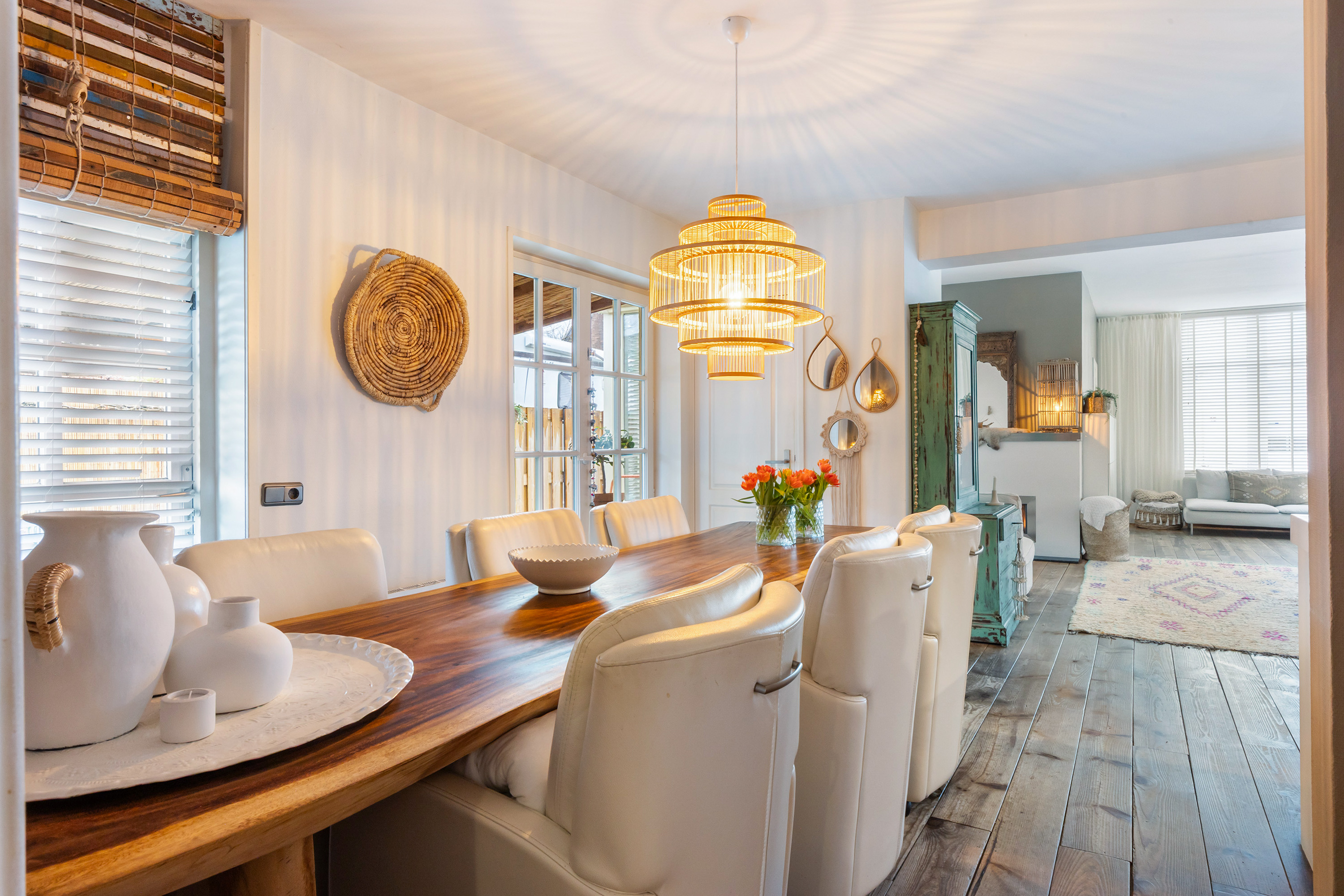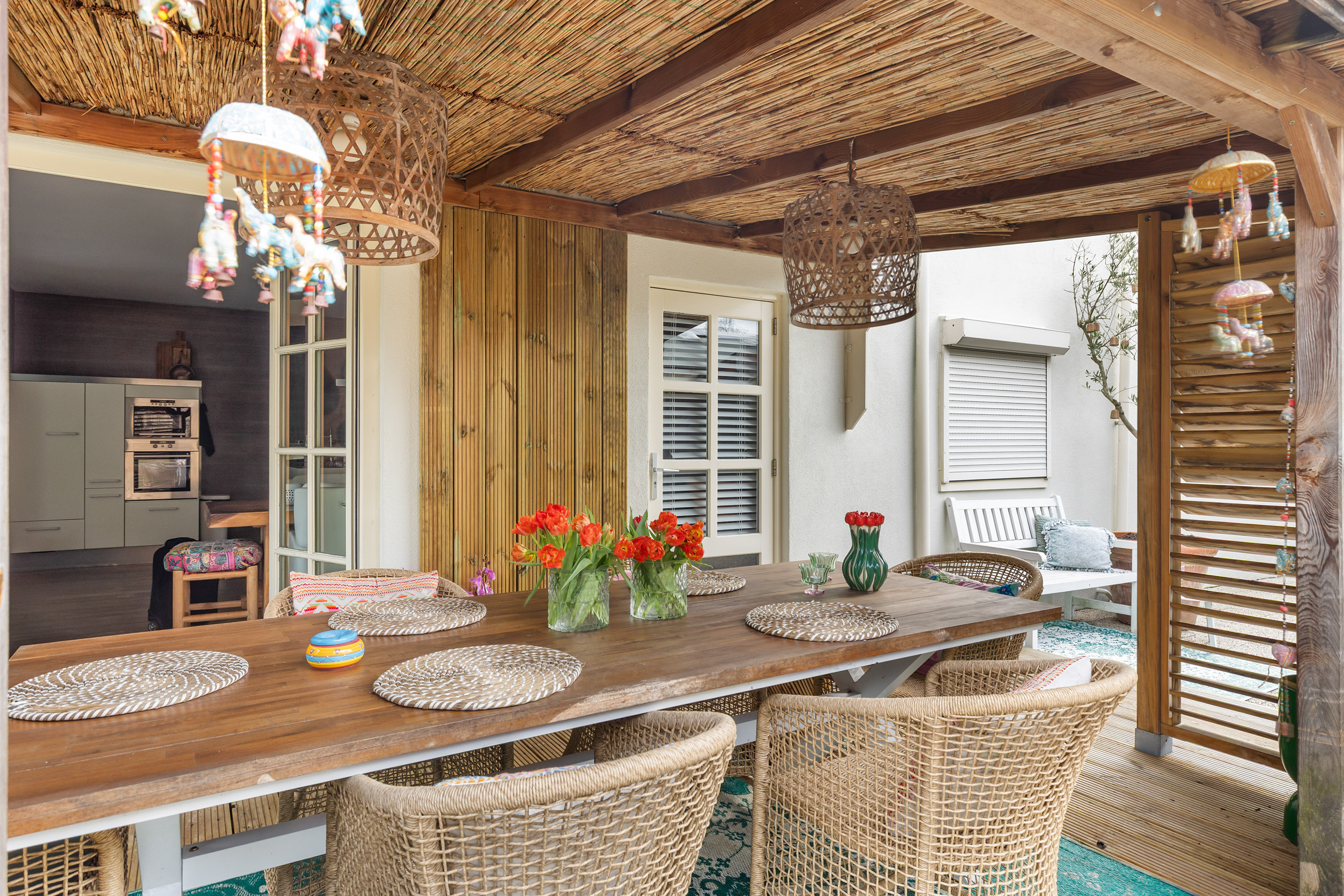 There is ample space for a large dining table with eight chairs, and the double French doors connect the kitchen directly with the veranda in the side garden. This creates a seamless transition between indoor and outdoor living. The veranda has a sunny appearance thanks to the wooden decking and wooden louvre screens which also serve as sun protection. It is an ideal place for outdoor dining and enjoying time with friends and family.