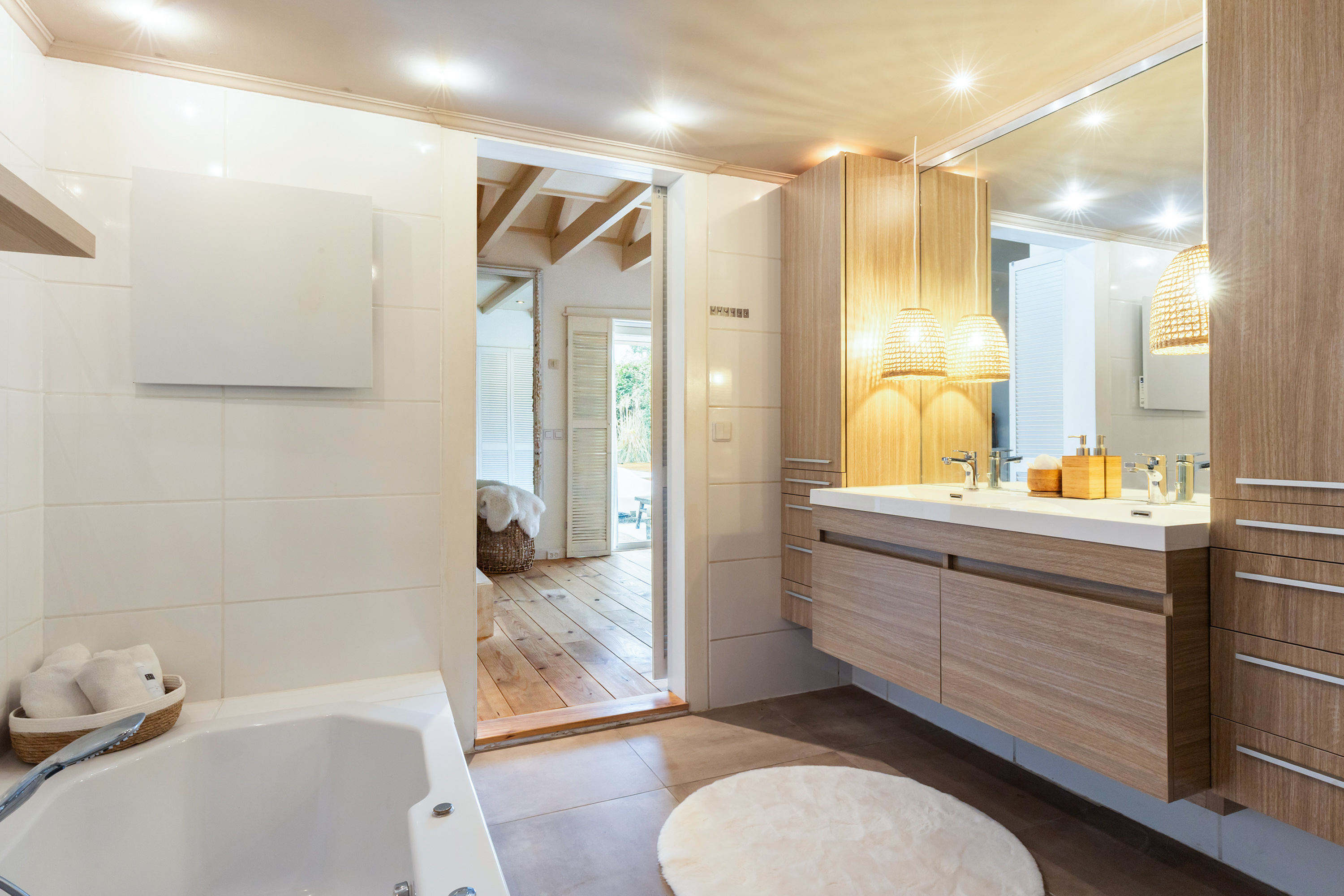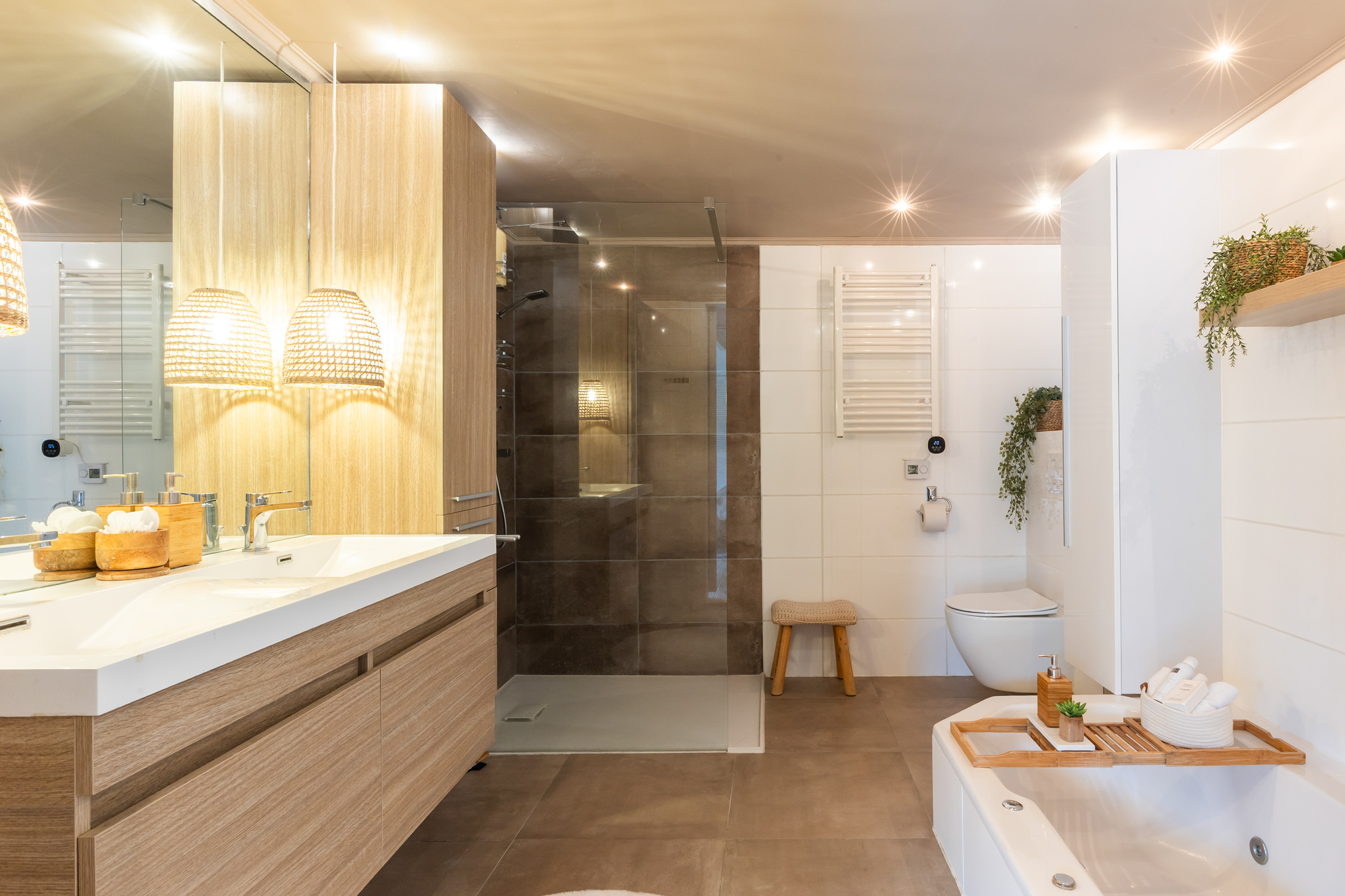 Adjacent is the modern bathroom featuring a sunken bathtub, a spacious walk-in shower, a wall-mounted toilet and double washbasins. The walls are fully tiled and the room has a warm, contemporary finish.