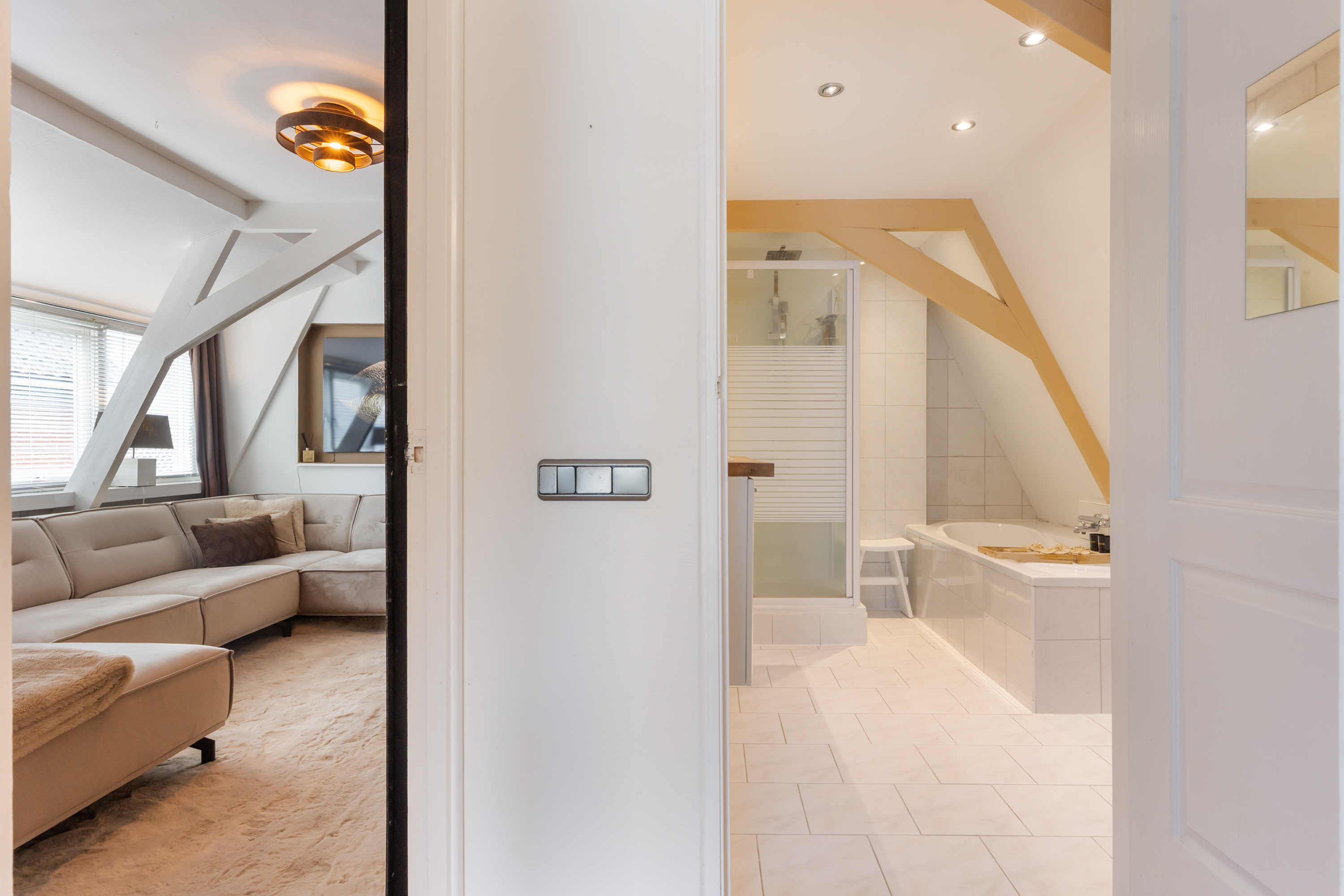 Throughout this level the original beams, sloping ceilings, wide dormer windows and wooden floors have been preserved, giving the spaces a warm and authentic character.