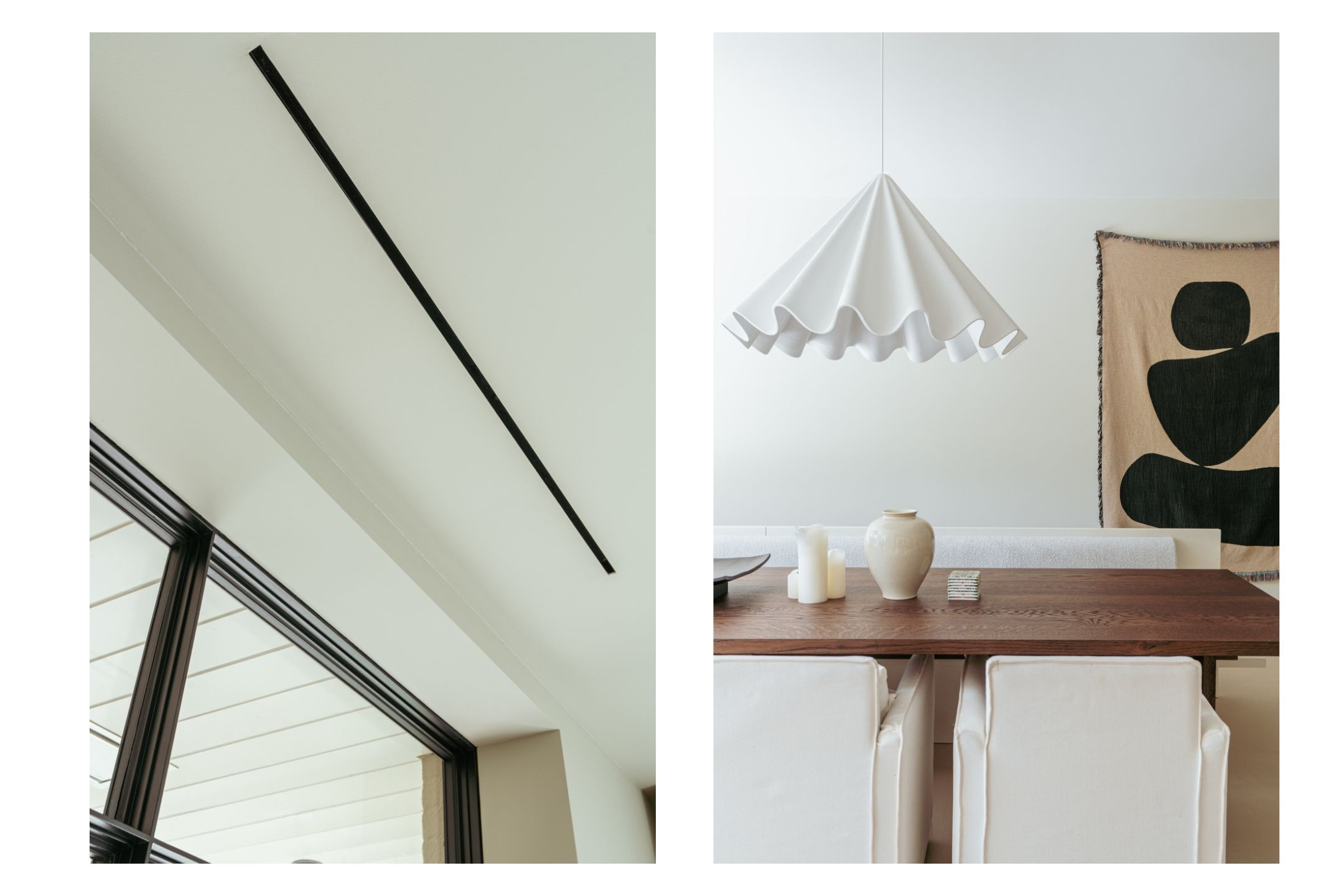 The expansive living room, featuring floor-to-ceiling windows and a stunning round bay window, is bathed in natural light, instantly creating a sense of space and tranquillity. The elegant fireplace forms a central feature of the open-plan living area, which flows seamlessly into the luxurious kitchen. The kitchen is equipped with high-end built-in appliances and modern conveniences, including a generous island of approx. 5 metres, Quooker tap, dishwasher, fridge/freezer combination, and an induction hob with integrated extractor. The exclusive book-matched marble worktop extends into the sink, giving the kitchen a refined and sophisticated finish. French steel doors open onto the delightful covered terrace and beautifully landscaped garden. Adjoining the kitchen is the spacious dining room.