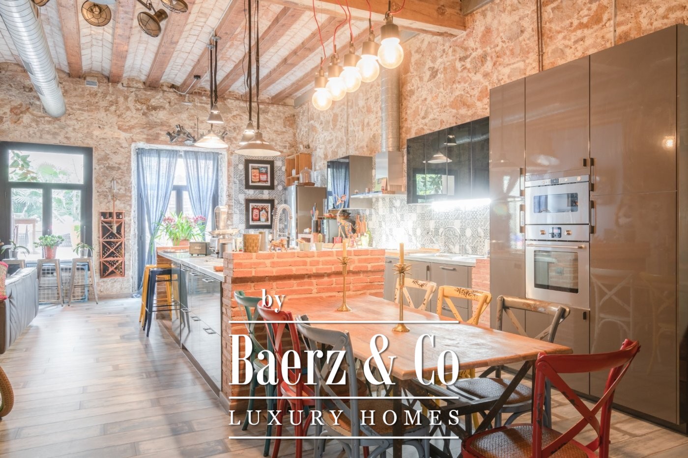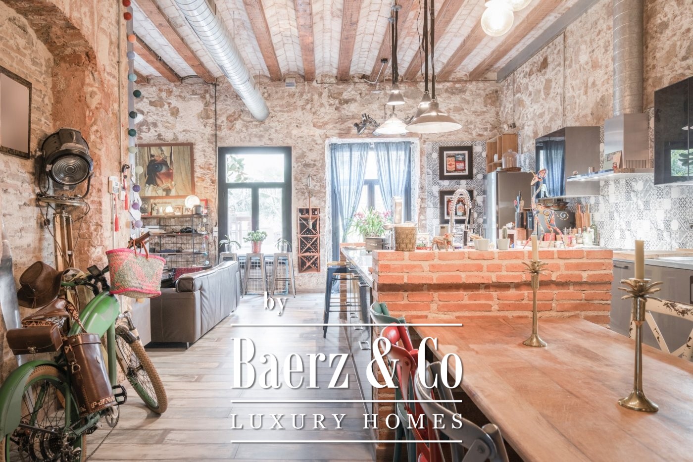 . . This catalan style apartment consists of 218 m2 plus 74 m2 of private terrace with pool. Upon entering, we find a corridor with huge windows that overlooks a large interior patio offering the space plenty of natural light. Ithis area connects the three double bedrooms; each one with its private bathroom, and another room that acts as a large multifunctional space that can perfectly be used as an office space.. . Following the corridor we find the day area, a huge and spacious space with very high ceilings up to 5 meters, composed of a large open kitchen, original brick walls and tiles, a toilet and a beautiful living room with a (wood) fireplace from which you can access the wonderful terrace with a pool shared with the neighbour next door. The terrace is private and is recently restored with new roofing to guarantee privacy. The whole house was completely renovated keeping original elements and decorated with great