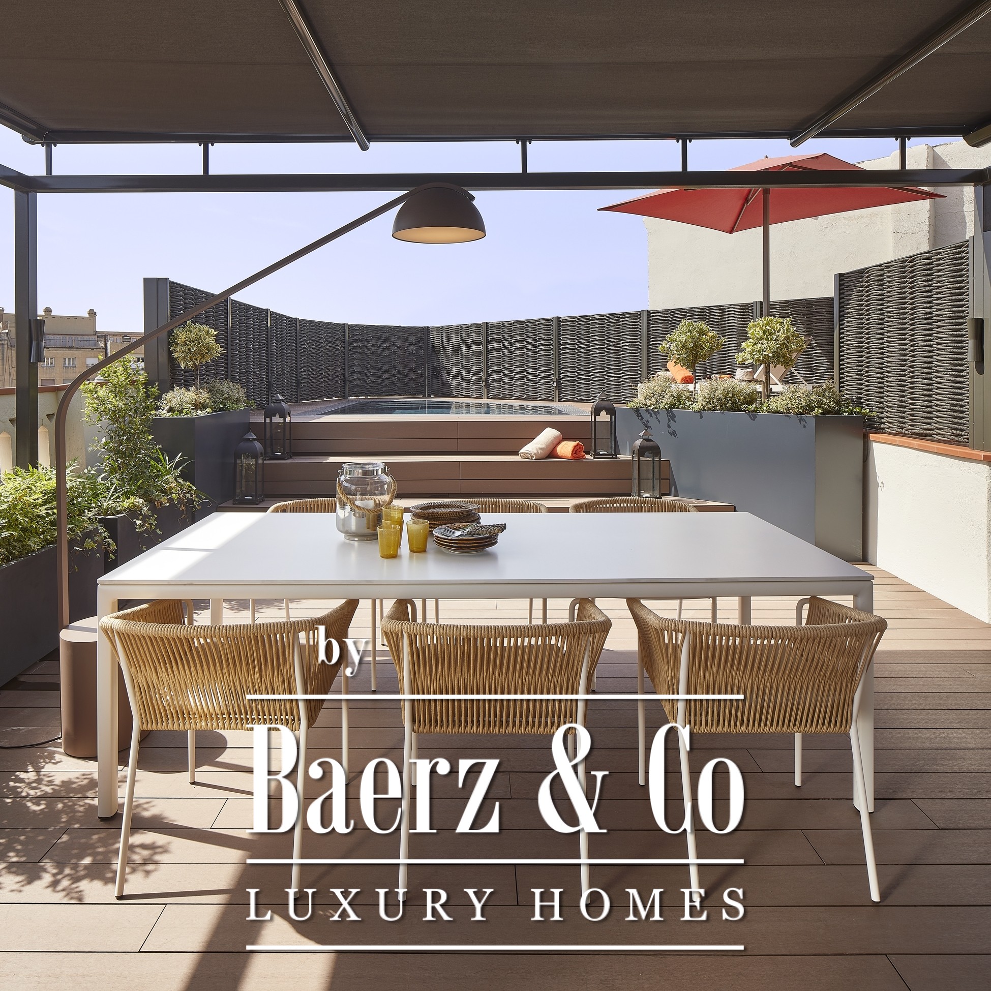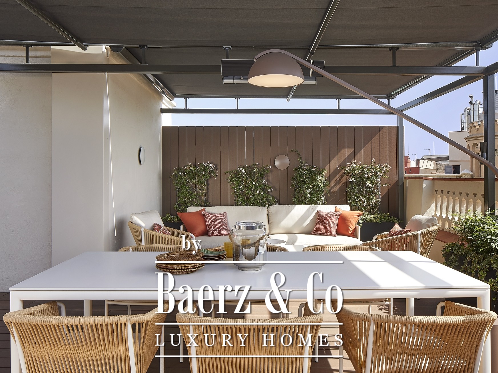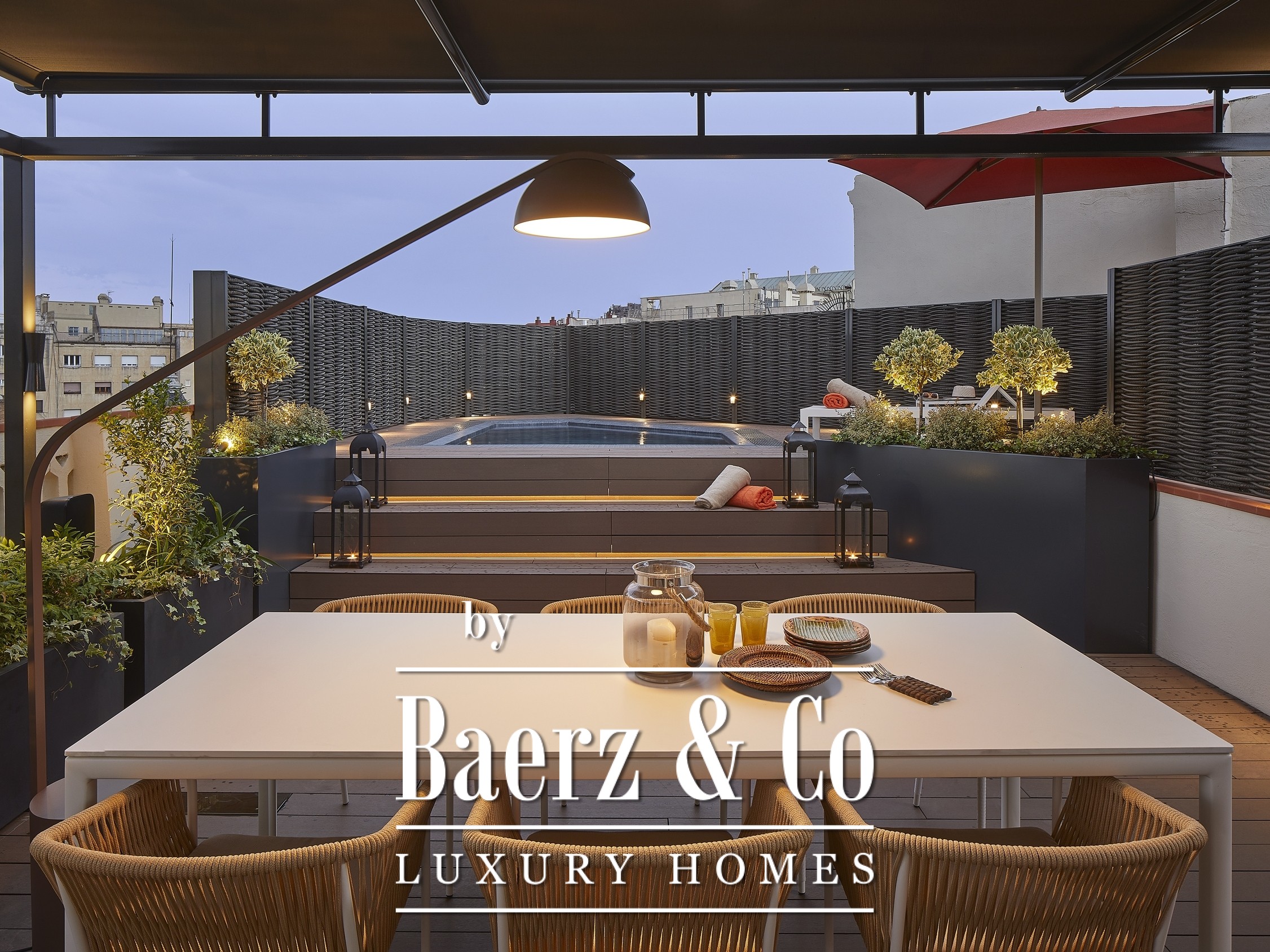 Penthouse Barcelona represents a rare convergence of classic architectural heritage and refined contemporary living. This meticulously renovated penthouse, set within an elegant corner building in the Eixample district, commands attention with 274 m² of living space anchored by a remarkable 100 m² private terrace. Sunlight pours through six exterior balconies, illuminating an open-plan interior where the living room, dining area, and designer kitchen flow seamlessly together. The penthouse Barcelona experience is further enhanced by a bespoke studio and a sculptural staircase ascending to the crown jewel of the home—an expansive rooftop oasis.