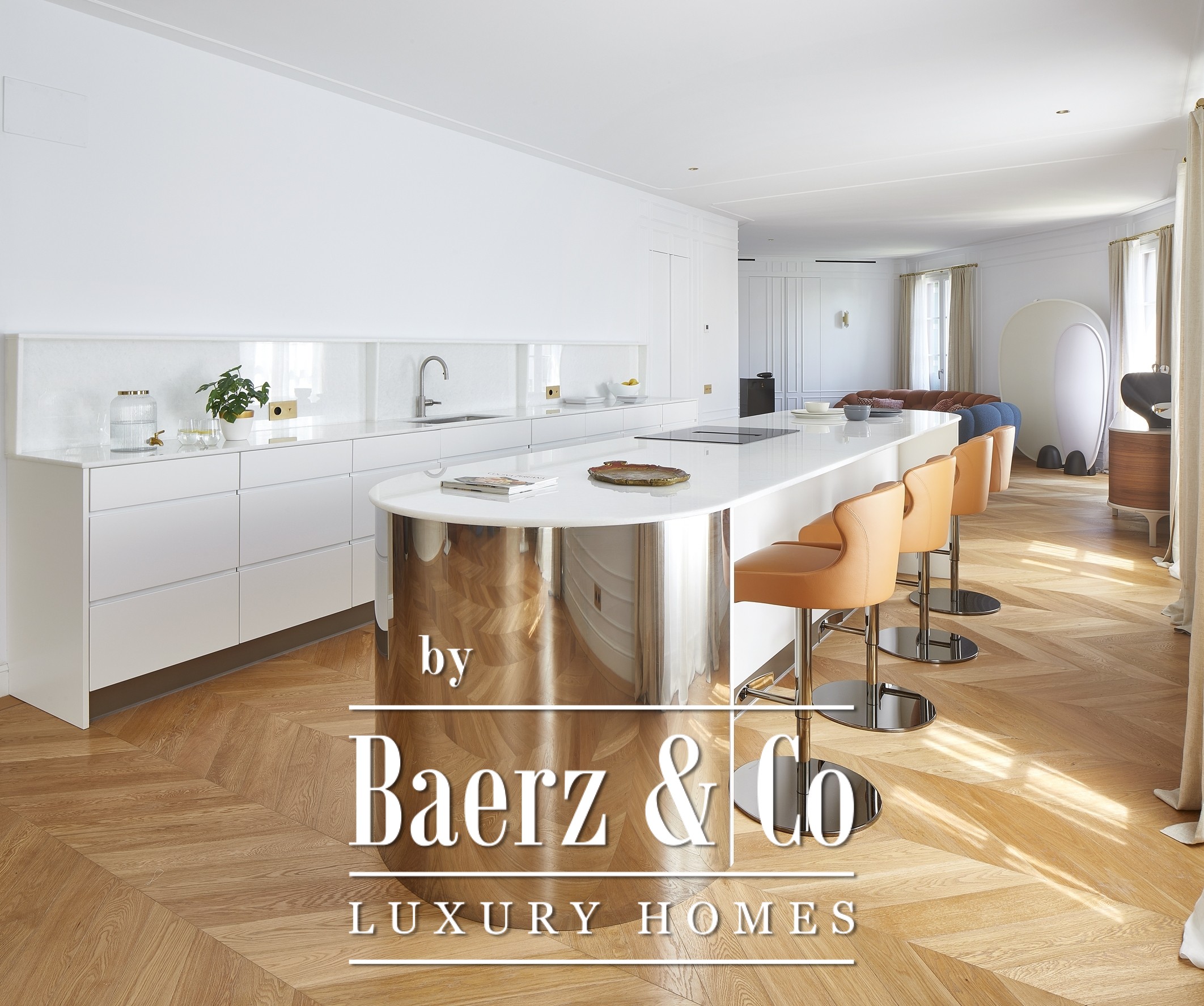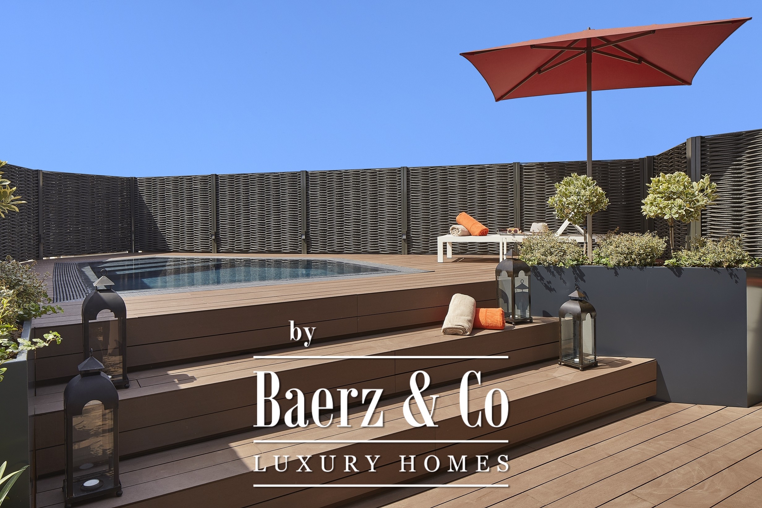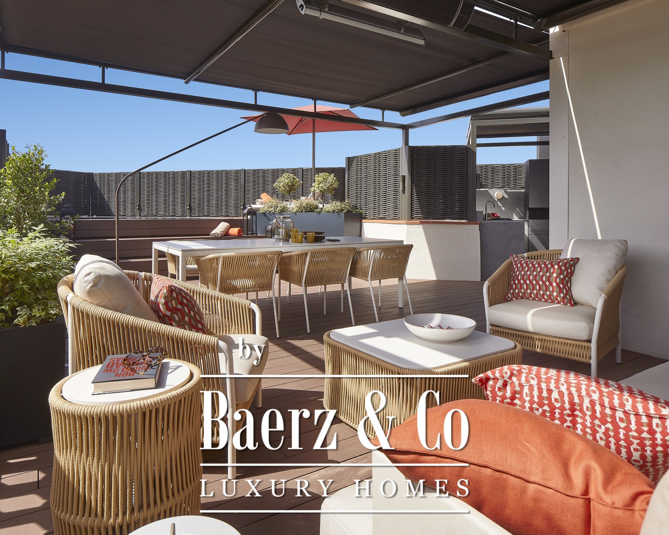 Penthouse Barcelona represents a rare convergence of classic architectural heritage and refined contemporary living. This meticulously renovated penthouse, set within an elegant corner building in the Eixample district, commands attention with 274 m² of living space anchored by a remarkable 100 m² private terrace. Sunlight pours through six exterior balconies, illuminating an open-plan interior where the living room, dining area, and designer kitchen flow seamlessly together. The penthouse Barcelona experience is further enhanced by a bespoke studio and a sculptural staircase ascending to the crown jewel of the home—an expansive rooftop oasis.