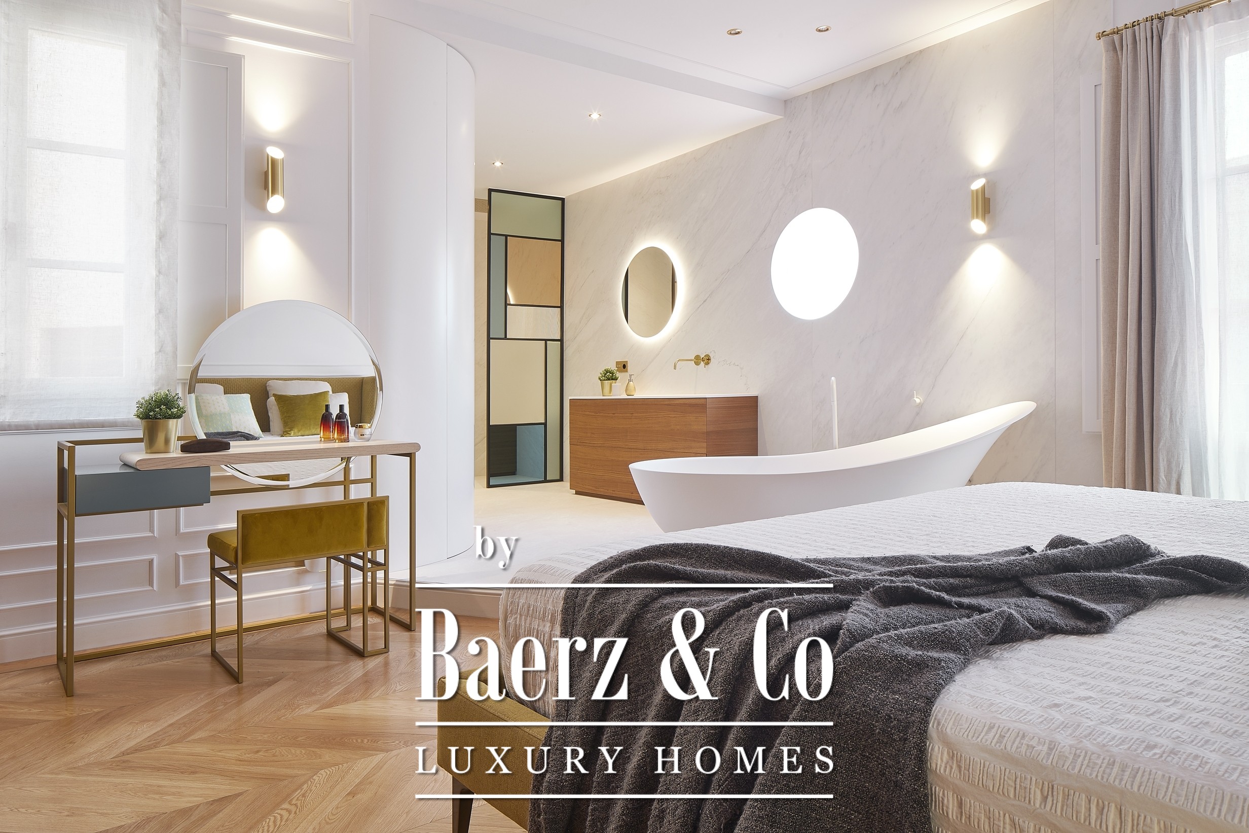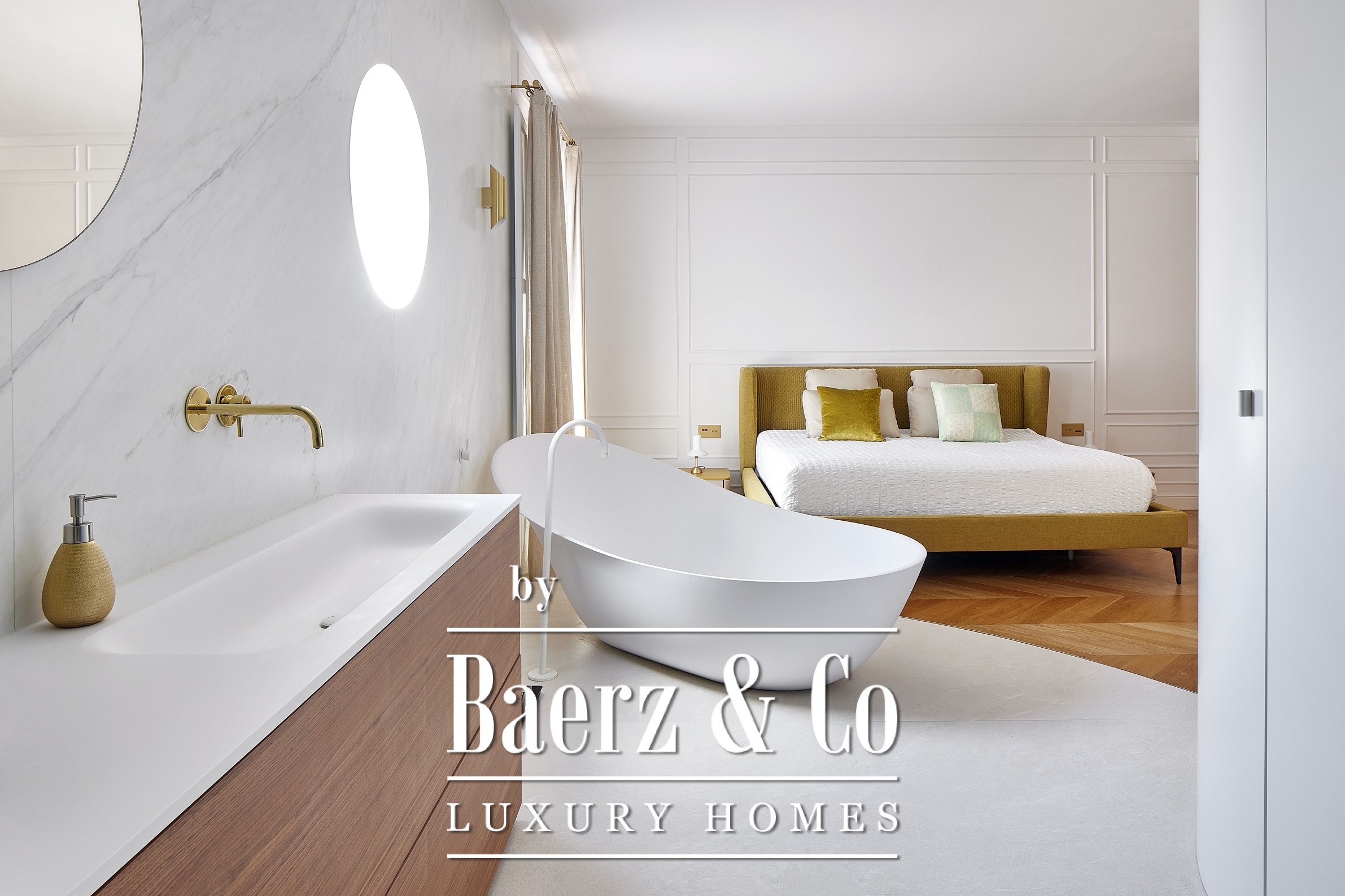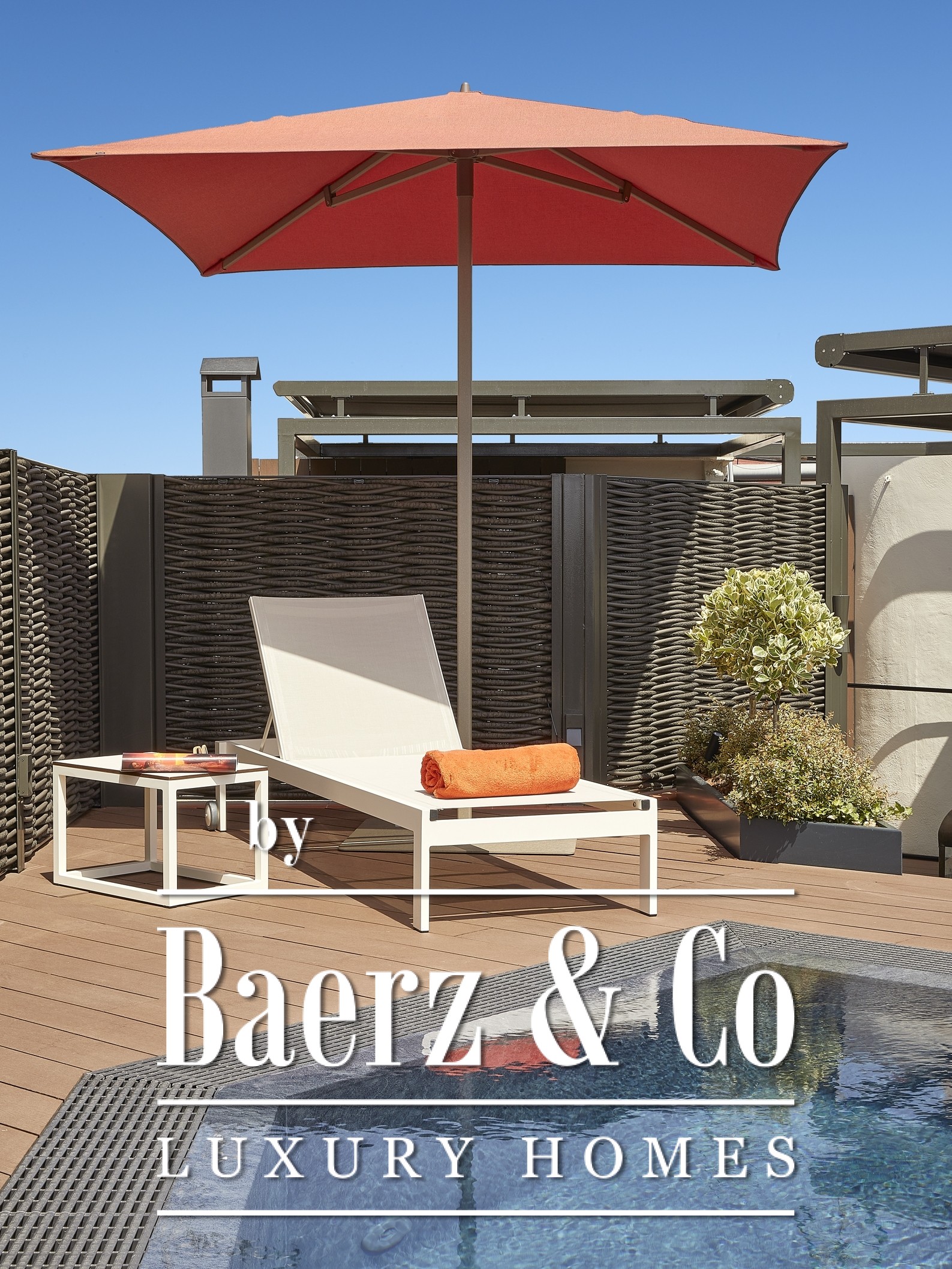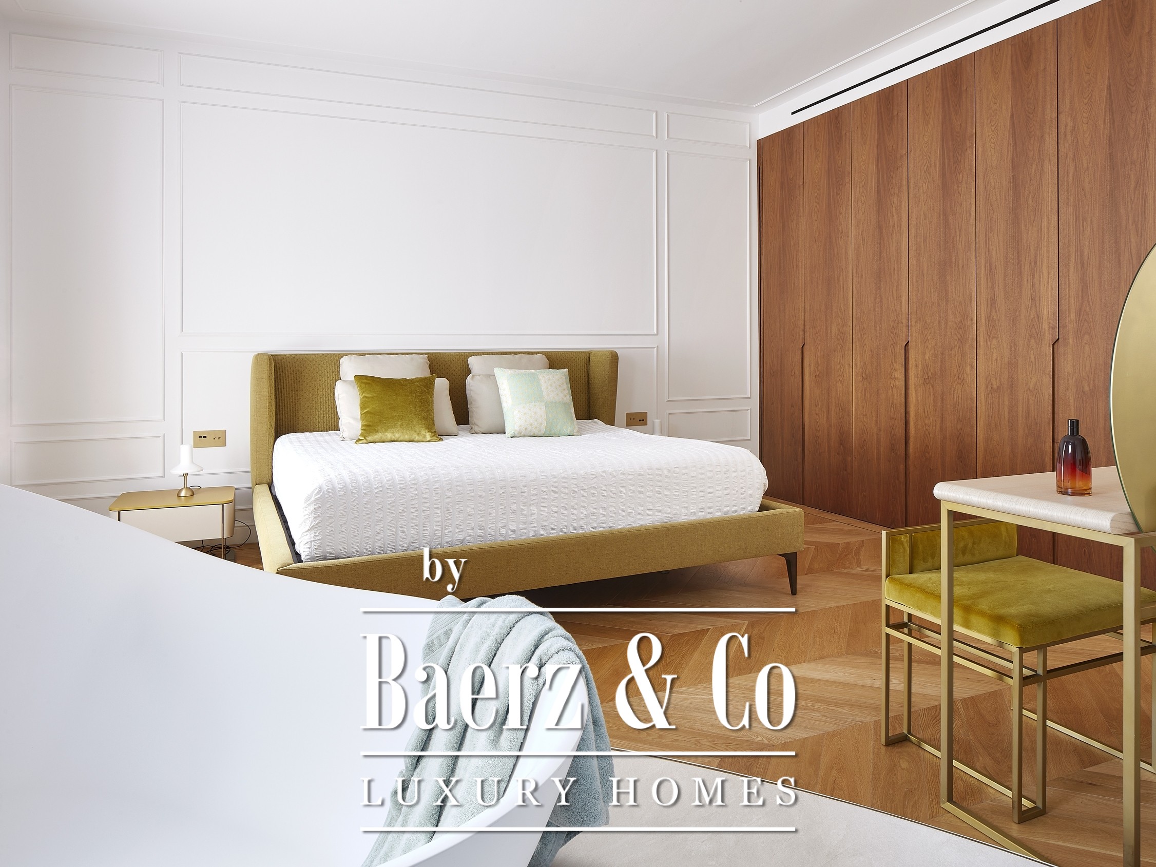 This private terrace, optimally oriented for sun year-round, features a summer kitchen, al fresco dining, secluded chill-out zones, and a private swimming pool, all designed for indulgence in Barcelona’s Mediterranean climate. Three en suite double bedrooms frame the sleeping quarters, each with built-in wardrobes and exterior views. The master suite offers a serene retreat, complemented by a marble-clad bathroom with large bathtub, separate shower, dressing area, and a luminous private balcony.