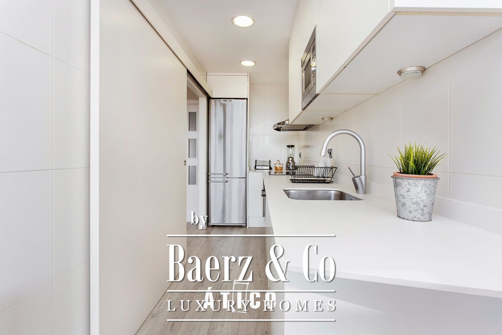 Inside, two bedrooms—one double and one single—suit couples or small families seeking a well-proportioned retreat. Parquet floors run throughout, with the living spaces oriented to catch the shifting Barcelona light and vistas of both the city and the distant mountains. The fully equipped kitchen and modern appliances reflect a considered approach to city living.