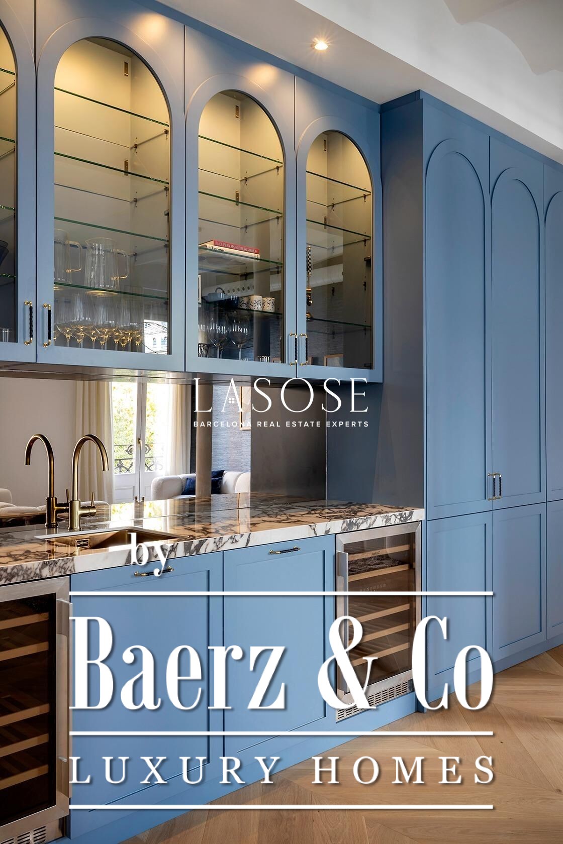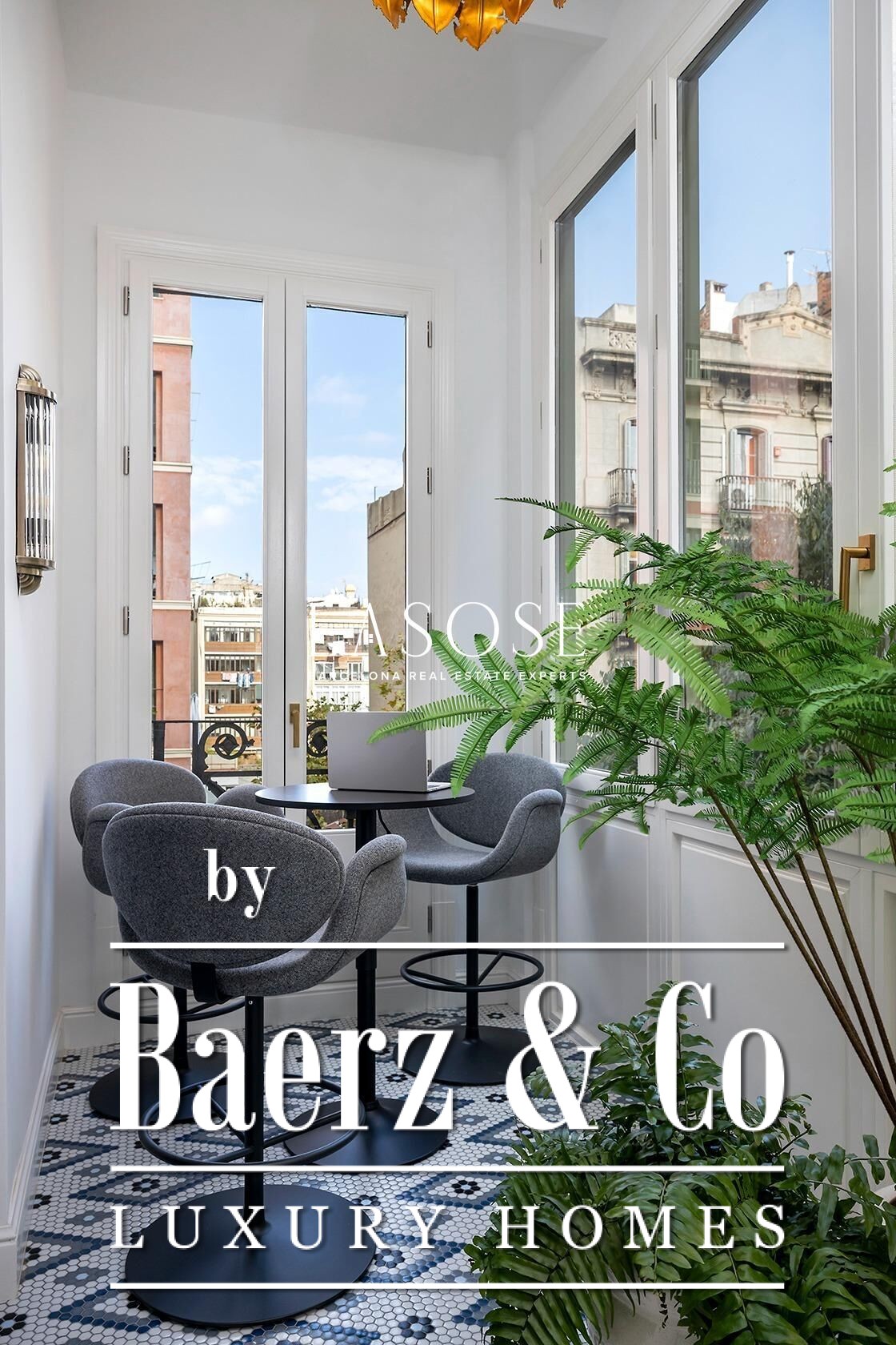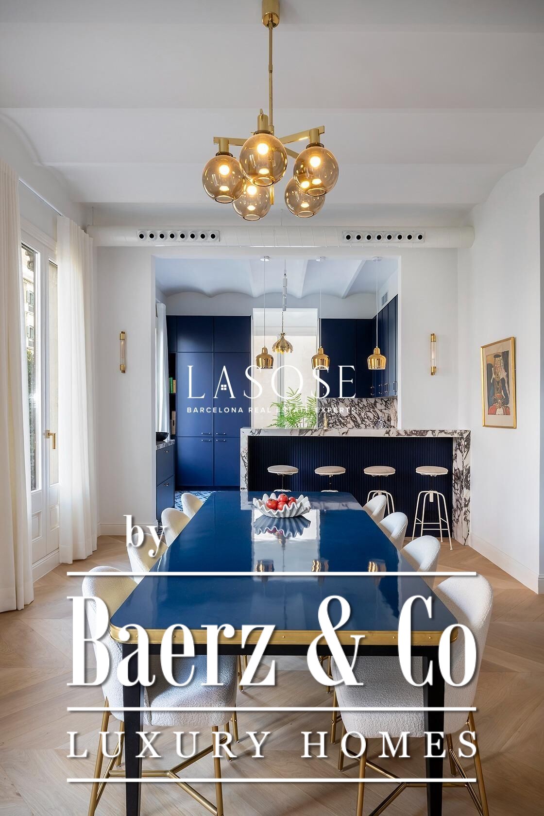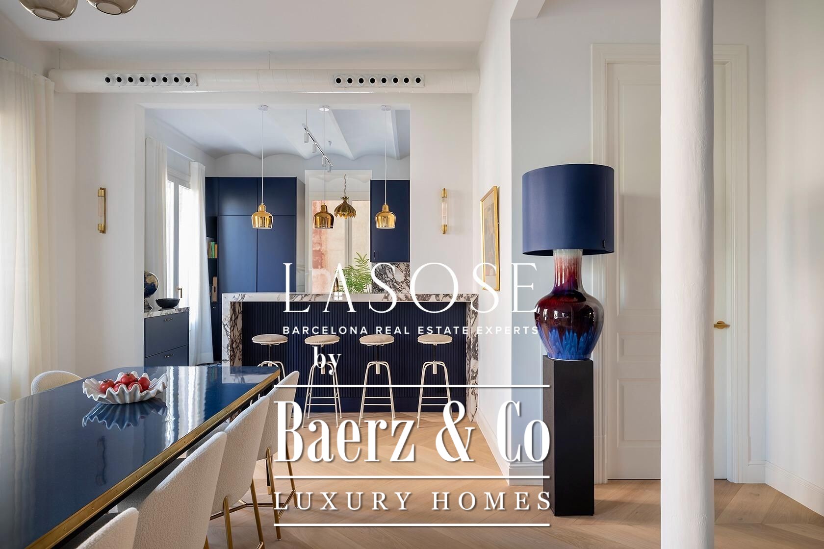 Apartment Barcelona stands as an invitation to refined urban living. This 199 m² residence on the third floor is newly renovated and thoughtfully designed to embrace natural light, with four balcony doors opening over Calle Girona and expansive windows enhancing the luminous atmosphere. The layout flows seamlessly from the open-plan kitchen and dining area to a living room anchored by a bespoke bar and pantry with two wine fridges and a second dishwasher.