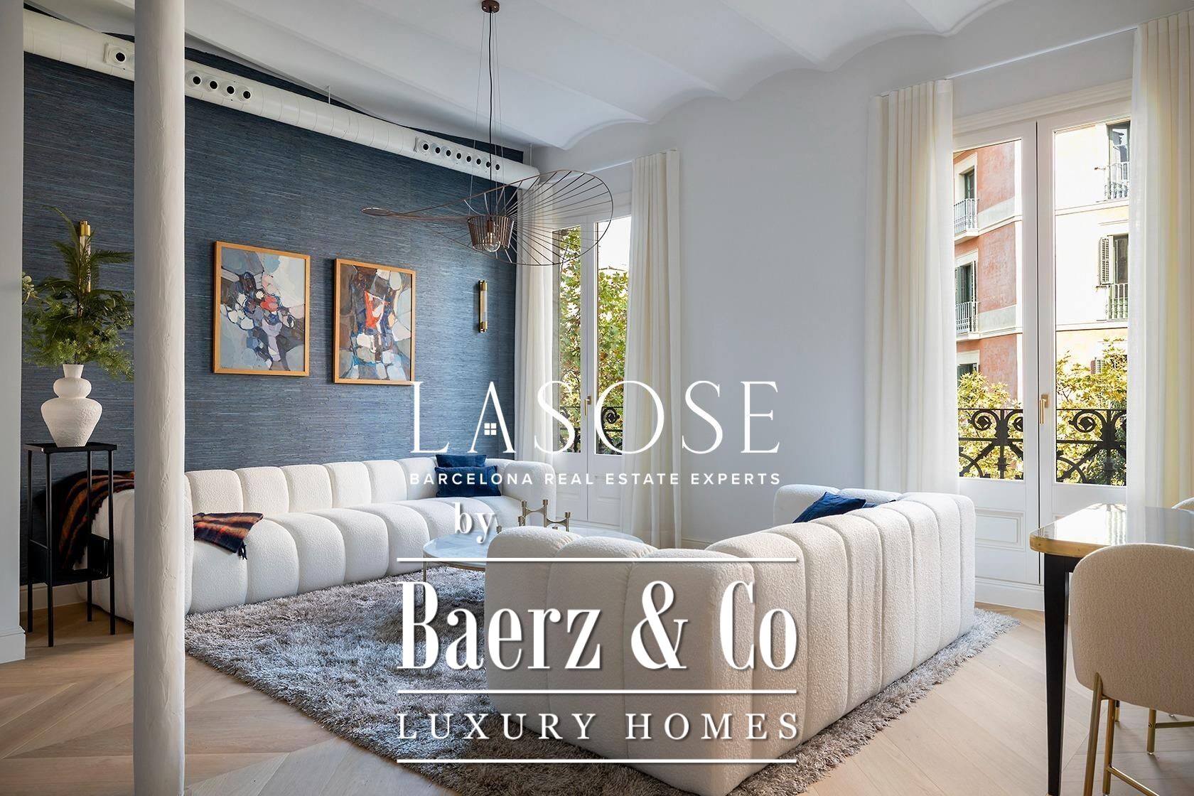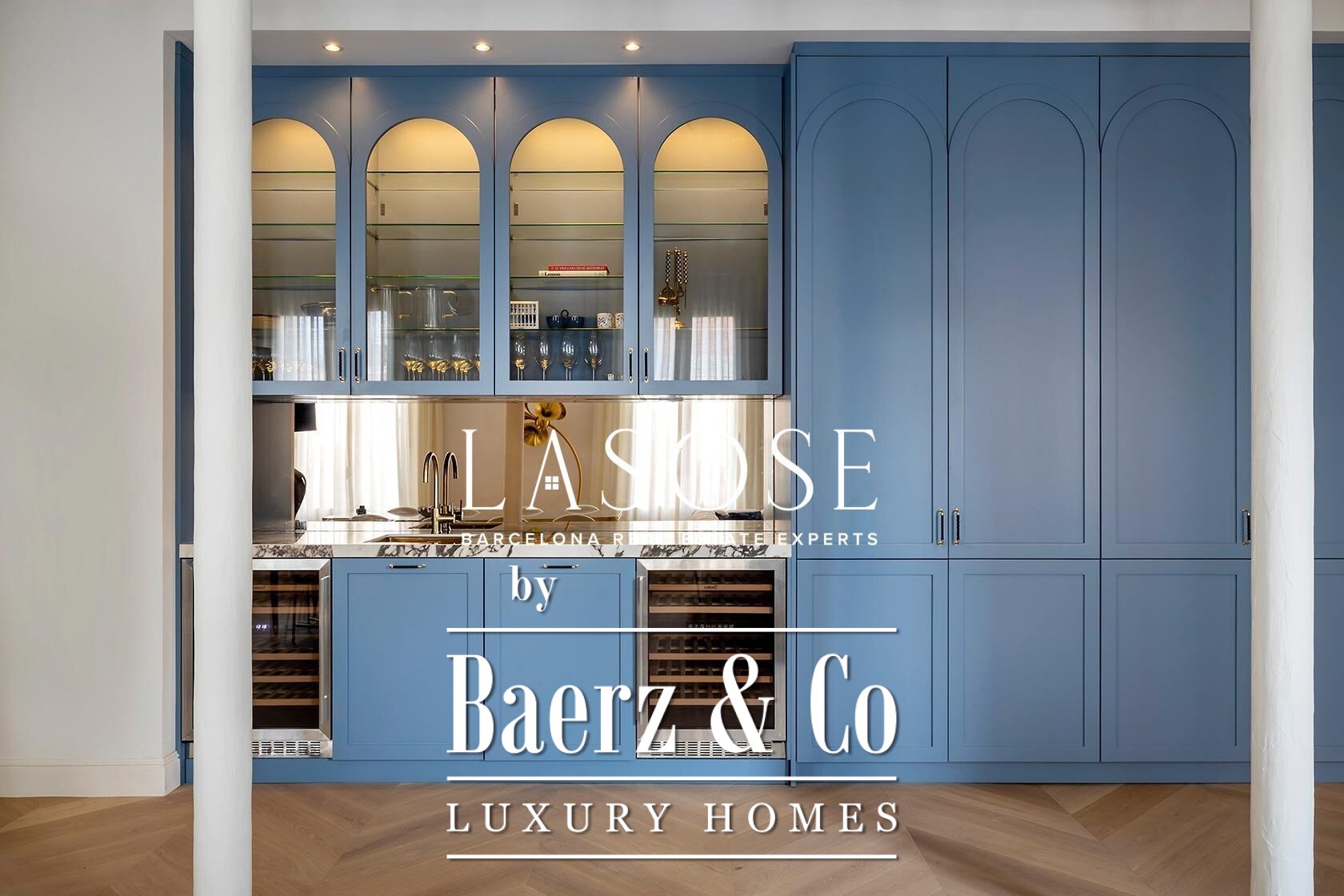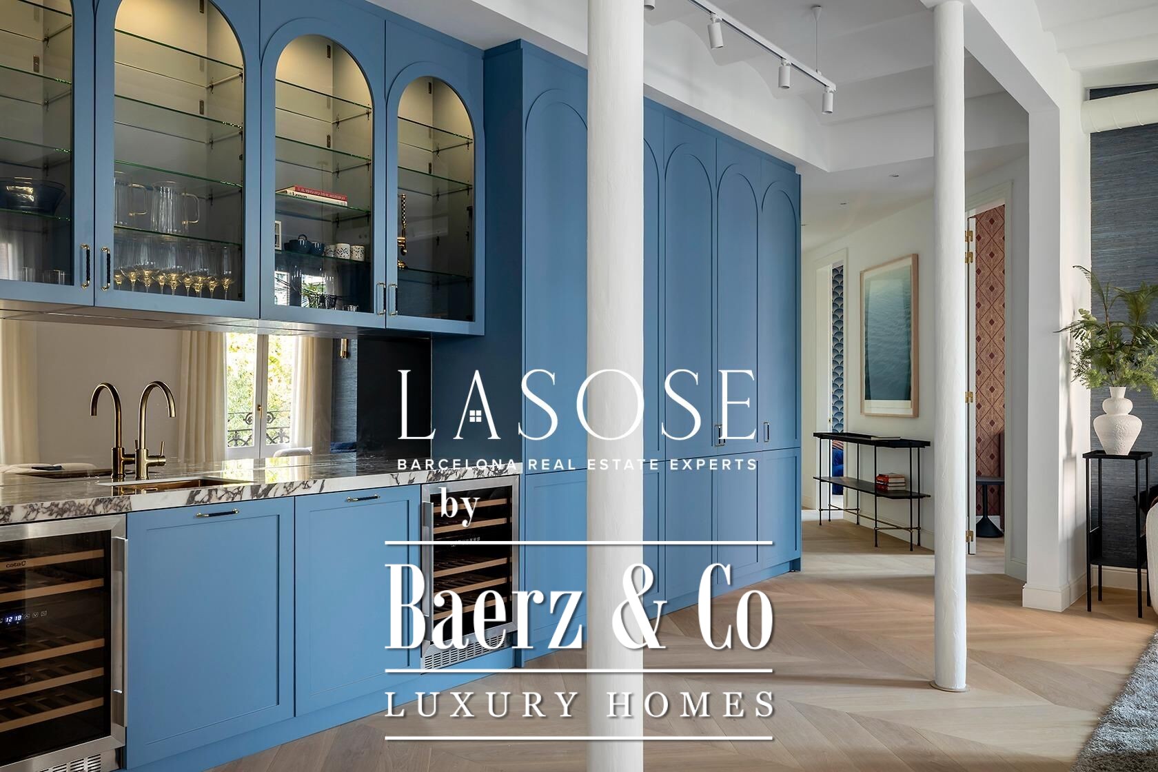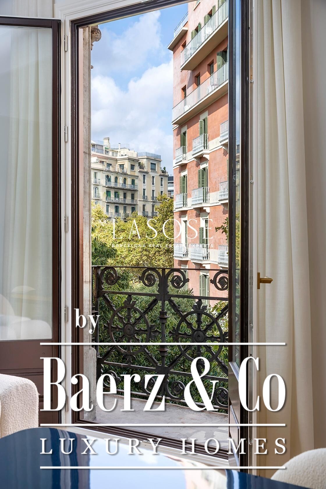 Apartment Barcelona stands as an invitation to refined urban living. This 199 m² residence on the third floor is newly renovated and thoughtfully designed to embrace natural light, with four balcony doors opening over Calle Girona and expansive windows enhancing the luminous atmosphere. The layout flows seamlessly from the open-plan kitchen and dining area to a living room anchored by a bespoke bar and pantry with two wine fridges and a second dishwasher.