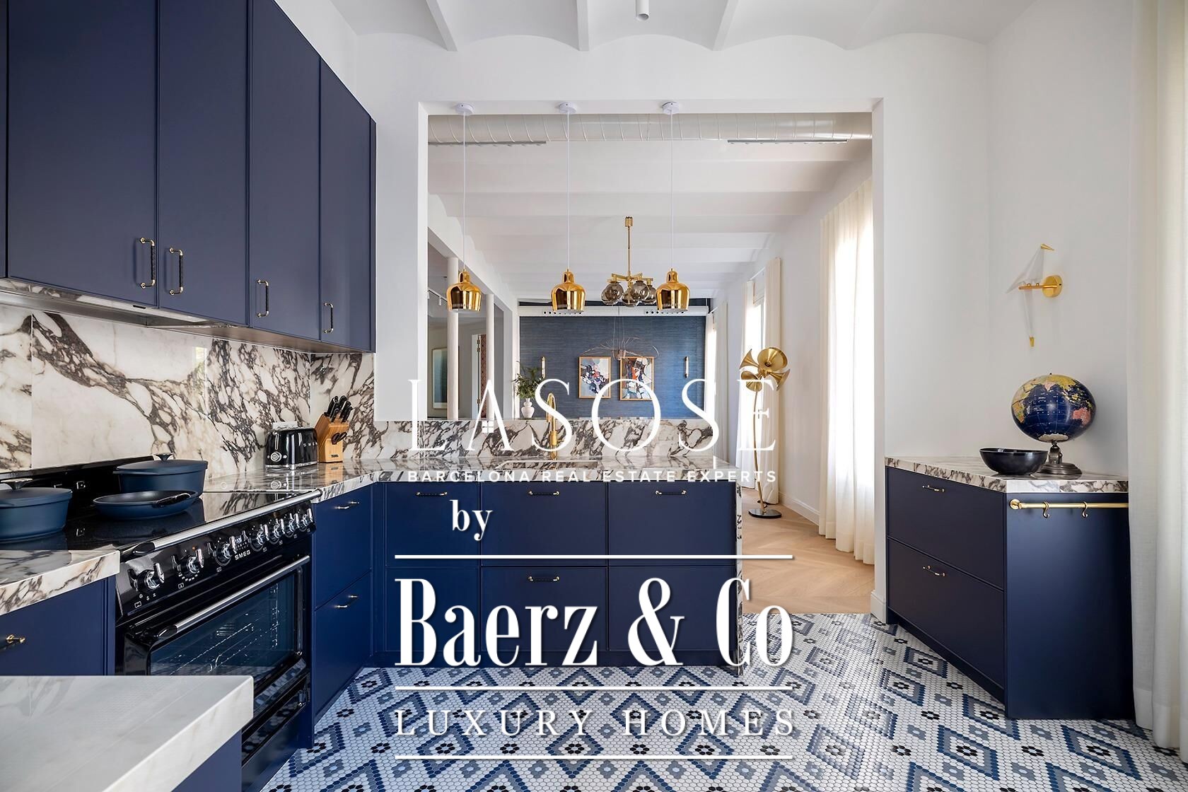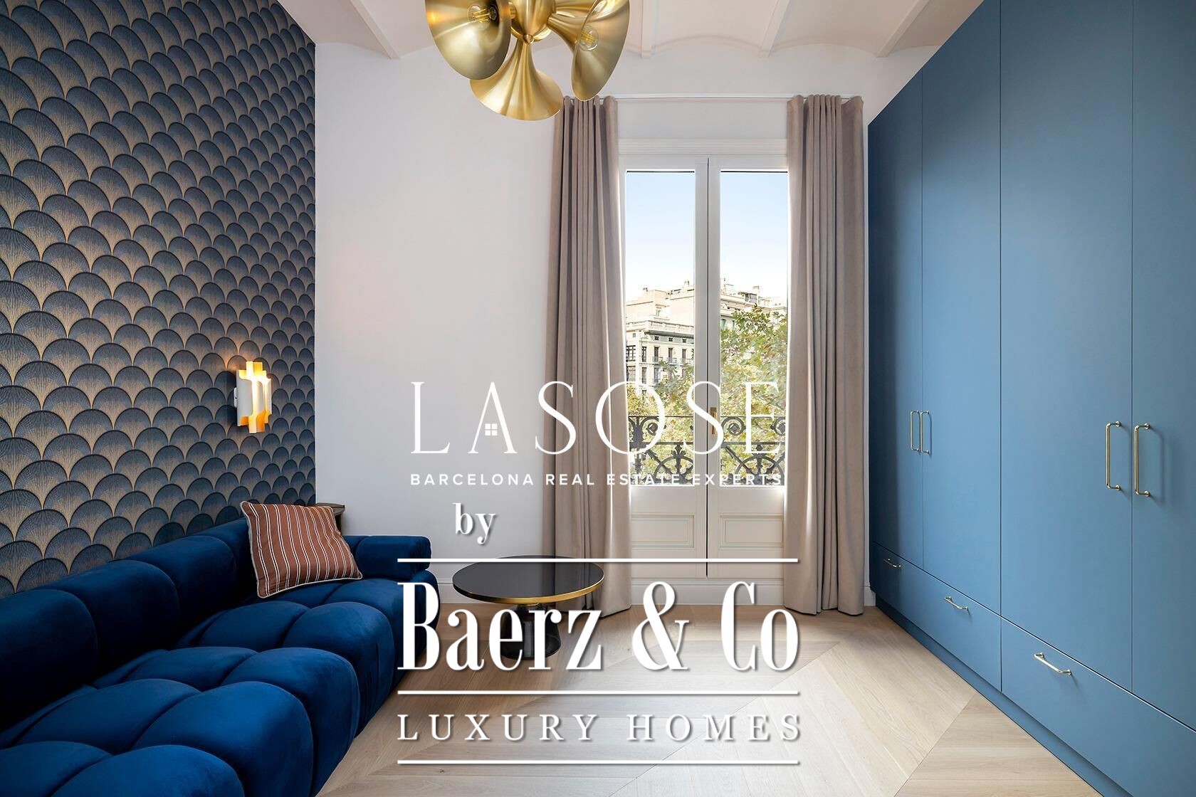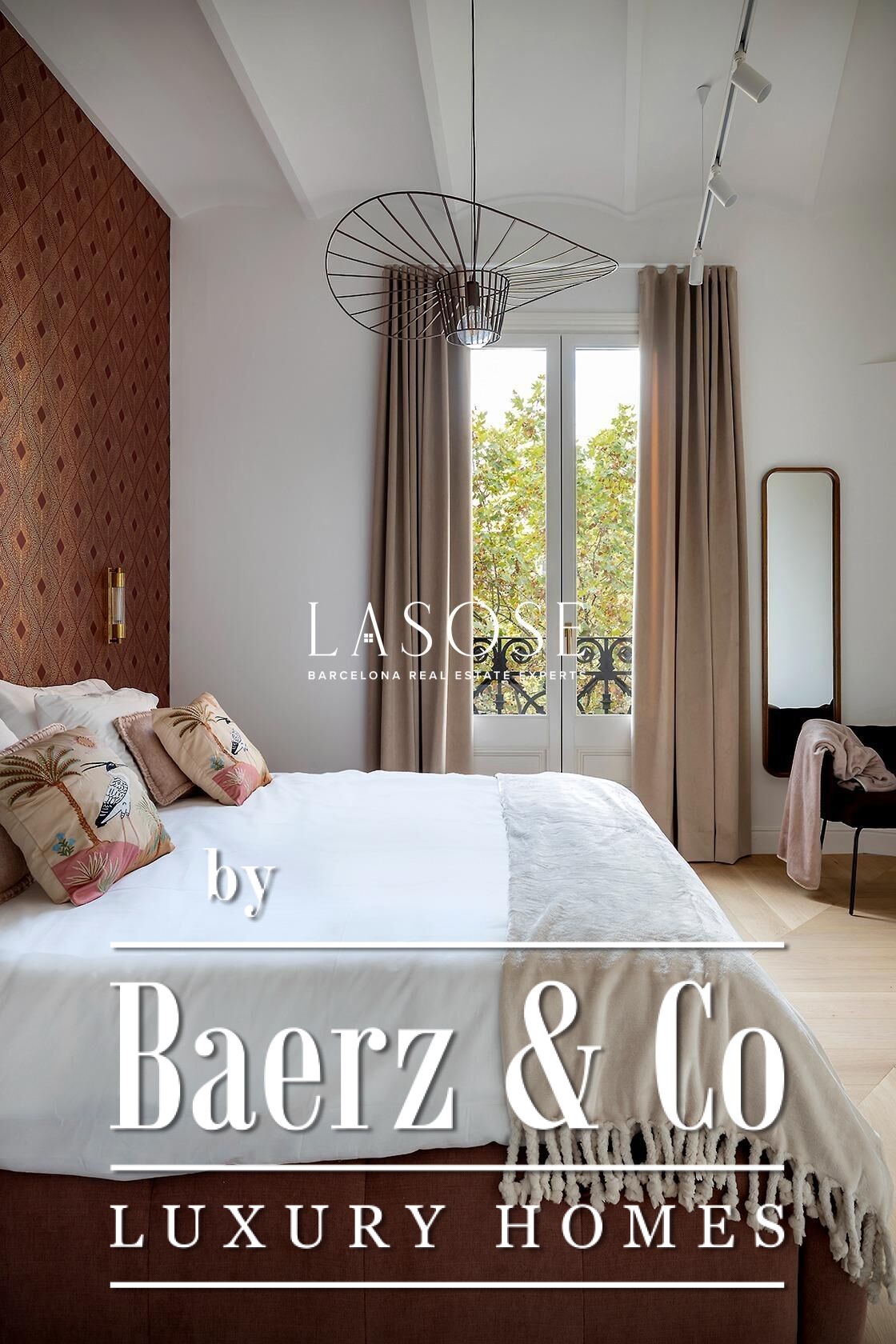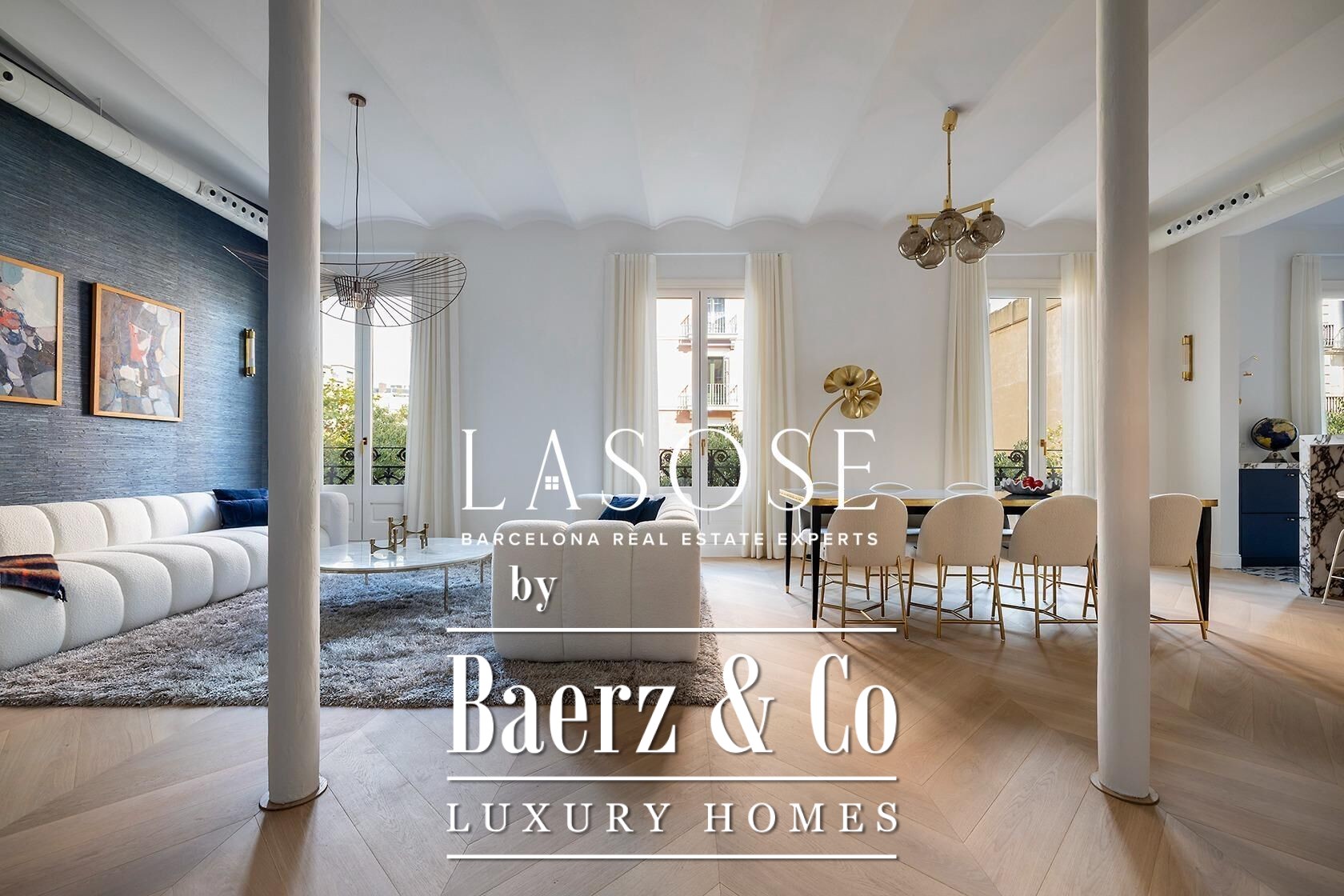Apartment Barcelona stands as an invitation to refined urban living. This 199 m² residence on the third floor is newly renovated and thoughtfully designed to embrace natural light, with four balcony doors opening over Calle Girona and expansive windows enhancing the luminous atmosphere. The layout flows seamlessly from the open-plan kitchen and dining area to a living room anchored by a bespoke bar and pantry with two wine fridges and a second dishwasher.