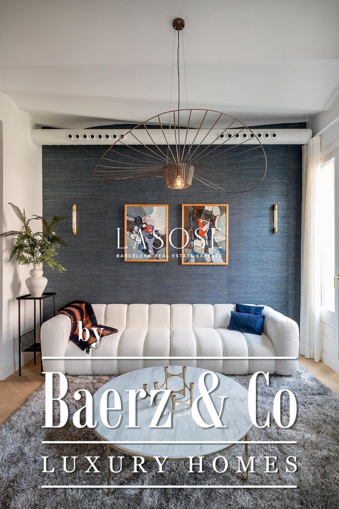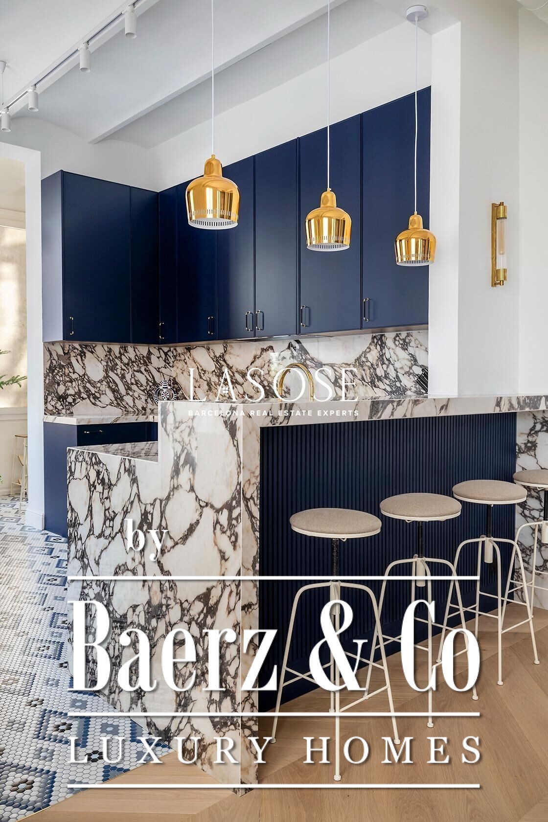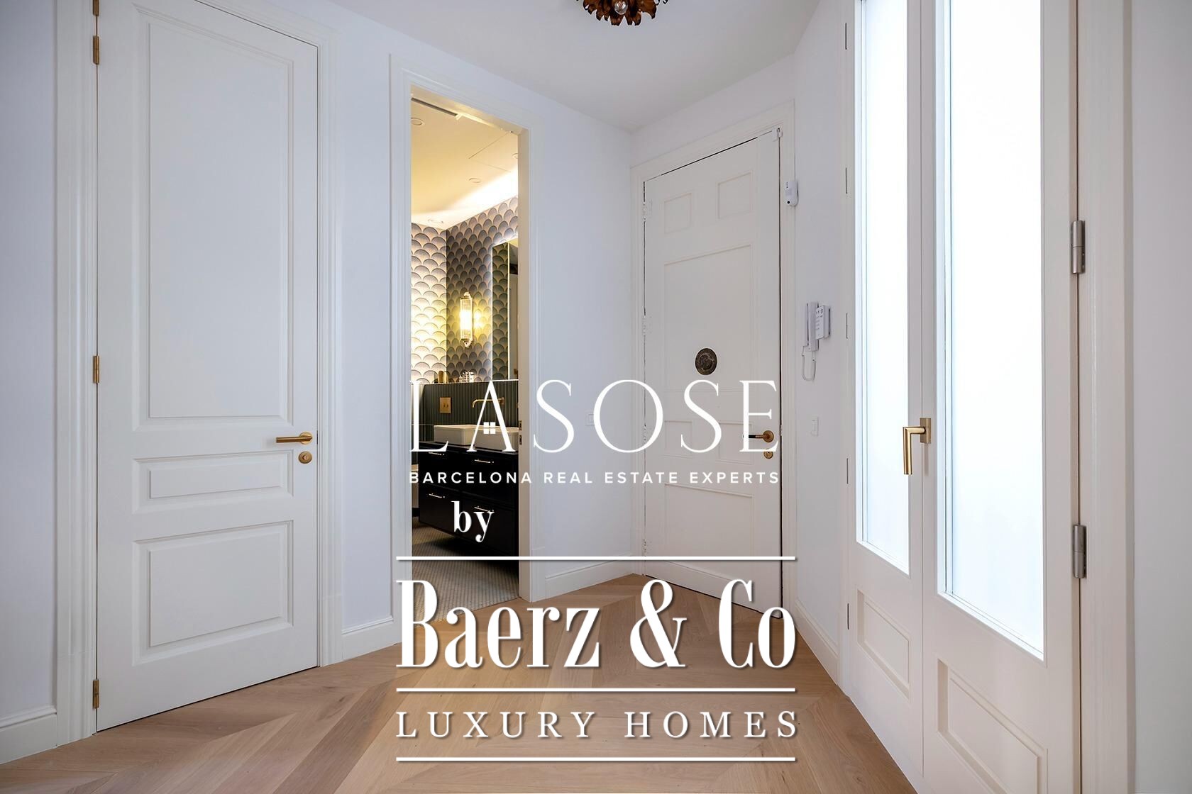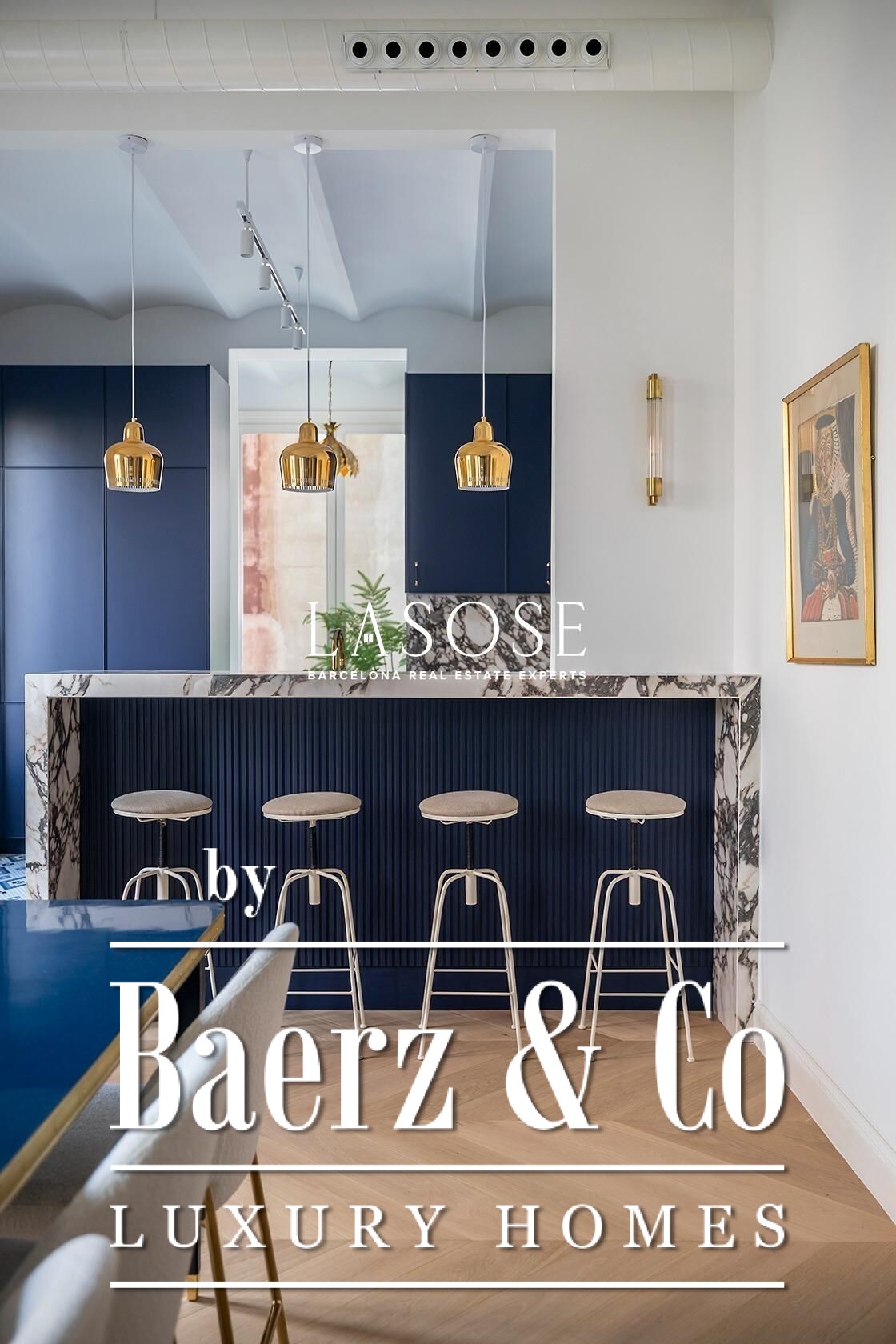 Apartment Barcelona stands as an invitation to refined urban living. This 199 m² residence on the third floor is newly renovated and thoughtfully designed to embrace natural light, with four balcony doors opening over Calle Girona and expansive windows enhancing the luminous atmosphere. The layout flows seamlessly from the open-plan kitchen and dining area to a living room anchored by a bespoke bar and pantry with two wine fridges and a second dishwasher.