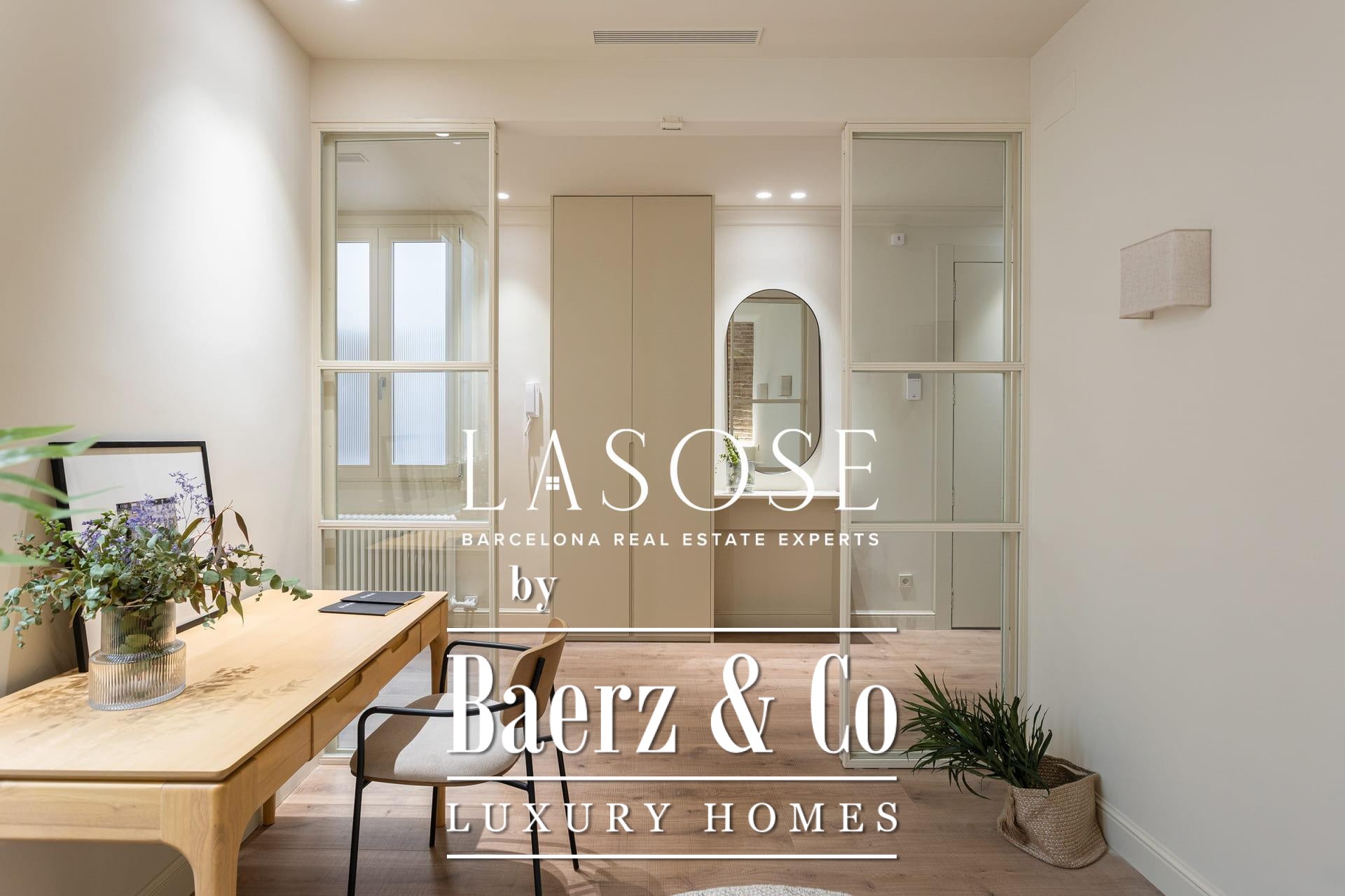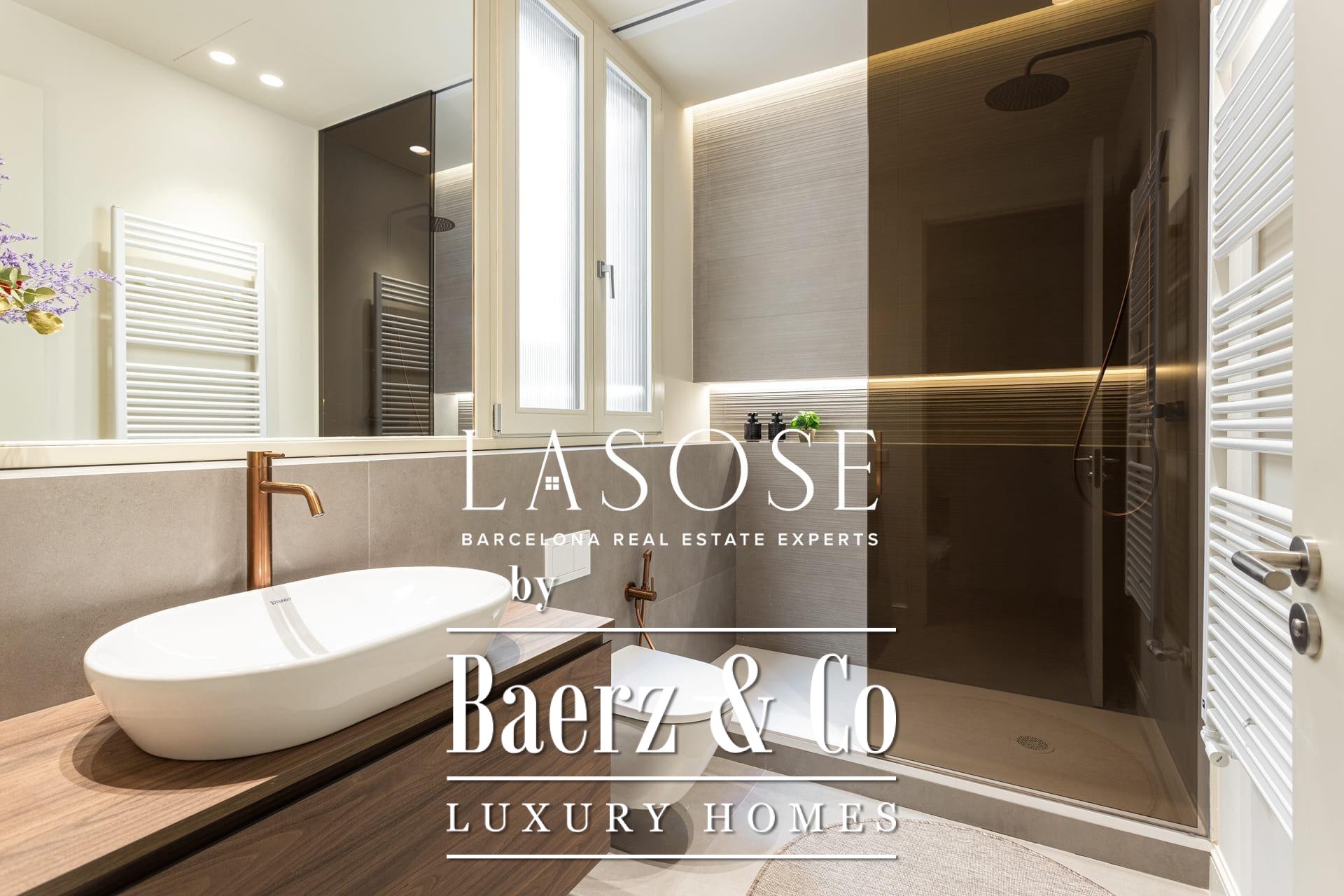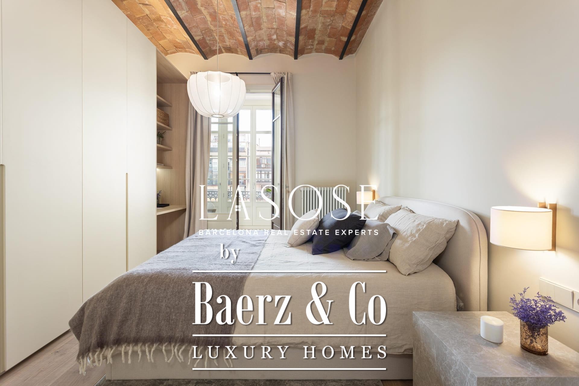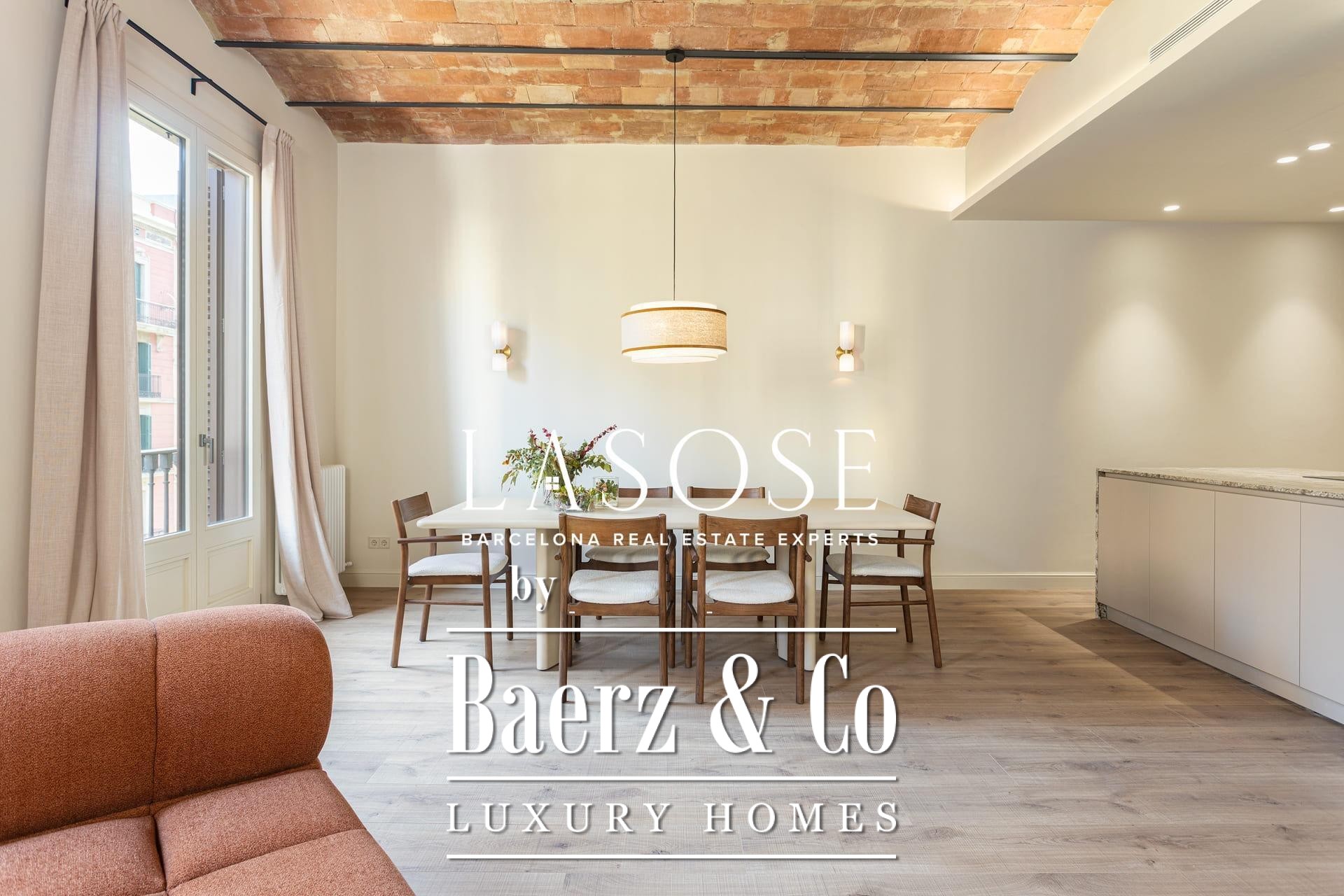 A curated renovation retains the dramatic Catalan vault ceilings and exposed brickwork, lending warmth, history, and authenticity rarely found on the market. The living and dining room blend effortlessly with the designer kitchen, centered around a substantial island, perfect for social gatherings and daily rituals. Two classic balconies bathe the space with east-facing morning light and overlook the stately Roger de Llúria street.