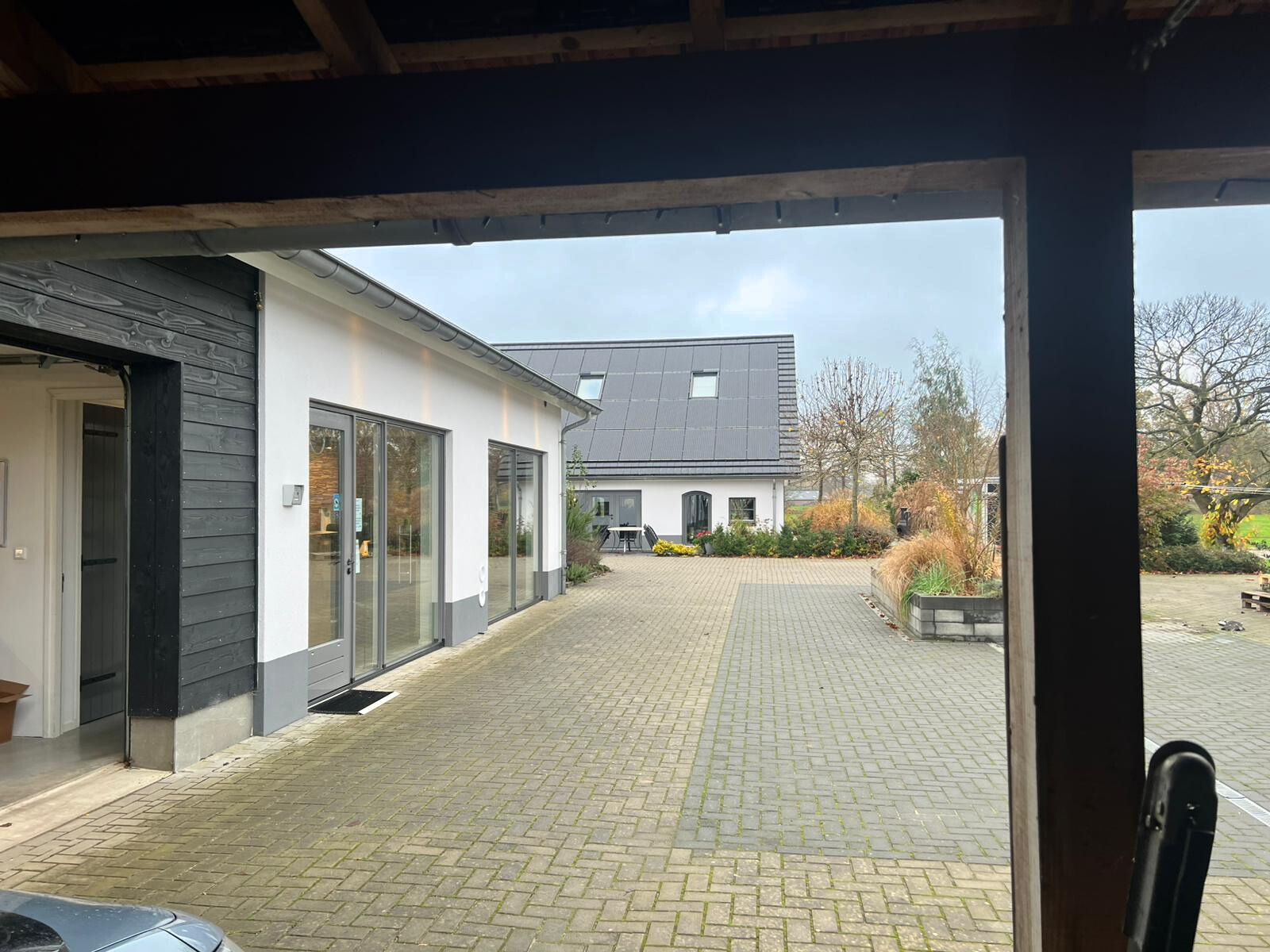 Adjacent to this is a carport/car shed (12 m by 5 m). In addition, the U-shape is filled with a double lockable garage (46 m²) and an adjoining second large storage/parking space (approx. 62 m²). The paved outdoor area provides parking space for at least six cars with a 22kW charging station (currently available to the public).